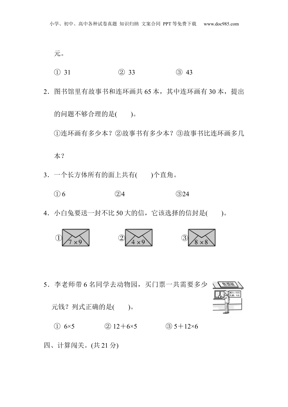 小学、初中、高中各种试卷真题知识归纳文案合同PPT等免费下载www.doc985.com模块过关卷(三)一、填一填。(每空2分,共34分)1.4个3相加的和,列乘法算式是();列加法算式是()。2.比48少19的数是多少,求这个数列式是();45比什么数少17,求这个数列式是()。3.一个星期有7天,12月份比四个星期多3天,12月份有()天。4.(1)聪聪想买一个皮球和一个笔袋,一共需要多少元钱,列式是();买5个皮球需要多少元钱,列式是()。(2)9×2表示()个()相加,在这道题中是求()。5.用4、5、6可以组成()个没有重复数字的两位数,其中最大的是(),最小的是()。6.游乐园国庆搞活动,1张门票可以换2瓶水,小王一家三口的门票能换()瓶水。小学、初中、高中各种试卷真题知识归纳文案合同PPT等免费下载www.doc985.com7.写一篇作文,红红用了50分钟,聪聪用了1时5分,()完成得快。8.每两个人握一次手,3个人要握()次手,()个人要握6次手。二、辨一辨。(对的画“√”,错的画“×”)(每题1分,共6分)1.求两个数相差多少,一定要用减法计算。()2.2个7相乘,列出的算式是2×7。()3.有3件不同的上衣,2条不同的裤子,一共有5种不同的穿法,列式是3+2=5(种)。()4.9个9比7个7多2个2。()5.不是所有的乘法口诀都能写出两道乘法算式。()6.积与两个因数都相等的乘法算式只有1×1=1。()三、选一选。(把正确答案的序号填在括号里)(每题1分,共5分)1.小明有相同张数的10元和1元人民币若干张,小明可能有()小学、初中、高中各种试卷真题知识归纳文案合同PPT等免费下载www.doc985.com元。①31②33③432.图书馆里有故事书和连环画共65本,其中连环画有30本,提出的问题不够合理的是()。①连环画有多少本?②故事书有多少本?③故事书比连环画多几本?3.一个长方体所有的面上共有()个直角。①6②4③244.小白兔要送一封不比50大的信,它该选择的信封是()。5.李老师带6名同学去动物园,买门票一共需要多少元钱?列式正确的是()。①6×5②12+6×5③5+12×6四、计算闯关。(共21分)小学、初中、高中各种试卷真题知识归纳文案合同PPT等免费下载www.doc985.com1.口算。(每题1分,共12分)6×3=5×2=3×4=4×6=16+8=30-6=35-19=19+21=6×7-9=8×9-42=9×1+40=5×7-6=2.列竖式计算。(每题3分,共9分)47+38=74-36=35+17-24=五、相信你会正确解决。(1题4分,其余每题6分,共34分)1.每张桌子可以坐6人,再来2人就坐满5张桌子了,请问来了几人?2.交通法规定,司机开车时不系安全带一次扣2分,累计扣分达到或超过12分就要被暂扣驾驶证。张妈妈被查出8次未系安全带(无小学、初中、高中各种试卷真题知识归纳文案合同PPT等免费下载www.doc985.com其他违规行为),她的驾驶证会被暂扣吗?3.为了纪念反法西斯胜利70周年,园林工人在小区绿化带内栽了8行白桦树,每行6棵,又栽了22棵梧桐树。一共栽了多少棵树?4.(1)如果一件上衣搭配一条裤子,共有多少种不同的搭配?请连一连。(2)妈妈带了60元钱买一套衣服,可以怎样买?5.(1)每支钢笔多少元钱?小学、初中、高中各种试卷真题知识归纳文案合同PPT等免费下载www.doc985.com(2)买9支钢笔和1个钟表,需要多少元钱?6.文具店的玩具货架区如图。妈妈买了一共花了多少元钱?小学、初中、高中各种试卷真题知识归纳文案合同PPT等免费下载www.doc985.com答案一、1.3×4=12(或4×3=12)3+3+3+3=122.48-19=2945+17=623.314.(1)6+7=13(元)5×6=30(元)或6×5=30(元)(2)92买9支笔需要多少元钱?5.665456.67.红红8.34二、1.√2.×3.×4.×5.√6.×[点拨]还有0×0=0。三、1.②2.①3.③4.②5.②四、1.1810122424241640333049292.853828(竖式略)五、1.5×6-2=28(人)答:来了28人。小学、初中、高中各种试卷真题知识归纳文案合同PPT等免费下载www.doc985.com2.8×2=16(分)16>12她的驾驶证会被暂扣。答:她的驾驶证会被暂扣。3.6×8+22=70(棵)答:一共栽了70棵树。4.(1)6种。(2)42+18=60(元)60=6042+38=80(元)80>6042+25=67(元)67>6033+18=51(元)51<6033+38=71(元)71>6033+25=58(元)58<60答:妈妈可以买42元的上衣...