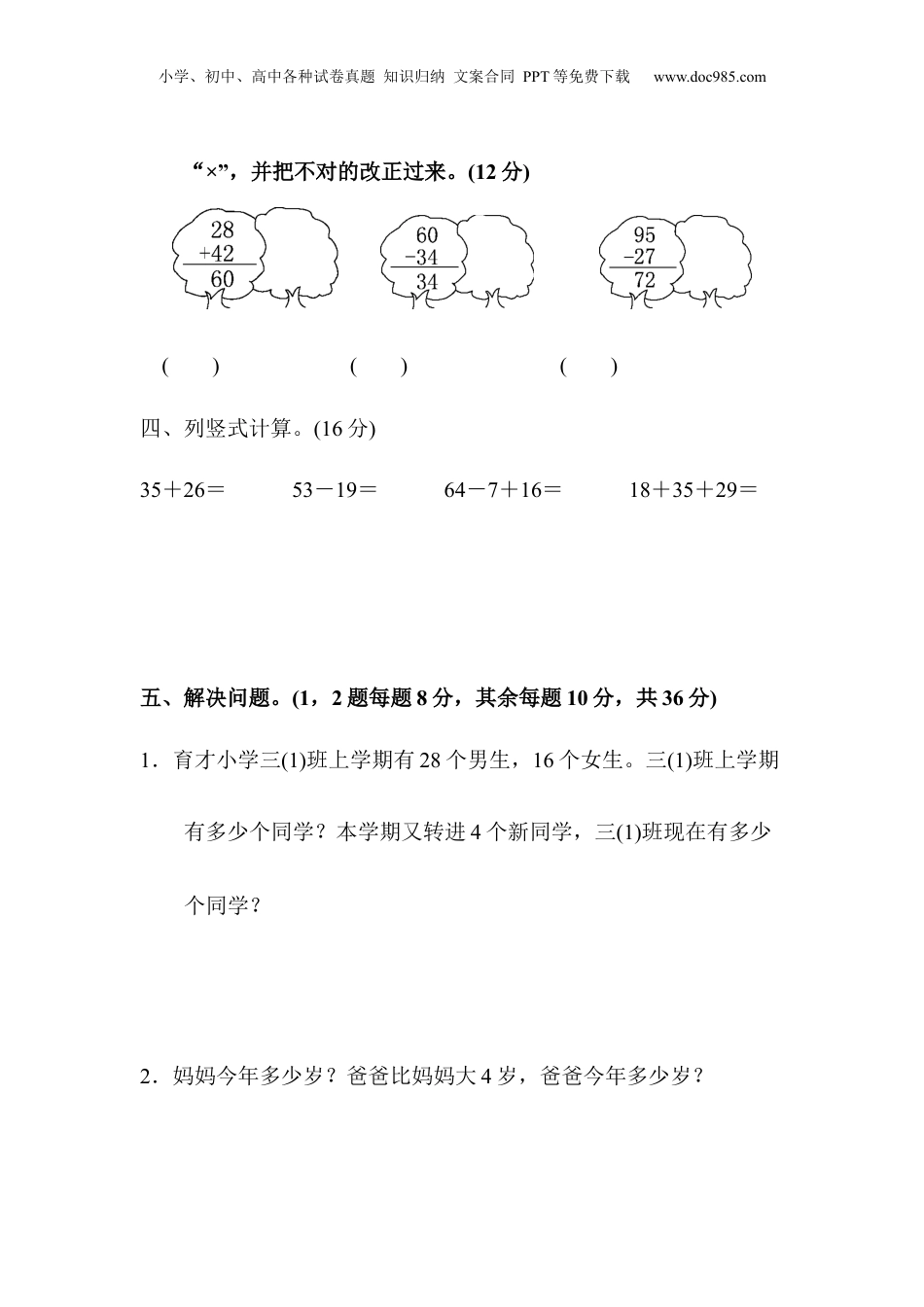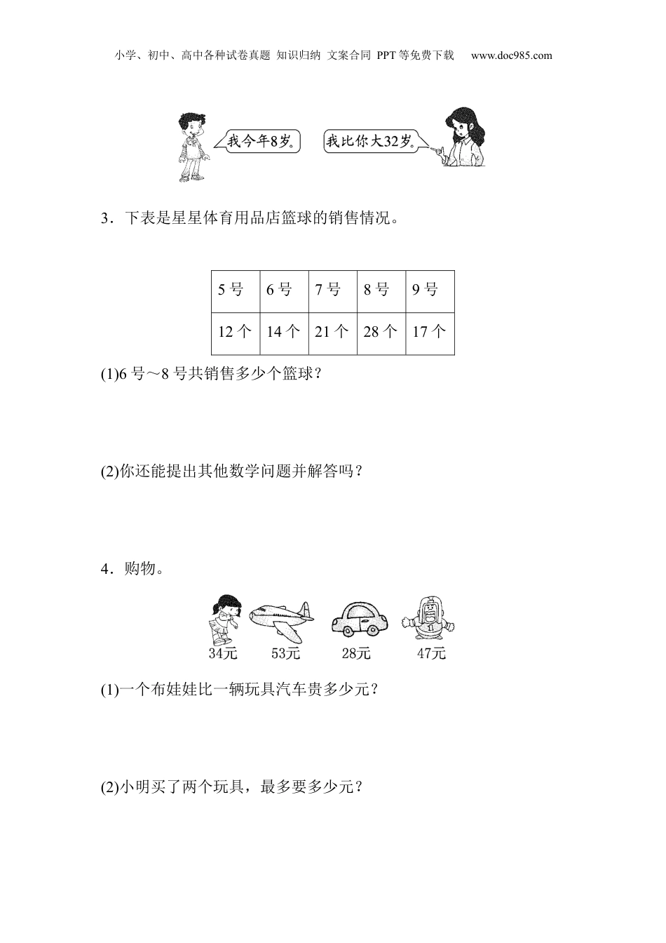 小学、初中、高中各种试卷真题知识归纳文案合同PPT等免费下载www.doc985.com教材过关卷(2)一、直接写出下面各题的得数。(12分)42+8=35-7=26+30=75-40=40+17=9+24=80-6=65-60=91-8=56-30=72+5=40+28=二、我会填。(每空2分,共24分)1.在里填上“>”“<”或“=”。5+3840+357+2186-548+770-2572-2025+272.每个体操队男、女队员得分的和、差各是多少?(单位:分)阳光队健美队青苗队舞动队男43542440女2791726和差三、下面的计算对吗?对的在括号内打“√”,不对的在括号内打小学、初中、高中各种试卷真题知识归纳文案合同PPT等免费下载www.doc985.com“×”,并把不对的改正过来。(12分)()()()四、列竖式计算。(16分)35+26=53-19=64-7+16=18+35+29=五、解决问题。(1,2题每题8分,其余每题10分,共36分)1.育才小学三(1)班上学期有28个男生,16个女生。三(1)班上学期有多少个同学?本学期又转进4个新同学,三(1)班现在有多少个同学?2.妈妈今年多少岁?爸爸比妈妈大4岁,爸爸今年多少岁?小学、初中、高中各种试卷真题知识归纳文案合同PPT等免费下载www.doc985.com3.下表是星星体育用品店篮球的销售情况。5号6号7号8号9号12个14个21个28个17个(1)6号~8号共销售多少个篮球?(2)你还能提出其他数学问题并解答吗?4.购物。(1)一个布娃娃比一辆玩具汽车贵多少元?(2)小明买了两个玩具,最多要多少元?小学、初中、高中各种试卷真题知识归纳文案合同PPT等免费下载www.doc985.com答案一、50285635573374583267768二、1.=<>=2.和依次为:70634166差依次为:1645714三、(×)(×)(×)四、61347382五、1.上学期:28+16=44(个)现在:44+4=48(个)2.妈妈:8+32=40(岁)爸爸:40+4=44(岁)3.(1)14+21+28=63(个)(2)(答案不唯一)7号~9号共销售多少个篮球?21+28+17=66(个)小学、初中、高中各种试卷真题知识归纳文案合同PPT等免费下载www.doc985.com4.(1)34-28=6(元)(2)53+47=100(元)