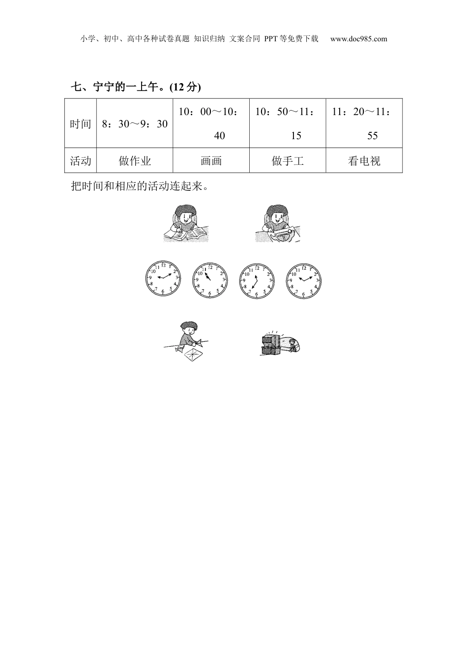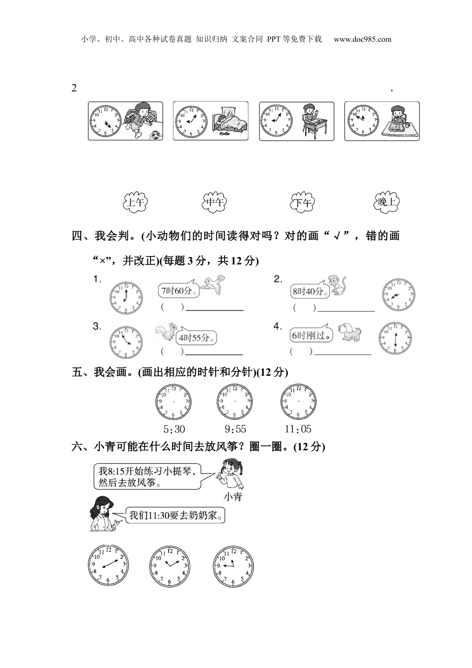 小学、初中、高中各种试卷真题知识归纳文案合同PPT等免费下载www.doc985.com教材过关卷(8)一、我会填。(每空1分,共10分)1.分针走1小格是()分,时针走1大格是()时,时针走1大格分针正好走1圈,是()分,因此1时=()分。2.分针从12走到5走了()分。分针从4走到8走了()分。3.时针从7走到10,走了()时,走一圈是()时。4.在()里填上“时”或“分”。爸爸每天工作8()。东东从家到学校走了20()。二、我会按要求写时间。(18分)三、我会连。(每题12分,共24分)1.森林举行长跑比赛,小动物们到达终点的时刻如下,请确定它们的名次。小学、初中、高中各种试卷真题知识归纳文案合同PPT等免费下载www.doc985.com2.四、我会判。(小动物们的时间读得对吗?对的画“√”,错的画“×”,并改正)(每题3分,共12分)五、我会画。(画出相应的时针和分针)(12分)六、小青可能在什么时间去放风筝?圈一圈。(12分)小学、初中、高中各种试卷真题知识归纳文案合同PPT等免费下载www.doc985.com七、宁宁的一上午。(12分)时间8:30~9:3010:00~10:4010:50~11:1511:20~11:55活动做作业画画做手工看电视把时间和相应的活动连起来。小学、初中、高中各种试卷真题知识归纳文案合同PPT等免费下载www.doc985.com答案一、1.1160602.25203.3124.时分二、9:306:058:2011:409时30分6时5分8时20分11时40分5:006:00三、1.2.四、1.×7时2.√3.×3时55分4.×12时30分小学、初中、高中各种试卷真题知识归纳文案合同PPT等免费下载www.doc985.com五、六、圈第2个钟表。七、