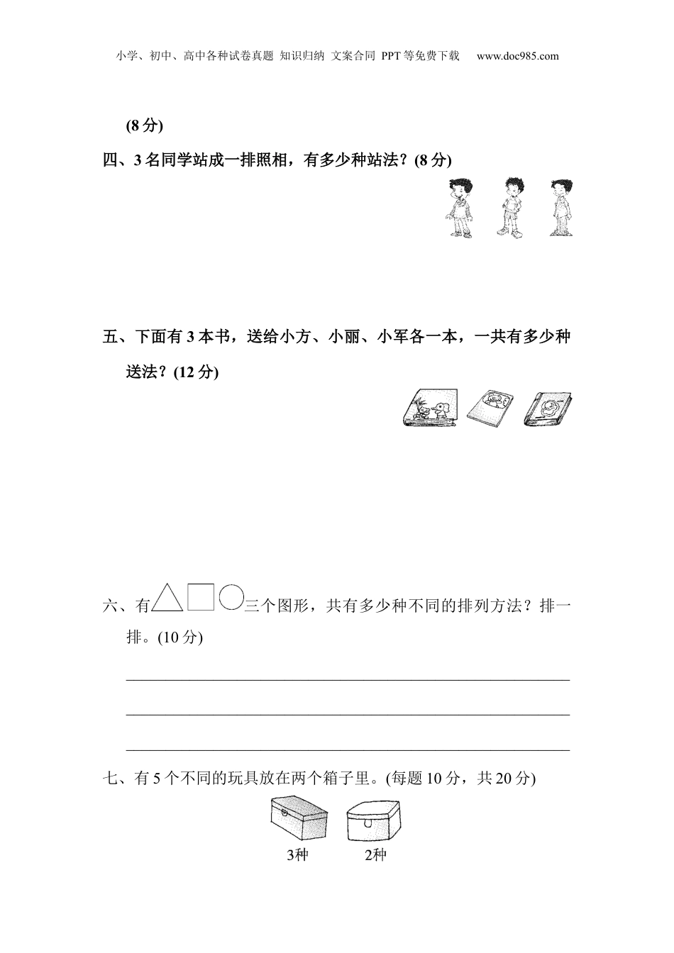 小学、初中、高中各种试卷真题知识归纳文案合同PPT等免费下载www.doc985.com教材过关卷(7)一、我会填。(每题4分,共24分)1.用下面三张卡片能摆成()个不同的两位数。2.用下面三张卡片能摆成()个不同的两位数。3.用下面四张卡片能摆成()个不同的两位数。4.用下面的三个数字任选2个求积,有()种可能。5.明明选一套衣服,共有()种选法。6.每两人通一次电话,一共要通()次电话。二、用红、黄、蓝、绿四种颜色给每组中的两个涂上不同的颜色,一共有()种涂色方法。(9分)三、有3个数2、5、7,任意选取其中2个数求差,得数有几种可能?小学、初中、高中各种试卷真题知识归纳文案合同PPT等免费下载www.doc985.com(8分)四、3名同学站成一排照相,有多少种站法?(8分)五、下面有3本书,送给小方、小丽、小军各一本,一共有多少种送法?(12分)六、有三个图形,共有多少种不同的排列方法?排一排。(10分)________________________________________________________________________________________________________________________________________________________________________七、有5个不同的玩具放在两个箱子里。(每题10分,共20分)小学、初中、高中各种试卷真题知识归纳文案合同PPT等免费下载www.doc985.com1.笑笑想取出其中的一个,有多少种不同的取法?2.文文想从每个箱子里各取一个,有多少种不同的取法?八、用下面的人民币可以表示出多少种不同的币值?(9分)小学、初中、高中各种试卷真题知识归纳文案合同PPT等免费下载www.doc985.com答案一、1.62.43.124.35.66.3二、12涂色略。三、3种。[点拨]7-2=5,7-5=2,5-2=3。四、6种。五、6种。六、6种。排法略。七、1.5种。2.6种。八、7种。[点拨]分别是1角,2角,5角,3角,6角,7角,8角。