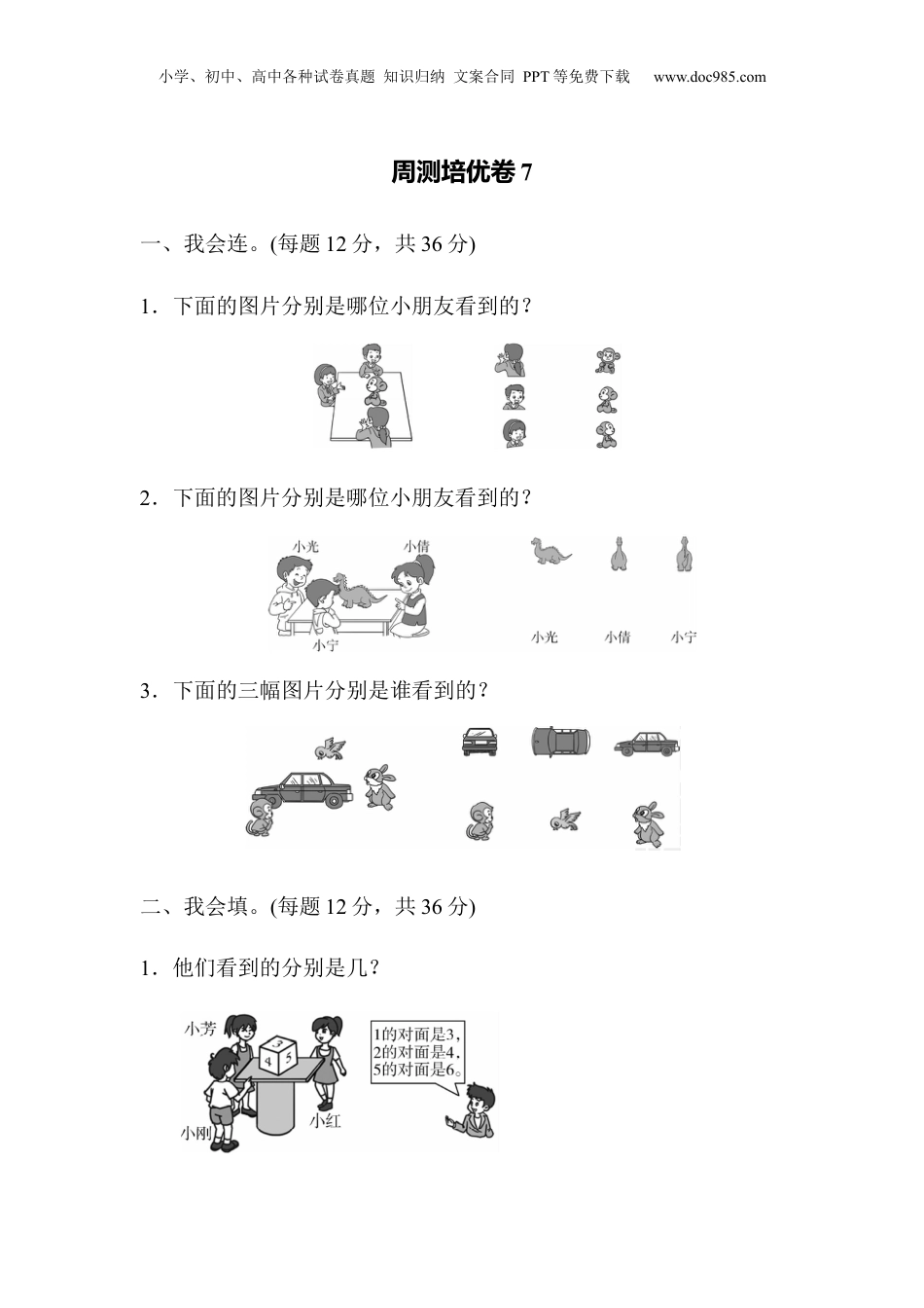 小学、初中、高中各种试卷真题知识归纳文案合同PPT等免费下载www.doc985.com周测培优卷7一、我会连。(每题12分,共36分)1.下面的图片分别是哪位小朋友看到的?2.下面的图片分别是哪位小朋友看到的?3.下面的三幅图片分别是谁看到的?二、我会填。(每题12分,共36分)1.他们看到的分别是几?小学、初中、高中各种试卷真题知识归纳文案合同PPT等免费下载www.doc985.com2.下面这些照片分别是谁拍到的?3.他们分别是在哪看到的?在括号里填出他们的名字。三、选一选。(每题7分,共28分)1.从右面看到的是()。2.下面的图从右面看到的图形是()。小学、初中、高中各种试卷真题知识归纳文案合同PPT等免费下载www.doc985.com3.左边的图片是()看到的。4.从不同方向观察下面的物体,看到的形状都是一样的是()。小学、初中、高中各种试卷真题知识归纳文案合同PPT等免费下载www.doc985.com答案一、1.2.3.二、1.6422.小红小丽小华3.上—小聪下—小军左—小东右—小亮三、1.①2.①3.③4.③小学、初中、高中各种试卷真题知识归纳文案合同PPT等免费下载www.doc985.com