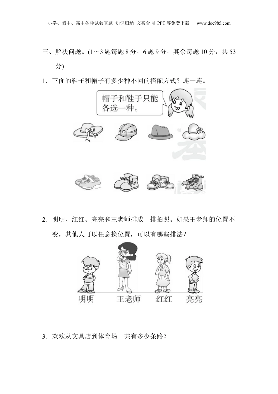 小学、初中、高中各种试卷真题知识归纳文案合同PPT等免费下载www.doc985.com期末归类卷(3)一、填空题。(每题4分,共28分)1.用0、1、3、5可组成()个没有重复数字的两位数。2.用4、7、9组成的没有重复数字的两位数有()个。3.用4、3、0、9组成没有重复数字且个位是单数的两位数有()个。4.四个好朋友聚会,如果每两人合1张影,一共需要合()张影。5.数一数,下面图中共有()条线段。6.有6个人参加乒乓球小组赛,如果每2个人比赛1场,一共要比赛()场。7.今天学校的早餐有3种粥,4种主食。乐乐从粥和主食中各选一种搭配自己的早餐,一共有()种不同的搭配方法。二、下面是调查三年级学生最喜欢看的动画片情况(每人只能选一种)。(1题5分,其余每空2分,共19分)搞笑类性别男生女生人数188科幻类性别男生女生小学、初中、高中各种试卷真题知识归纳文案合同PPT等免费下载www.doc985.com人数358情感类性别男生女生人数2118激战类性别男生女生人数28201.把这些表格合并成复式统计表。2.三年级同学最喜欢()类动画片的人数最多,最喜欢()类动画片的人数最少。3.男生最喜欢()类动画片的人数最多,女生最喜欢()类动画片的人数最多。4.三年级一共有()人,女生()人,男生()人。小学、初中、高中各种试卷真题知识归纳文案合同PPT等免费下载www.doc985.com三、解决问题。(1~3题每题8分,6题9分,其余每题10分,共53分)1.下面的鞋子和帽子有多少种不同的搭配方式?连一连。2.明明、红红、亮亮和王老师排成一排拍照。如果王老师的位置不变,其他人可以任意换位置,可以有哪些排法?3.欢欢从文具店到体育场一共有多少条路?小学、初中、高中各种试卷真题知识归纳文案合同PPT等免费下载www.doc985.com4.按下面的要求,用6、0、7、8这几个数字写出没有重复数字的小数。(1)小于1而小数部分是三位的小数。(2)大于8而小数部分是三位的小数。5.下面是三年级两个班的同学最喜欢的体育活动的人数统计表。(1)这些项目中哪种最受同学欢迎?是多少人?小学、初中、高中各种试卷真题知识归纳文案合同PPT等免费下载www.doc985.com(2)两个班的同学最喜欢跳绳的比最喜欢乒乓球的多几人?6.请你设计一个复式统计表把下面的信息表示出来。小学、初中、高中各种试卷真题知识归纳文案合同PPT等免费下载www.doc985.com答案一、1.92.63.44.65.106.157.12二、1.2.激战搞笑3.科幻激战4.15654102三、1.16种。2.6种。明明王老师亮亮红红明明王老师红红亮亮红红王老师亮亮明明小学、初中、高中各种试卷真题知识归纳文案合同PPT等免费下载www.doc985.com红红王老师明明亮亮亮亮王老师红红明明亮亮王老师明明红红3.一共有12条路。4.(1)0.6780.6870.7680.7860.8760.867(2)8.0768.0678.7068.7608.6708.6075.(1)跳绳20+15=35(人)(2)(20+15)-(15+10)=10(人)6.