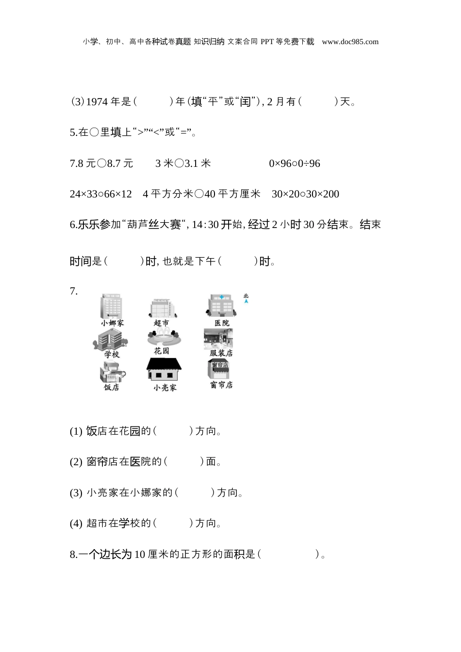小、初中、高中各卷知文案合同学种试真题识归纳PPT等免下费载www.doc985.com期末卷检测2(时间:90分分钟满:100分)一、我。会填(28分)1.在括里上适的位。号填当单(1)一的面大是张报纸积约600()。(2)一操的占地面是个场积7000()。(3)明明着操一圈大是围场跑约200()。(4)室的面是教积48()。2.在方形框里出合适的小。长写数3.575÷5的商是()位数;要使□35÷5的商是位两数,□可填()。(把所有的可能都出写来)。4.者家象中心悉记从国气获,自2016年3月21日入汛以来,至6月7日,全平均降水量国为178.6毫米,为1974年以史同期最多。来历(1)自3月21日入汛以来,至6月7日,历时()天。(2)出中的小读题数:()。小、初中、高中各卷知文案合同学种试真题识归纳PPT等免下费载www.doc985.com(3)1974年是()年(“平”或“”填闰),2月有()天。5.在○里上“填>”“<”或“=”。7.8元○8.7元3米○3.1米0×96○0÷9624×33○66×124平方分米○40平方厘米30×20○30×2006.加“葫芦大“乐乐参丝赛,14:30始开,经过2小时30分束。束结结是时间()时,也就是下午()。时7.(1)店在花的饭园()方向。(2)窗店在院的帘医()面。(3)小亮家在小娜家的()方向。(4)超市在校的学()方向。8.一个边长为10厘米的正方形的面是积()。小、初中、高中各卷知文案合同学种试真题识归纳PPT等免下费载www.doc985.com二、我判。会断(10分)1.□□□÷2的商一定是三位小。数()2.爸爸6月31日出差。()3.1平方米比1米大。()4.位乘位两数两数,如果每的末位都有个数没0,的末位一定有积没0。()5.周相等的方形的面比正方形的面大。长长积积()小、初中、高中各卷知文案合同学种试真题识归纳PPT等免下费载www.doc985.com三、我。会选择(8分)1.下中的涂色部分能用图0.3表示的是()。2.家大力倡低出行。自行家到位要用国导碳妈妈骑车从单40分钟,她8到位打卡时单,最迟()家出。从发A.7:40B.7:20C.8:003.四名同互相握手学,每人握一次两,一共握手()次。A.8B.6C.44.在妈妈2016年1月3日了一盒酸奶买,保期是质21天,生日期是产2015年12月15日,盒酸奶这()。A.能喝B.不能喝C.无法判是否能喝断四、我算。会计(17分)1.直接出得。写数(6分)800÷4=3500÷7=50×60=0.3+0.7=0.8-0.4=320÷4=小、初中、高中各卷知文案合同学种试真题识归纳PPT等免下费载www.doc985.com2.列式算竖计,带☆的要算。验(算验2分,共11分)☆483÷5=25×48=20-5.4=五、下面是三(3)班全班生的身高情表。学况统计(10分)三(3)班全班生身高情表学况统计身高(厘米)人性数别140以下140~145146~149150~155155以上男生315424女生2105351.男生身高在()厘米范的人最多围内数,女生身高在()厘米范的人最少。围内数2.三(3)班一共有女生多少人?六、解。决问题(27分)小、初中、高中各卷知文案合同学种试真题识归纳PPT等免下费载www.doc985.com1.些小朋友一共分多少干这块饼?(9分)2.友广有一谊场个边长8米的正方形地场,打算用面积8平方分米的彩地砖铺,一共需要多少的彩块这样砖?(9分)3.本一共多少元这两书?(9分)小、初中、高中各卷知文案合同学种试真题识归纳PPT等免下费载www.doc985.com考答案:参一、1.(1)平方厘米(2)平方米(3)米(4)平方米2.0.31.62.94.363.三4、3、2、14.(1)79(2)一百七十八点六(3)平285.<<==><6.1757.(1)西南(2)南(3)南东(4)北东8.100平方厘米二、1.✕2.✕3.✕4.✕5.✕三、1.C2.B3.B4.A四、1.200500300010.4802.☆483÷5=96……325×48=120020-5.4=14.6五、1.140~145140以下2.2+10+5+3+5=25(人)答:三(3)班一共有女生25人。小、初中、高中各卷知文案合同学种试真题识归纳PPT等免下费载www.doc985.com六、1.24×5×4=480(块)答:些小朋友一共分这480干。块饼2.8米=80分米80×80÷8=800(块)答:一共需要800的彩。块这样砖3.13.6+20.5=34.1(元)答:本一共这两书34.1元。