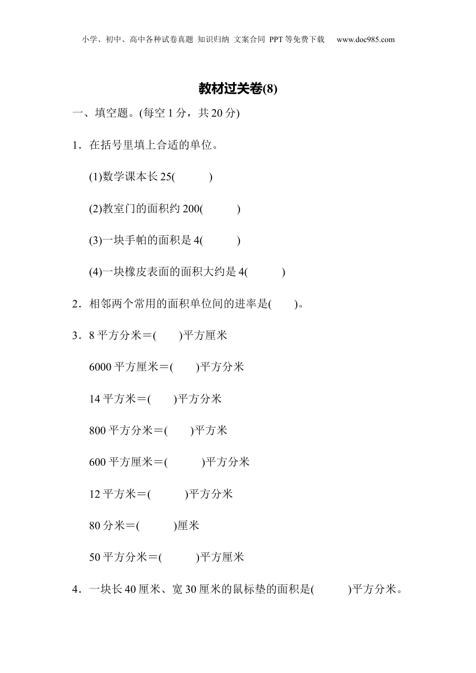 小学、初中、高中各种试卷真题知识归纳文案合同PPT等免费下载www.doc985.com教材过关卷(8)一、填空题。(每空1分,共20分)1.在括号里填上合适的单位。(1)数学课本长25()(2)教室门的面积约200()(3)一块手帕的面积是4()(4)一块橡皮表面的面积大约是4()2.相邻两个常用的面积单位间的进率是()。3.8平方分米=()平方厘米6000平方厘米=()平方分米14平方米=()平方分米800平方分米=()平方米600平方厘米=()平方分米12平方米=()平方分米80分米=()厘米50平方分米=()平方厘米4.一块长40厘米、宽30厘米的鼠标垫的面积是()平方分米。小学、初中、高中各种试卷真题知识归纳文案合同PPT等免费下载www.doc985.com5.下面的图形的面积各是几个?6.把3000平方厘米、20平方分米、9平方米、20平方米按从小到大的顺序排列是()<()<()<()。二、判断题。(每题2分,共10分)1.周长相等的两个正方形,面积也一定相等。()2.边长是100厘米的正方形的面积是1平方米。()3.用6个相同的正方形拼成一个长方形,只有一种拼法。()4.1平方米和1米一样大。()5.一台液晶电视机屏幕的面积大约是15平方米。()三、选择题。(每题2分,共8分)1.一张信纸的面积是500()。A.平方米B.平方分米C.平方厘米小学、初中、高中各种试卷真题知识归纳文案合同PPT等免费下载www.doc985.com2.一个正方形的边长扩大为原来的3倍,它的面积就扩大为原来的()。A.3倍B.6倍C.9倍3.如右图,正方形被分成甲、乙两部分,下面说法正确的是()。A.甲与乙的面积、周长都相等B.甲与乙的面积相等C.甲与乙的周长相等4.用4个面积是1平方厘米的小正方形拼成的大正方形的周长是()。A.4平方厘米B.8厘米C.4厘米四、计算下面各图形的周长和面积。(每题8分,共24分)1.2.小学、初中、高中各种试卷真题知识归纳文案合同PPT等免费下载www.doc985.com3.五、解决问题。(1~3题每题6分,其余每题10分,共38分)1.妈妈买回一块长方形花布,从上面剪下一块最大的正方形花布,剩下部分的面积是多少平方分米?2.一块边长为2米的正方形花布,用它来做面积是4平方分米的手帕,最多可以做多少块?3.教室前面的长方形墙壁长为9米,宽为3米,墙上有三扇窗户,每扇窗户的面积为3平方米,现在要粉刷这面墙壁,要粉刷的面积是多少平方米?如果每平方米要花工钱12元,那么粉刷完这面小学、初中、高中各种试卷真题知识归纳文案合同PPT等免费下载www.doc985.com墙壁的工钱是多少元?4.用6个边长是2厘米的正方形拼成一个长方形,拼成的长方形的周长和面积各是多少?5.用两根同样长的铁丝围成一个长方形和一个正方形,长方形的长是8米,宽是6米,正方形的面积是多少平方米?小学、初中、高中各种试卷真题知识归纳文案合同PPT等免费下载www.doc985.com答案一、1.(1)厘米(2)平方分米(3)平方分米(4)平方厘米2.1003.80060140086120080050004.125.12126.20平方分米3000平方厘米9平方米20平方米二、1.√2.√3.×4.×5.×三、1.C2.C3.C4.B四、1.周长:(35+19)×2=108(厘米)面积:35×19=665(平方厘米)2.周长:26×4=104(分米)面积:26×26=676(平方分米)3.周长:(10+4+4)×2=36(米)面积:10×(4+4)-4×6=56(平方米)五、1.26×15-15×15=165(平方分米)小学、初中、高中各种试卷真题知识归纳文案合同PPT等免费下载www.doc985.com2.2×2=4(平方米)=400平方分米400÷4=100(块)3.3×9-3×3=18(平方米)18×12=216(元)4.①周长:(2+12)×2=28(厘米)面积:2×12=24(平方厘米)②周长:(6+4)×2=20(厘米)面积:6×4=24(平方厘米)5.(8+6)×2=28(米)28÷4=7(米)7×7=49(平方米)