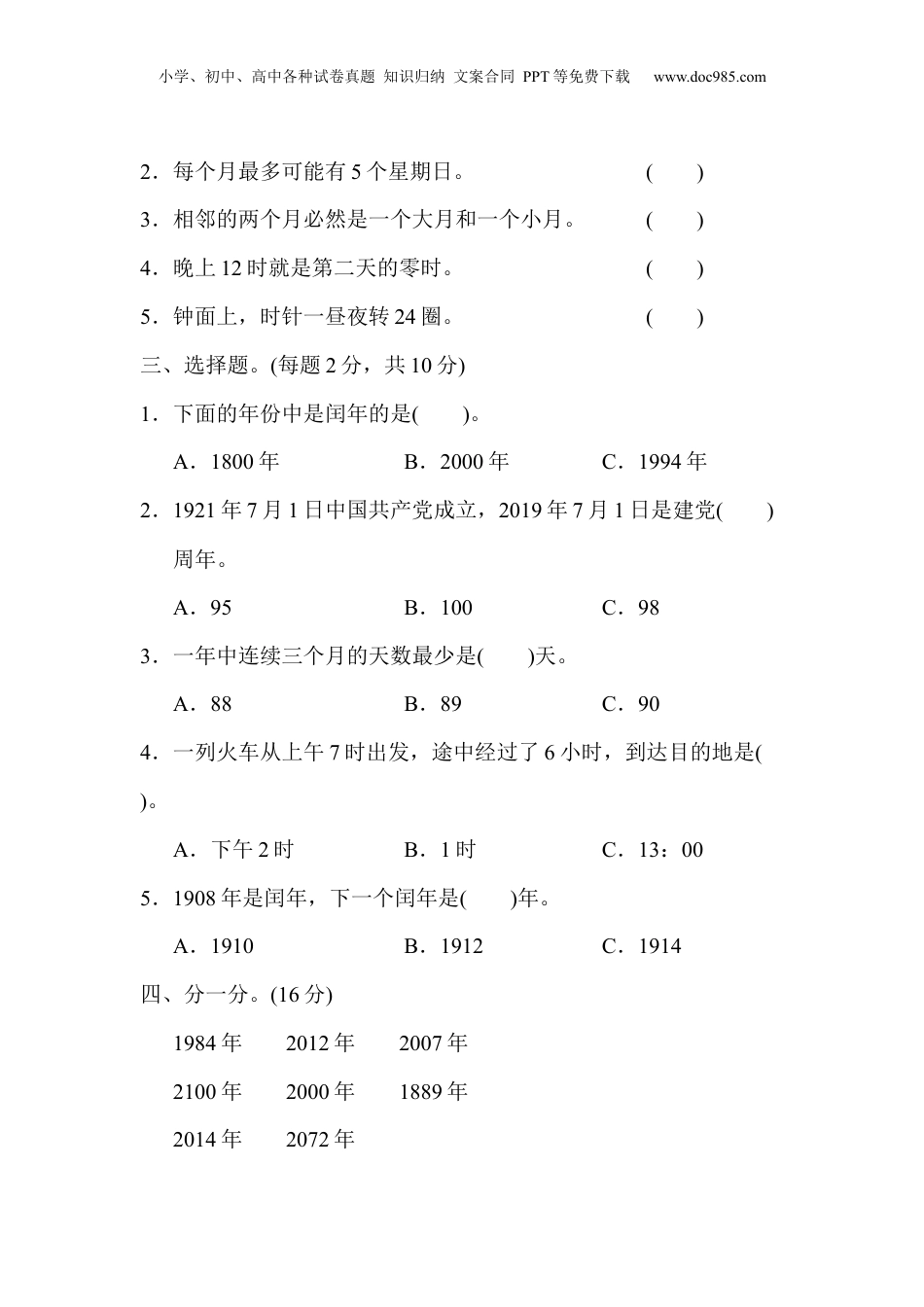 小学、初中、高中各种试卷真题知识归纳文案合同PPT等免费下载www.doc985.com教材过关卷(9)一、填空题。(每空1分,共15分)1.5年=()个月168小时=()日1小时40分=()分2.东东的生日是1999年9月8日,2018年9月8日他要过()岁生日。3.芳芳是2015年2月28日出生的,她出生的第二天是()月()日。4.用24时计时法表示下面的时刻。上午10时:____________下午5:30:____________凌晨1时:____________晚上11:20:____________5.2018年世界杯将在俄罗斯举行,这一年是()年,上半年有()天。6.火车19:05开,检票员要提前35分钟检票,开始检票的时间为()时()分。7.小红从晚上9时睡到第二天早上7时,她睡了()小时。二、判断题。(每题2分,共10分)1.每年的下半年的天数都是一样的。()小学、初中、高中各种试卷真题知识归纳文案合同PPT等免费下载www.doc985.com2.每个月最多可能有5个星期日。()3.相邻的两个月必然是一个大月和一个小月。()4.晚上12时就是第二天的零时。()5.钟面上,时针一昼夜转24圈。()三、选择题。(每题2分,共10分)1.下面的年份中是闰年的是()。A.1800年B.2000年C.1994年2.1921年7月1日中国共产党成立,2019年7月1日是建党()周年。A.95B.100C.983.一年中连续三个月的天数最少是()天。A.88B.89C.904.一列火车从上午7时出发,途中经过了6小时,到达目的地是()。A.下午2时B.1时C.13:005.1908年是闰年,下一个闰年是()年。A.1910B.1912C.1914四、分一分。(16分)1984年2012年2007年2100年2000年1889年2014年2072年小学、初中、高中各种试卷真题知识归纳文案合同PPT等免费下载www.doc985.com五、2019年1月31日是星期四,用下表制作一个2019年2月的月历表。(9分)六、解决问题。(1题6分,5题10分,其余每题8分,共40分)1.一场足球赛,从17时30分开始,进行了105分,比赛什么时候结束?2.2017年9月12日牛奶能喝吗?小学、初中、高中各种试卷真题知识归纳文案合同PPT等免费下载www.doc985.com3.王师傅每天工作时间如下:上午7:30~11:30下午2:30~6:20(1)王师傅一天工作多长时间?(2)王师傅中午可以休息多长时间?4.菲菲要看下面的书,她准备从8月18日开始看,9月1日前她能读完吗?5.从A市开往B市的列车,计划每天最早一班3:25开出,然后每隔3小时发出一班,最晚一班晚上9:25开出。(1)每天共有几个班次?(2)请你填出每班次列车的发车时间。小学、初中、高中各种试卷真题知识归纳文案合同PPT等免费下载www.doc985.com班次发车时间小学、初中、高中各种试卷真题知识归纳文案合同PPT等免费下载www.doc985.com答案一、1.6071002.193.314.10时17:301时23:205.平1816.18307.10二、1.√2.√3.×4.√5.×三、1.B2.C3.B4.C5.B四、五、六、1.17时30分+105分=19时15分2.31-25+1=7(天)7+12=19(天)19>18不能喝。3.(1)11时30分-7时30分=4小时6时20分-2时30分=3小时50分4小时+3小时50分=7小时50分小学、初中、高中各种试卷真题知识归纳文案合同PPT等免费下载www.doc985.com(2)下午2时30分=14时30分14时30分-11时30分=3小时4.112÷8=14(天)31-18+1=14(天)14=14能。5.(1)7个班次。(2)班次1234567发车时间3:256:259:2512:2515:2518:2521:25