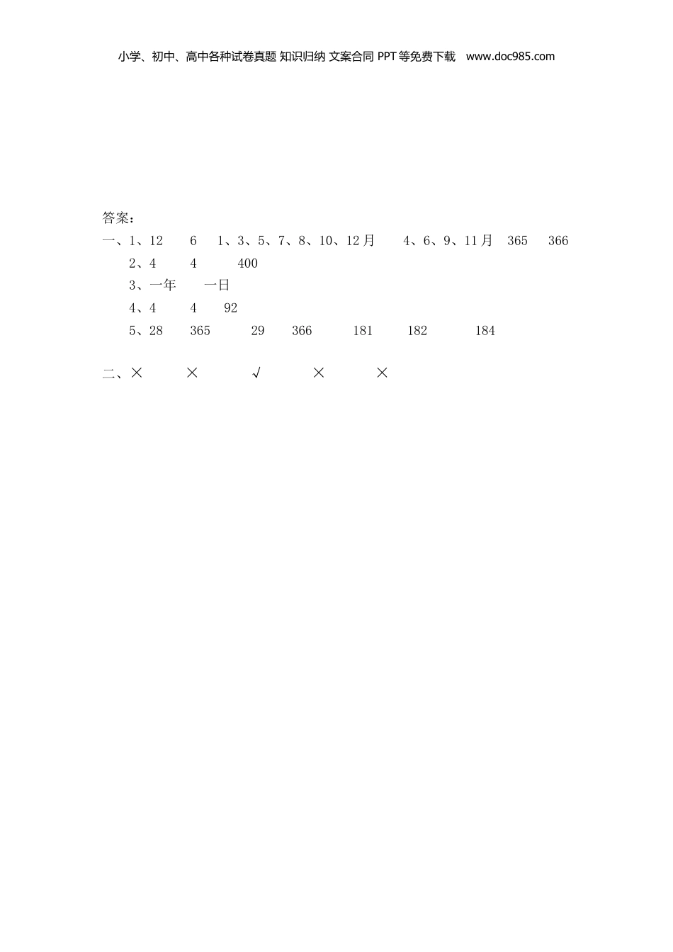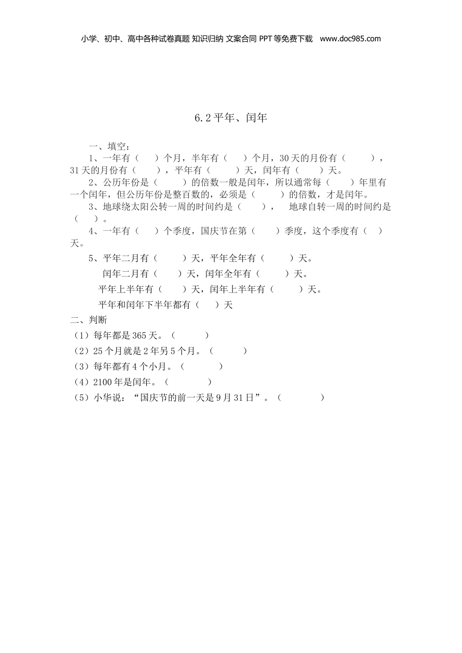 小学、初中、高中各种试卷真题知识归纳文案合同PPT等免费下载www.doc985.com6.2平年、闰年一、填空:1、一年有()个月,半年有()个月,30天的月份有(),31天的月份有(),平年有()天,闰年有()天。2、公历年份是()的倍数一般是闰年,所以通常每()年里有一个闰年,但公历年份是整百数的,必须是()的倍数,才是闰年。3、地球绕太阳公转一周的时间约是(),地球自转一周的时间约是()。4、一年有()个季度,国庆节在第()季度,这个季度有()天。5、平年二月有()天,平年全年有()天。闰年二月有()天,闰年全年有()天。平年上半年有()天,闰年上半年有()天。平年和闰年下半年都有()天二、判断(1)每年都是365天。()(2)25个月就是2年另5个月。()(3)每年都有4个小月。()(4)2100年是闰年。()(5)小华说:“国庆节的前一天是9月31日”。()小学、初中、高中各种试卷真题知识归纳文案合同PPT等免费下载www.doc985.com答案:一、1、1261、3、5、7、8、10、12月4、6、9、11月3653662、444003、一年一日4、44925、2836529366181182184二、××√××