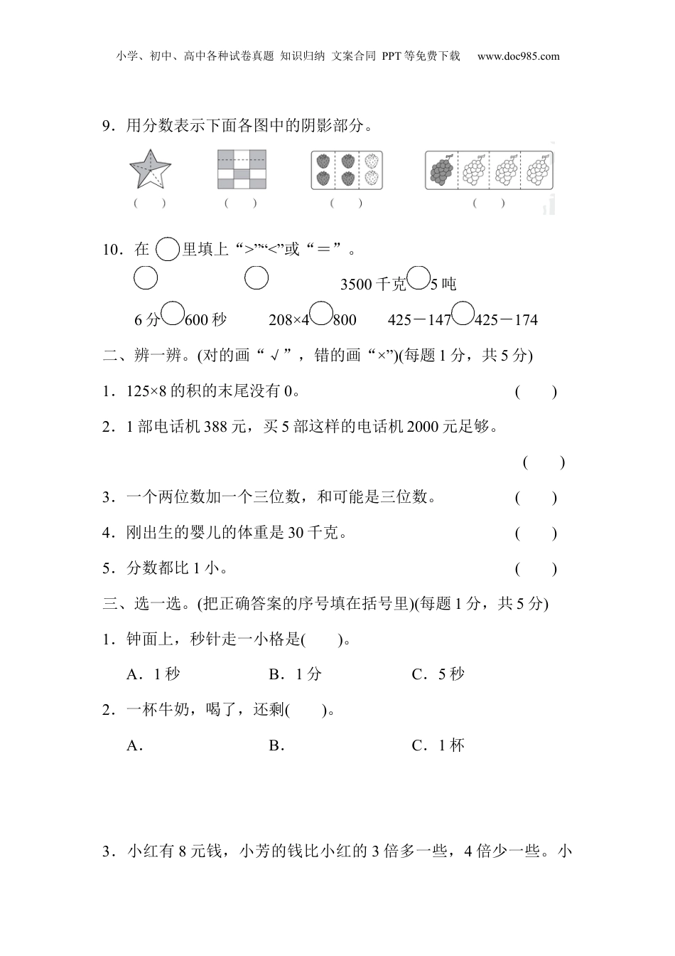 小学、初中、高中各种试卷真题知识归纳文案合同PPT等免费下载www.doc985.com期末测试卷一、填一填。(每空1分,共25分)1.把1分米长的彩带平均分成10份,每份是它的,4份是它的。2.620比360多(),比450多170的数是()。3.12是3的()倍,12的3倍是()。4.一个长方形相邻的两条边的和是15厘米,这个长方形的周长是()厘米。5.一个正方形的边长是(),它的周长是20分米。6.刘老师的身份证号码是210102196306117153,刘老师的性别是(),出生日期是()。7.三(1)班获得“爱心少年”称号的有34人,获得“勇敢少年”称号的有20人,其中有10人既是“爱心少年”、也是“勇敢少年”。全班所有人都至少获得了这两个称号中的一个。三(1)班一共有()人。8.在括号里填上合适的单位名称。(1)小朋友每次洗手用的时间约30()。(2)民航客机每小时飞行850()。(3)一艘货轮的载质量是5000()。(4)电脑屏幕宽4()。小学、初中、高中各种试卷真题知识归纳文案合同PPT等免费下载www.doc985.com9.用分数表示下面各图中的阴影部分。10.在里填上“>”“<”或“=”。3500千克5吨6分600秒208×4800425-147425-174二、辨一辨。(对的画“√”,错的画“×”)(每题1分,共5分)1.125×8的积的末尾没有0。()2.1部电话机388元,买5部这样的电话机2000元足够。()3.一个两位数加一个三位数,和可能是三位数。()4.刚出生的婴儿的体重是30千克。()5.分数都比1小。()三、选一选。(把正确答案的序号填在括号里)(每题1分,共5分)1.钟面上,秒针走一小格是()。A.1秒B.1分C.5秒2.一杯牛奶,喝了,还剩()。A.B.C.1杯3.小红有8元钱,小芳的钱比小红的3倍多一些,4倍少一些。小小学、初中、高中各种试卷真题知识归纳文案合同PPT等免费下载www.doc985.com芳可能有()元钱。A.32B.31C.244.用长54厘米的铁丝正好围成一个长是20厘米的长方形,则长方形的宽是()厘米。A.14B.17C.75.要使253×的积是三位数,里最大应该填()。A.3B.4C.5四、计算挑战。(共30分)1.口算或估算。(每题0.5分,共6分)247+76=120×5=123+64=190+230=202×2≈77×3≈402×2=80-45=+=1-=+=-=2.列竖式计算。(每题3分,共18分)245×7=9×108=700-206=547+328=862-349=320×9=3.计算。(每题3分,共6分)小学、初中、高中各种试卷真题知识归纳文案合同PPT等免费下载www.doc985.com475+125×4(951-347)×6五、动手操作。(每题4分,共8分)1.量出数据,并求周长。(用毫米作单位)2.根据分数涂色。六、解决问题。(3、5题每题6分,其余每题5分,共27分)1.如图,李奶奶靠墙角用篱笆围了一块长方形地来养鸡,这块地的长是10米,宽是6米,篱笆长多少米?小学、初中、高中各种试卷真题知识归纳文案合同PPT等免费下载www.doc985.com2.小芳和小红一共跳了多少下?3.购物。(1)张叔叔想买一辆自行车和一台微波炉,一共需要多少钱?(2)某单位想买3部照相机,需要多少钱?4.幼儿园购买了3个小熊玩具,一共花了27元,照这样计算,购买7个这样的小熊玩具需要多少钱?小学、初中、高中各种试卷真题知识归纳文案合同PPT等免费下载www.doc985.com5.(1)上衣的价钱是手套的几倍?(2)裤子的价钱是手套的4倍。一条裤子多少钱?(3)手套的价钱是袜子的2倍。买一条裤子的钱能买几双袜子?小学、初中、高中各种试卷真题知识归纳文案合同PPT等免费下载www.doc985.com答案一、1.2.2606203.4364.305.5分米[点拨]别忘了要带上单位。6.男1963年6月11日7.448.(1)秒(2)千米(3)吨(4)分米9.10.<<<<>>二、1.×2.√3.√4.×5.×三、1.A2.A3.B4.C5.A四、1.32360018742040024080435102.171597249487551328803.9753624五、1.26毫米35毫米(26+35)×2=122(毫米)2.六、1.10+6=16(米)答:篱笆长16米。小学、初中、高中各种试卷真题知识归纳文案合同PPT等免费下载www.doc985.com[点拨]要善于在“变”中解决问题。2.小芳:54÷6=9(下)小红:9×3=27(下)一共:9+27=36(下)答:小芳和小红一共跳了36下。[点拨]解决实际问题时,要善于找相关联的条件来解决问题。3.(1)467+850=1317(元)答:一共需要1317元。(2)1020×3=3060(元)答:需要3060元。4.27÷3×7=63(元)答:需要63元。5.(1)40÷8=5答:上衣的价钱是手套的5倍。(2)8×4=32(元)答:一条裤子32元。(3)袜子:8÷2=4(元)32÷4=8(双)答:买一条裤子的钱能买8双袜子。
