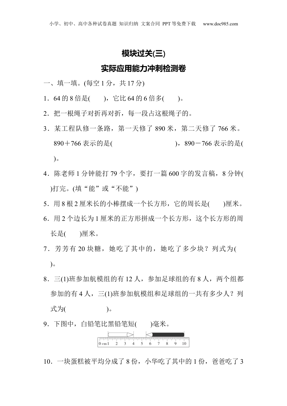 小学、初中、高中各种试卷真题知识归纳文案合同PPT等免费下载www.doc985.com模块过关(三)实际应用能力冲刺检测卷一、填一填。(每空1分,共17分)1.64的8倍是(),它比64的6倍多()。2.把一根绳子对折再对折,每一段占这根绳子的。3.某工程队修一条路,第一天修了890米,第二天修了766米。890+766表示的是(),890-766表示的是()。4.陈老师1分钟能打79个字,要打一篇600字的发言稿,8分钟()打完。(填“能”或“不能”)5.用8根2厘米长的小棒摆成一个长方形,它的周长是()厘米。6.用2个边长为1厘米的正方形拼成一个长方形,这个长方形的周长是()厘米。7.芳芳有20块糖,她吃了其中的,她吃了多少块?列式为()。8.三(1)班参加航模组的有12人,参加足球组的有8人,两个组都参加的有4人,三(1)班参加航模组和足球组的一共有多少人?列式为()。9.下图中,白铅笔比黑铅笔短()毫米。10.一块蛋糕被平均分成了8份,小华吃了其中的1份,爸爸吃了3小学、初中、高中各种试卷真题知识归纳文案合同PPT等免费下载www.doc985.com份,妈妈吃了2份。小华吃了,爸爸吃了,妈妈吃了。把这三个分数按从大到小的顺序排一排:>>。二、辨一辨。(对的画“√”,错的画“×”)(每题1分,共5分)1.10千克的和3千克的一样重。()2.一头牛和一头猪共重912千克,已知猪重120千克,求牛重多少千克,用加法计算。()3.红红从1楼到2楼用了15秒,求她从1楼到5楼共用多少秒,用15×5计算。()4.有两个杯子,各装有杯水,将它们倒在一起就刚好是一杯水。()5.用16个边长是1厘米的正方形拼长方形和正方形,拼成正方形时的周长最短。()三、选一选。(把正确答案的序号填在括号里)(每题2分,共10分)1.一件上衣179元,比一条裤子少82元,这条裤子()元。A.87B.97C.2612.23×4的积是三位数,里最大能填()。A.5B.4C.33.第一排:第二排:第二排再摆放()支就是第一排支数的3倍。A.3B.6C.9D.124.豆腐加工店用3千克黄豆做出12千克豆腐。照这样计算,用100小学、初中、高中各种试卷真题知识归纳文案合同PPT等免费下载www.doc985.com千克黄豆能做出多少千克豆腐?下面列式正确的是()。A.12÷3×100B.100÷(12÷3)C.3×12÷1005.如图,再涂()块,涂色部分就占这个图形的。A.3B.4C.5四、计算挑战。(共20分)1.直接写出得数。(每题1分,共8分)800×3=15×6=80-45=450-270=+=1-=+=988×0=2.列竖式计算。(每题3分,共12分)804-279=370×8=903×2=584+319=五、在下面方格纸上画出周长是16厘米的长方形。(6分)小学、初中、高中各种试卷真题知识归纳文案合同PPT等免费下载www.doc985.com六、解决问题。(3~4题每题10分,6题7分,其余每题5分,共42分)1.新年到,抢微信红包啦。哥哥抢了多少元?2.张老师带的钱买3元1支的自动铅笔,正好可以买12支。用这些钱买4元1支的自动铅笔,可以买多少支?3.星星影院有两层,楼上有350个座位,楼下有470个座位。小学、初中、高中各种试卷真题知识归纳文案合同PPT等免费下载www.doc985.com(1)星星影院一共有多少个座位?(2)某场电影的票价是每张9元,如果这场的票都卖完了,这场的票房收入是多少元?4.(1)豆豆有多少张卡片?(2)豆豆送给玲玲1张卡片后,豆豆的卡片数量是玲玲的几倍?5.乐乐搬了多少盆花?小学、初中、高中各种试卷真题知识归纳文案合同PPT等免费下载www.doc985.com6.三(3)班有40人,在一次数学测试中有两道思考题,全班做对第一道思考题的有25人,做对第二道思考题的有22人,每人至少做对了一道思考题,这两道思考题都做对的有几人?小学、初中、高中各种试卷真题知识归纳文案合同PPT等免费下载www.doc985.com答案一、1.5121282.3.两天共修的米数第一天比第二天多修的米数4.能5.16[点拨]长边摆3根,短边摆1根,才能摆成长方形。长是3×2=6(厘米),宽是2厘米,周长是(6+2)×2=16(厘米)。6.67.20÷5=4(块)8.12+8-4=16(人)9.1510.二、1.√2.×3.×4.×5.√三、1.C2.B3.C[点拨]6×3-9=9(支)。4.A5.B四、1.24009035180102.52529601806903五、画图略。六、1.27×3=81(元)答:哥哥抢了81元。2.12×3÷4=9...