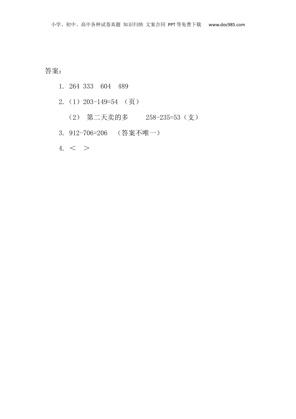 小学、初中、高中各种试卷真题知识归纳文案合同PPT等免费下载www.doc985.com4.4减法(2)1.竖式计算。806-542=460-127=809-205=787-298=2.解决问题。(1)有一本203页的书,娜娜看了一些后还有149页没看完。娜娜看了多少页?(2)商店运来一批牙膏,第一天卖了235支,第二天卖了258支,这两天哪天卖得多,多多少?3.在下面四个数中任选两个数组成减法算式。9123957065274.数学冲浪你知道哪个图形表示的数大吗?①○+137=☆+132②△-69=□-50○☆△□能成几你组道的算这样式?看试试!小学、初中、高中各种试卷真题知识归纳文案合同PPT等免费下载www.doc985.com答案:1.2643336044892.(1)203-149=54(页)(2)第二天卖的多258-235=53(支)3.912-706=206(答案不唯一)4.<>
