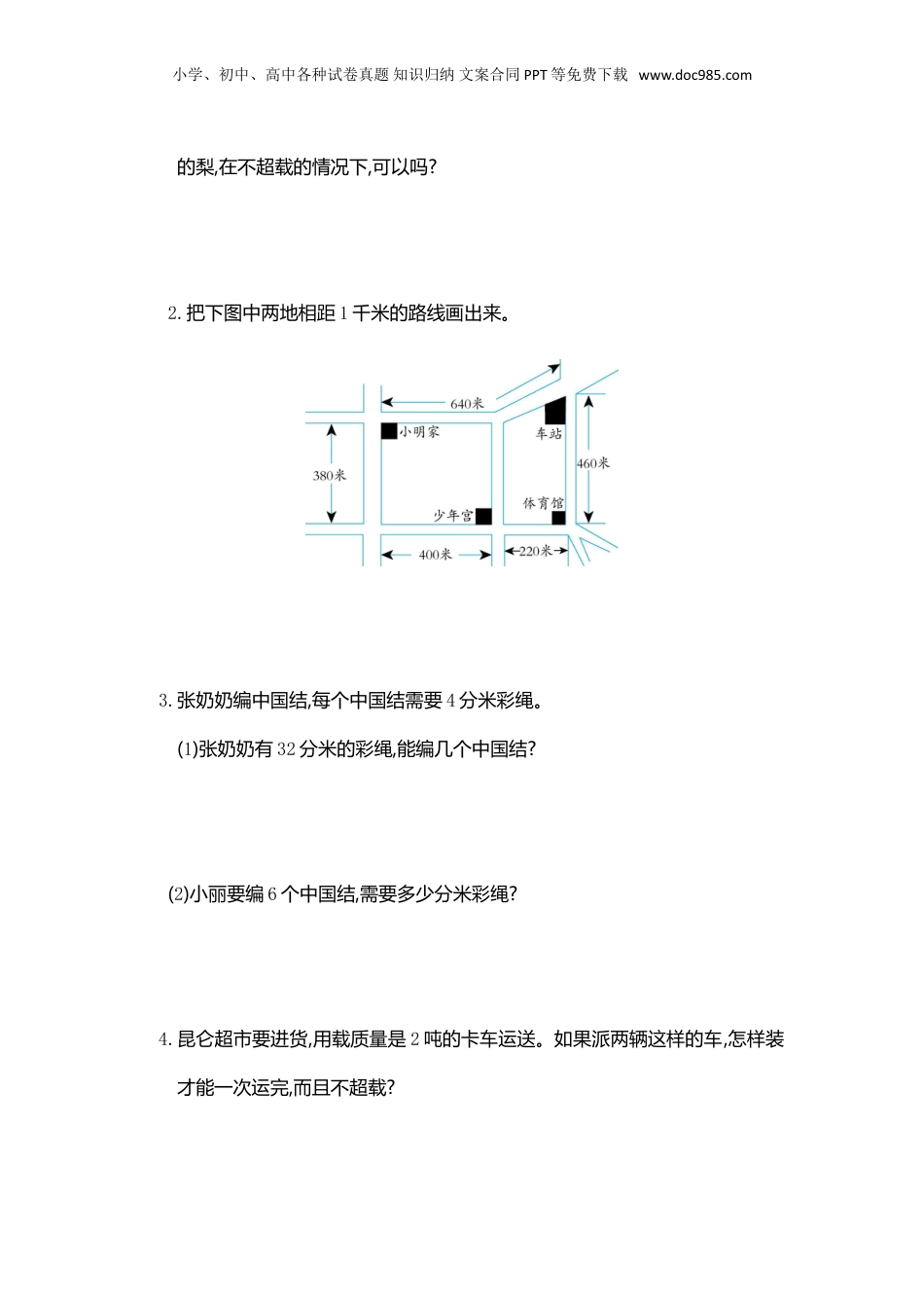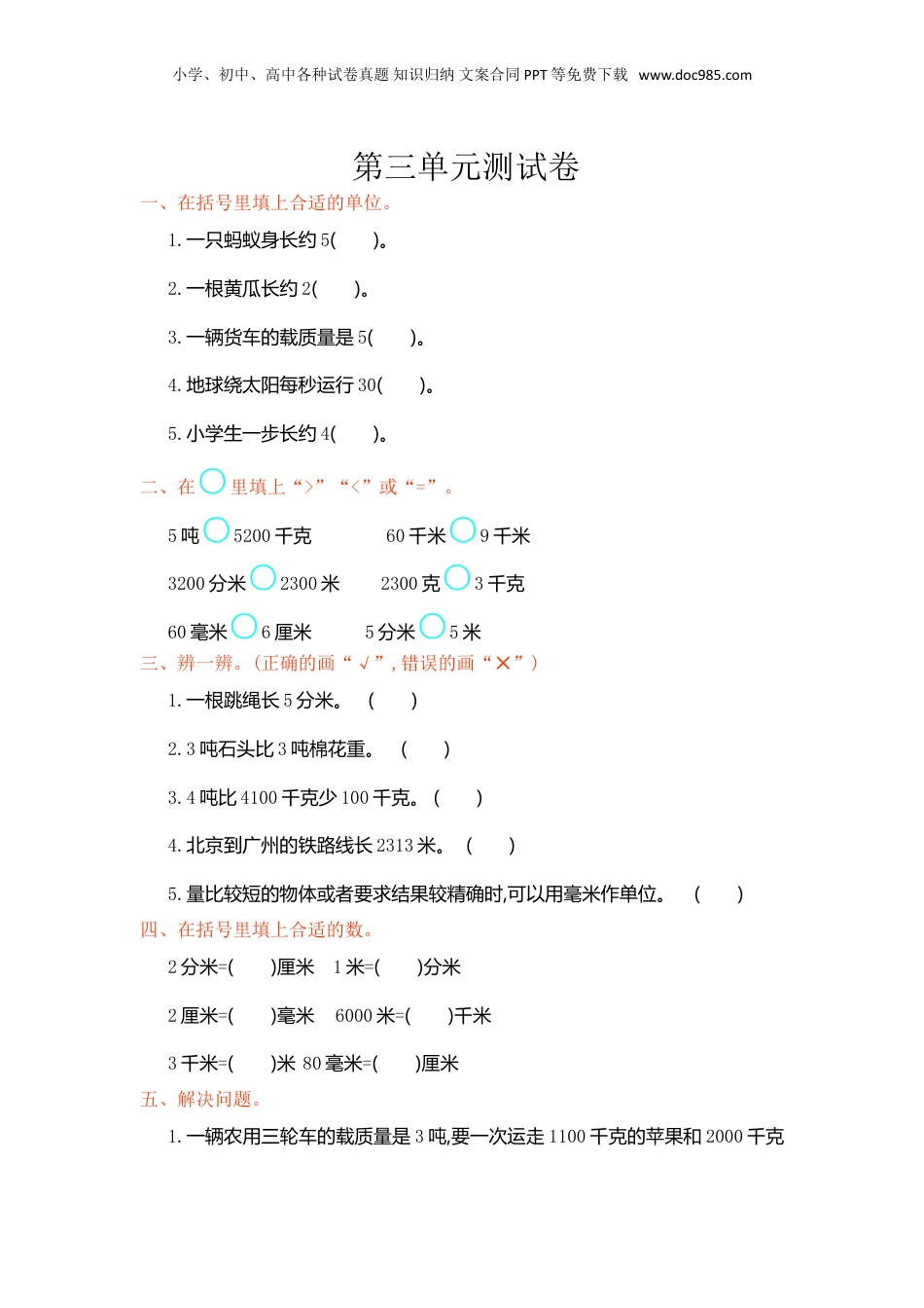 小学、初中、高中各种试卷真题知识归纳文案合同PPT等免费下载www.doc985.com第三单元测试卷一、在括号里填上合适的单位。1.一只蚂蚁身长约5()。2.一根黄瓜长约2()。3.一辆货车的载质量是5()。4.地球绕太阳每秒运行30()。5.小学生一步长约4()。二、在○里填上“>”“<”或“=”。5吨○5200千克60千米○9千米3200分米○2300米2300克○3千克60毫米○6厘米5分米○5米三、辨一辨。(正确的画“√”,错误的画“✕”)1.一根跳绳长5分米。()2.3吨石头比3吨棉花重。()3.4吨比4100千克少100千克。()4.北京到广州的铁路线长2313米。()5.量比较短的物体或者要求结果较精确时,可以用毫米作单位。()四、在括号里填上合适的数。2分米=()厘米1米=()分米2厘米=()毫米6000米=()千米3千米=()米80毫米=()厘米五、解决问题。1.一辆农用三轮车的载质量是3吨,要一次运走1100千克的苹果和2000千克小学、初中、高中各种试卷真题知识归纳文案合同PPT等免费下载www.doc985.com的梨,在不超载的情况下,可以吗?2.把下图中两地相距1千米的路线画出来。3.张奶奶编中国结,每个中国结需要4分米彩绳。(1)张奶奶有32分米的彩绳,能编几个中国结?(2)小丽要编6个中国结,需要多少分米彩绳?4.昆仑超市要进货,用载质量是2吨的卡车运送。如果派两辆这样的车,怎样装才能一次运完,而且不超载?小学、初中、高中各种试卷真题知识归纳文案合同PPT等免费下载www.doc985.com5.一根4米长的木头,现在要把它锯成5分米的木桩,可以锯成多少段?需要锯几次?小学、初中、高中各种试卷真题知识归纳文案合同PPT等免费下载www.doc985.com第三单元测试卷参考答案一、1.毫米2.分米3.吨4.千米5.分米二、<><<=<三、1.✕2.✕3.√4.✕5.√四、201020630008五、1.1100+2000=3100(千克)3吨=3000千克3100千克>3000千克不可以。2.小明家→少年宫→体育馆3.(1)32÷4=8(个)(2)4×6=24(分米)4.一辆车装1000千克的大米和900千克的油,另一辆车装400千克的水果、800千克的蔬菜和700千克的饮料;也可以一辆车装1000千克的大米和800千克的蔬菜,另一辆车装400千克的水果、900千克的油和700千克的饮料。5.4米=40分米40÷5=8(段)8-1=7(次)可以锯成8段,需要锯7次。