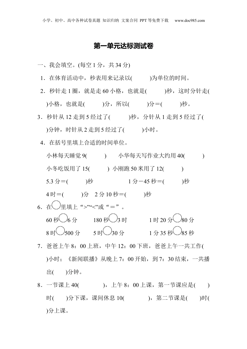 小学、初中、高中各种试卷真题知识归纳文案合同PPT等免费下载www.doc985.com第一单元达标测试卷一、我会填空。(每空1分,共34分)1.在体育活动中,秒表用来记录以()为单位的时间。2.秒针走1圈,就是走60小格,也就是()秒,这时分针走()小格,也就是()分,所以()分=()秒。3.秒针从12走到5经过了()秒,分针从1走到5经过了()分钟,时针从2走到5经过了()小时。4.在括号里填上合适的时间单位。小林每天睡觉9()小华每天写作业大约用40()小冬吃饭用了15()小刚跑50米用了12()5.3分=()秒1分-45秒=()秒4时=()分2分10秒=()秒6.在里填上“>”“<”或“=”。60秒6分180秒3时1时20分80分8时500分5时30分1分35秒85秒7.爸爸上午8:00上班,中午12:00下班,爸爸上午一共工作()小时;《新闻联播》从晚上7:00开始,到7:30结束,一共播出()分钟。8.一节课上40(),上午8:00上课,第一节课应是()时()分下课,课间休息10(),第二节课是()时()分上课。小学、初中、高中各种试卷真题知识归纳文案合同PPT等免费下载www.doc985.com9.小丽晚上7:30开始写作业,用40分钟写完了,此时是晚上()时()分。10.一节课40分钟,课间休息10分钟,再加上()分钟就是1小时。二、我会判断。(每题1分,共5分)1.秒针在钟面上走一圈是1小时。()2.钟面上走得最快的是时针,走得最慢的是秒针。()3.做一遍眼保健操的时间多于1分钟。()4.读一篇200字的文章大约要用1小时。()5.分针走1大格,秒针走1圈。()三、我会选择。(把正确答案的字母填在括号里)(每题2分,共12分)1.妈妈做一顿饭大约用()。A.40秒B.40分钟C.40小时2.同心超市本应7:20开始营业,今天提前20分钟开始营业,那么同心超市今天()开始营业。A.7:00B.8:40C.7:403.一架客机本应该10:25到达,现在晚点15分钟,()能到达。A.10:10B.10:40C.11:404.图书馆上午8:00开门,小明7:40已经到了图书馆门口,他还要等()。A.20分钟B.40分钟C.60分钟小学、初中、高中各种试卷真题知识归纳文案合同PPT等免费下载www.doc985.com5.在100米短跑比赛中,小娟用了16秒,小丽用了14秒,小兰用了15秒,()是第一名。A.小丽B.小兰C.小娟6.如图,时针在5和6之间,分针指向5,秒针指向1,这时是()。A.5时25分1秒B.6时25分5秒C.5时25分5秒四、看图写时间。(每空1分,共8分)1.2.五、填一填。(每空1分,共5分)1.秒针从上一个数字走到下一个数字经过的时间是()秒。2.时针走一大格,分针走()圈。3.小明下午3:45离开学校,4:15到家,路上用了()分钟。4.奶奶今天早上6:30去锻炼身体,比昨天提前了20分钟,她昨小学、初中、高中各种试卷真题知识归纳文案合同PPT等免费下载www.doc985.com天()时()分去锻炼身体。六、公共汽车每隔10分钟发出一班,小华想乘坐9:20的一班公共汽车,他走到站台时已是9:22,没赶上,他要再等多少分钟,才能乘坐下一班的公共汽车?(6分)七、我会灵活应用。(每题6分,共30分)1.电影是什么时候开始放映的?2.(1)明明上学路上用了多长时间?小学、初中、高中各种试卷真题知识归纳文案合同PPT等免费下载www.doc985.com(2)明明明天早上值日,必须7:00到校,他最晚什么时候从家里出发?3.(变式题)下面有一段“停电预告”。7月30日上午8:00-10:30徐东路一带上午8:00-11:30积玉桥一带上午10:00-下午1:20海港一区下午1:00-3:00海港二区(1)哪个地区停电时间最长?有多长?(2)芳芳在下午1:30回到家,发现家里停电,你知道她家住在哪儿吗?还需要多长时间才会来电?小学、初中、高中各种试卷真题知识归纳文案合同PPT等免费下载www.doc985.com4.小婷每天下午上三节课,每节课40分钟,课间休息10分钟,下午4:00放学。小婷每天下午什么时候开始上课?5.吴老师上午8:00上班,11:30下班,下午1:30上班,4:00下班。吴老师一天上班多长时间?小学、初中、高中各种试卷真题知识归纳文案合同PPT等免费下载www.doc985.com答案一、1.秒2.60111603.252034.小时分钟分钟秒5.180152401306.<<=<>>7.4308.分钟840分钟8509.81010.10二、1.×2.×3.√4.×5.×[点拨]分针走1大格是5分钟,秒针走5圈。三、1.B2.A...