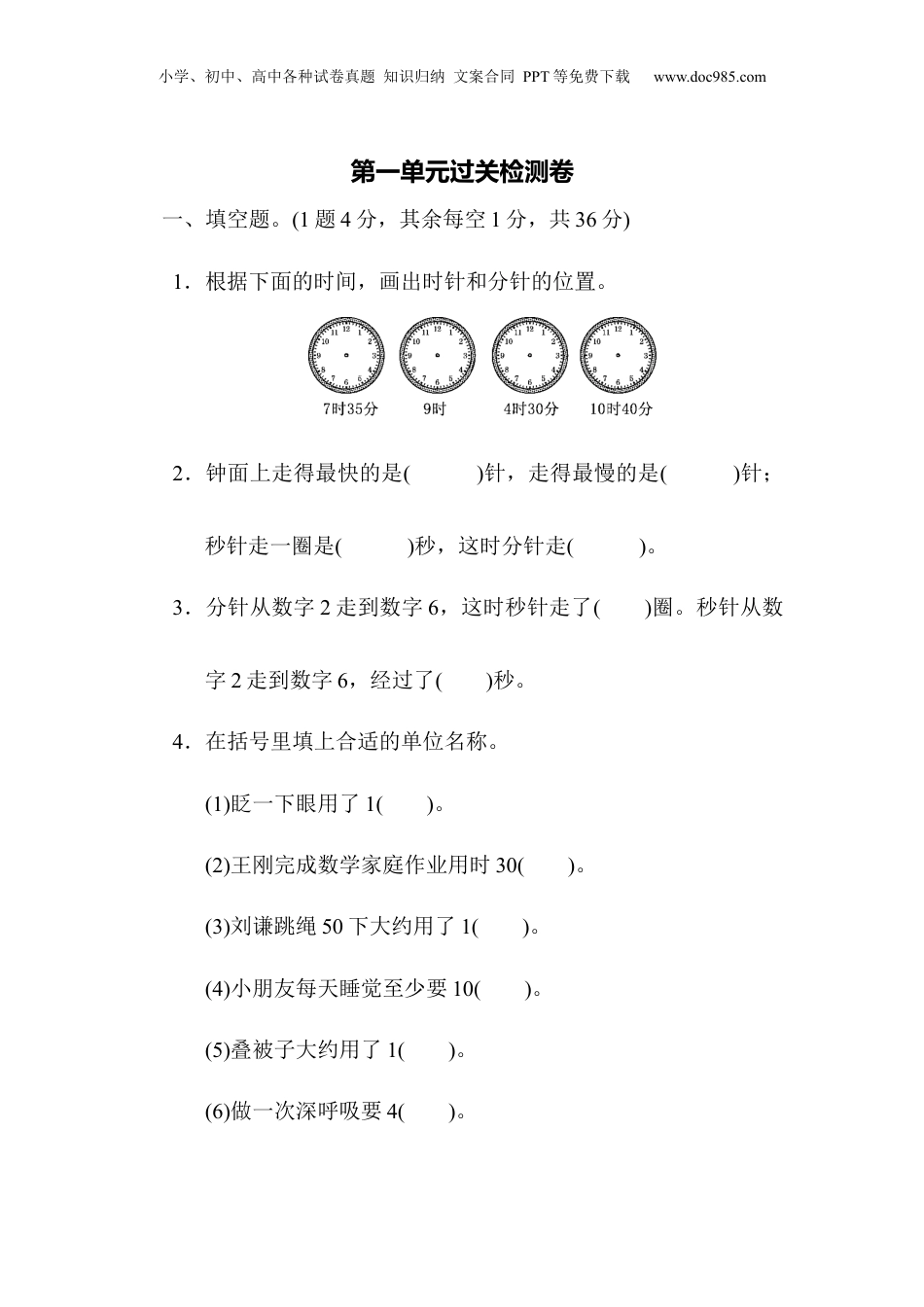 小学、初中、高中各种试卷真题知识归纳文案合同PPT等免费下载www.doc985.com第一单元过关检测卷一、填空题。(1题4分,其余每空1分,共36分)1.根据下面的时间,画出时针和分针的位置。2.钟面上走得最快的是()针,走得最慢的是()针;秒针走一圈是()秒,这时分针走()。3.分针从数字2走到数字6,这时秒针走了()圈。秒针从数字2走到数字6,经过了()秒。4.在括号里填上合适的单位名称。(1)眨一下眼用了1()。(2)王刚完成数学家庭作业用时30()。(3)刘谦跳绳50下大约用了1()。(4)小朋友每天睡觉至少要10()。(5)叠被子大约用了1()。(6)做一次深呼吸要4()。小学、初中、高中各种试卷真题知识归纳文案合同PPT等免费下载www.doc985.com5.2时=()分60秒=()分1时20分=()分3分5秒=()秒150分=()时()分6.如右图,再过()分钟是3:10;倒退()分钟是2:30。7.小明从下午5:35开始做作业,刚好花了25分钟,完成作业时的时刻是下午()。8.现在是9:20,文艺汇演已经开始了半个小时,那么这场文艺汇演是()开始的。9.小亮7:55从家出发去上学,8:20到达学校。他在路上一共花了()分钟。10.一场电影从下午2:05开始,到下午4:00结束,电影播放了()小时()分钟。小学、初中、高中各种试卷真题知识归纳文案合同PPT等免费下载www.doc985.com11.在里填上“>”“<”或“=”。2分100秒5时500分240秒4分250分5时130分1时30分1分90秒2分30秒150秒二、判断题。(对的画“√”,错的画“×”)(每题1分,共5分)1.秒针走一圈所用的时间和分针走一小格所用的时间相等。()2.百米赛跑是用秒做单位来计时的。()3.明明早晨刷牙用了2分钟。()4.钟面上,分针走半圈是半小时。()5.从9:30到12:30,中间经过了4小时。()三、选择题。(选择正确答案的字母填在括号里)(每题2分,共12分)1.秒针从钟面上的一个数走到下一个数,经过的时间是()。A.5分B.5秒C.1小时D.1秒小学、初中、高中各种试卷真题知识归纳文案合同PPT等免费下载www.doc985.com2.一场电影大约要播放()。A.90分B.90秒C.90小时D.9时3.小红、小兰和小军做一样的作业,小红用了1小时,小军用了70分钟,小兰用了50分钟。则()。A.小红做得最快B.小军做得最快C.小兰做得最快D.他们做得一样快4.从5:25起,再过()是6:10。A.35分钟B.25分钟C.45分钟D.15分钟5.奶奶下午从5:00开始做饭,到下午6:00结束。奶奶做饭用了()。A.60分钟B.70分钟C.30分钟D.10分钟6.下面说法正确的是()。A.小红写一个字大约需要3分钟B.1分12秒=112秒小学、初中、高中各种试卷真题知识归纳文案合同PPT等免费下载www.doc985.comC.因为1时=60分,所以分针走一圈,时针走一大格D.因为1分=60秒,所以秒针走一圈,分针走一大格四、看一看,填一填。(9分)五、想一想,连一连。(4分)六、下面是三个同学进行50米赛跑的成绩,他们的成绩各是多少?你能用线连一连吗?(3分)小学、初中、高中各种试卷真题知识归纳文案合同PPT等免费下载www.doc985.com七、解决问题。(1、2题各5分,3题6分,4题15分,共31分)1.第二次取信到第三次取信间隔多长时间?2.王宁的爸爸从北京到青岛出差,想坐上午11:05的汽车。从家到汽车站要用25分钟,他最晚什么时候从家里出发?(不考虑进站上车的时间)3.下面是某地周末下午停电通知。(1)哪个小区停电时间长?长多长时间?(2)明明下午3:40回到家,发现家里停电。他在家等了15分钟小学、初中、高中各种试卷真题知识归纳文案合同PPT等免费下载www.doc985.com后才恢复了供电,你知道他住在哪个小区吗?4.回答问题。胜利小学作息时间表(上午)8:00—8:20早自习8:30—9:10第一节课9:20—10:00第二节课10:00—10:20课间操10:30—11:10第三节课第四节小学、初中、高中各种试卷真题知识归纳文案合同PPT等免费下载www.doc985.com课(1)上午第一节课有多长时间?(2)10:10同学们正在做什么?(3)你能发现上课时间的规律吗?请你填出第四节课的上课时间和结束时间。(4)胜利小学的学生上午在校的时间有多长?答案1.2.秒时601小格3.2020小学、初中、高中各种试卷真题知识归纳文案合同PPT等免费下载www.doc985.com4.(1)秒(2)分(3)...