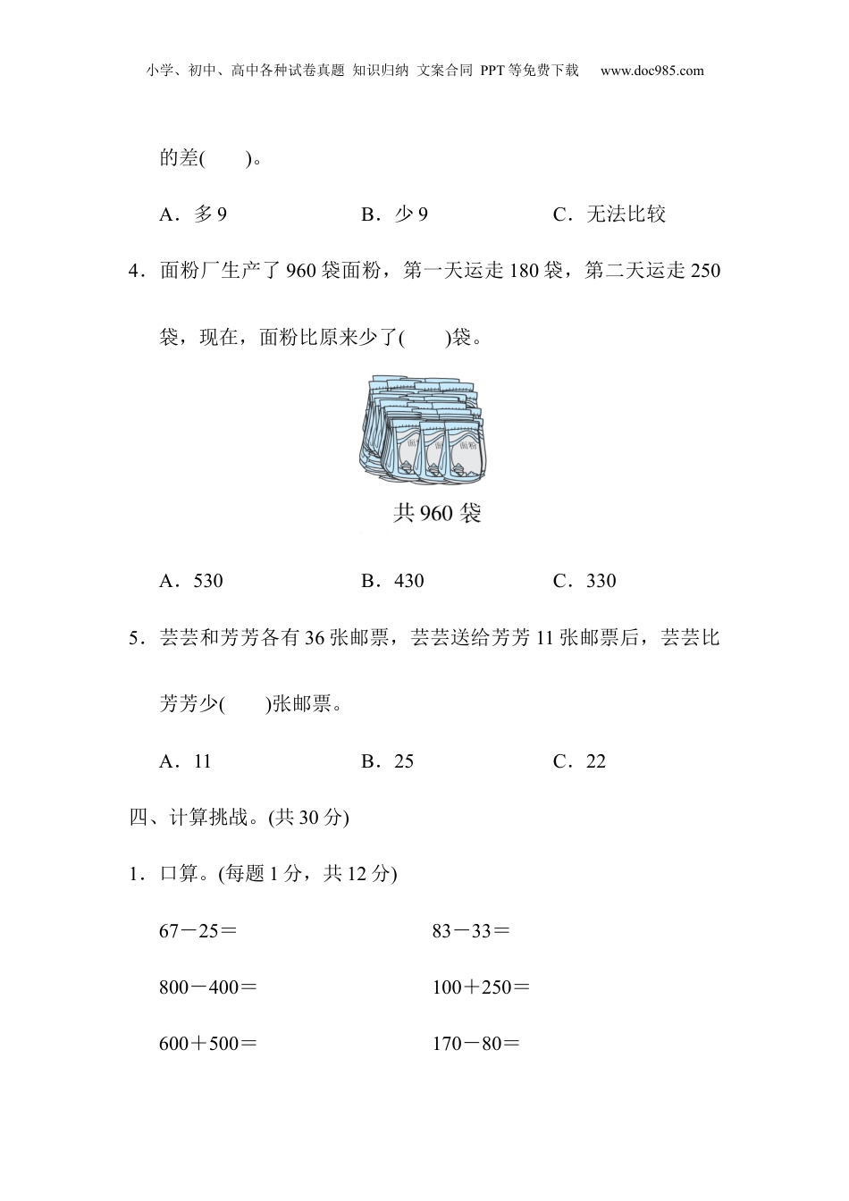 小学、初中、高中各种试卷真题知识归纳文案合同PPT等免费下载www.doc985.com第2单元跟踪检测卷一、填一填。(1题4分,其余每空1分,共25分)1.想一想,算一算。2.66比32多(),比58少23的数是(),()比45多30。3.快乐碰碰车。4.一个加数是250,另一个加数是640,和是()。一个数减去180后是160,这个数是()。5.21――→□――→□――→□――→□420――→□――→□――→□――→□6.商场搞促销,微波炉原价650元,现价570元,便宜了()元。7.一本故事书共698页,小丽看了201页,她大约看了()页,大约还剩()页。小学、初中、高中各种试卷真题知识归纳文案合同PPT等免费下载www.doc985.com8.从甲地到乙地,坐飞机需要553元,坐动车需要379元。从甲地到乙地,坐动车比坐飞机大约便宜()元。二、辨一辨。(对的画“√”,错的画“×”)(每题1分,共5分)1.口算39+65时,可以先算39+60=99,再算99+5=106。()2.两位数加两位数,和可能是四位数。()3.99-5的差的十位一定是4。()4.估算497+179时,把497估成500,179估成180,估算的结果比实际的结果要大。()5.在306、495、345、299、310中,最接近300的是306。()三、选一选。(把正确答案的序号填在括号里)(每题2分,共10分)1.520-370的结果的百位上是()。A.1B.2C.82.得数最接近700的算式是()。A.589+217B.618+89C.962-3903.丽丽做一道减法题,把减数34看成了43,结果算出的差比正确小学、初中、高中各种试卷真题知识归纳文案合同PPT等免费下载www.doc985.com的差()。A.多9B.少9C.无法比较4.面粉厂生产了960袋面粉,第一天运走180袋,第二天运走250袋,现在,面粉比原来少了()袋。A.530B.430C.3305.芸芸和芳芳各有36张邮票,芸芸送给芳芳11张邮票后,芸芸比芳芳少()张邮票。A.11B.25C.22四、计算挑战。(共30分)1.口算。(每题1分,共12分)67-25=83-33=800-400=100+250=600+500=170-80=小学、初中、高中各种试卷真题知识归纳文案合同PPT等免费下载www.doc985.com35+65=54-18=30+200=560-300=470-160=200+420=2.用竖式计算。(每题3分,共18分)430+260=980-460=820-230=550-190=370+380=600-340=五、解决问题。(每题6分,共30分)1.勤劳的人民。小学、初中、高中各种试卷真题知识归纳文案合同PPT等免费下载www.doc985.com(1)两天一共用电线多少米?(2)第一天比第二天少用了多少米?2.风雨无阻的快递员:他这两周大约共送了多少件?第一周第二周数量489件508件小学、初中、高中各种试卷真题知识归纳文案合同PPT等免费下载www.doc985.com3.文具店的积分。(1)小雨积了多少分?(2)小虎和小龙一共积了多少分?小学、初中、高中各种试卷真题知识归纳文案合同PPT等免费下载www.doc985.com4.近年来我国北方冬季大雾天气较多。下面是2017年冬季我国两个城市11、12月份大雾天气天数。(1)这两个月乙市有多少天是大雾天气?(2)请你提一个用加法计算的问题,并解决。5.小明、小红、小刚的家都住在幸福路上(笔直的)。小明家离小红家540米,小红家与小刚家相距380米。小明家和小刚家相距多少米?小学、初中、高中各种试卷真题知识归纳文案合同PPT等免费下载www.doc985.com小学、初中、高中各种试卷真题知识归纳文案合同PPT等免费下载www.doc985.com答案一、1.2.3435753.613588344.890340[点拨]求这个数,用加法。5.673592296204908502706.807.200500[点拨]看清题中“大约”这个重要词汇。8.170二、1.×2.×3.√4.√5.×三、1.A2.B3.B4.B[点拨]不要看到问题中有“少”字,就用减法:960-180-250,这样求的是还剩多少袋。5.C四、1.425040035011009010036230260310620小学、初中、高中各种试卷真题知识归纳文案合同PPT等免费下载www.doc985.com2.690520590360750260五、1.(1)420+430=850(米)答:两天一共用电线850米。(2)430-420=10(米)答:第一天比第二天少用了10米。2.把489看成490,把508看成510。490+510=1000(件)答:他这两周大约共送了1000件。3.(1)46+14=60(分)答:小雨积了60分。(2)33+46=79(分)答:小虎和小龙一共积了79分。4.(1)1...