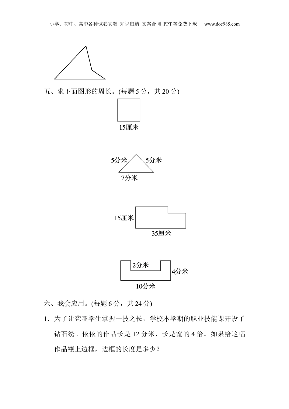 小学、初中、高中各种试卷真题知识归纳文案合同PPT等免费下载www.doc985.com周测培优卷9长方形和正方形的周长能力检测卷一、我会填。(每空3分,共21分)1.()图形一周的长度,是它的()。2.将一根围成长方形的铁丝围成一个正方形(铁丝无剩余),这个正方形和长方形的()相等。3.一个长方形的长是10厘米,宽是8厘米,它的周长是()厘米;一个长方形的长和宽的和是7厘米,它的周长是()厘米。4.一个正方形的边长减少3厘米,那么它的周长减少()厘米。5.有一个正方形小池塘的边长是80米,绕小池塘走5圈,要走多少米,列式是()。二、我会辨。(每题2分,共6分)1.四条边都相等的四边形一定是正方形。()2.长方形的周长=长+宽×2。()3.从下面的这张长方形纸板上剪下一个最大的正方形,这个正方形的边长是12厘米。()三、我会选。(每题3分,共9分)1.正方形的周长是边长的()倍。A.2B.4C.无法确定小学、初中、高中各种试卷真题知识归纳文案合同PPT等免费下载www.doc985.com2.一个长方形的一组相邻边的长度和是10厘米,它的周长是()。A.40厘米B.20厘米C.10厘米3.比较下面图形甲和图形乙的周长,周长甲()周长乙。A.大于B.小于C.等于四、几何世界,动手能力。(每题10分,共20分)1.在下面的方格纸上按要求画图形。(1)画一个周长为12厘米的长方形。(2)画一个周长为12厘米的正方形。2.量出所需要的数据,算出各图形的周长。(单位:mm)(1)(2)小学、初中、高中各种试卷真题知识归纳文案合同PPT等免费下载www.doc985.com五、求下面图形的周长。(每题5分,共20分)六、我会应用。(每题6分,共24分)1.为了让聋哑学生掌握一技之长,学校本学期的职业技能课开设了钻石绣。依依的作品长是12分米,长是宽的4倍。如果给这幅作品镶上边框,边框的长度是多少?小学、初中、高中各种试卷真题知识归纳文案合同PPT等免费下载www.doc985.com2.一张长方形彩纸长30厘米,宽20厘米。在这张纸上剪下一个最大的正方形。正方形的周长是多少?剩下的图形的周长是多少?3.明明家的小区的广场是一个边长为400米的正方形。明明每天下午绕着广场跑3圈,明明每天下午跑多少米?4.明明的妈妈是教师,下面是明明的妈妈学校的跑道平面图。明明的妈妈每天清晨绕操场慢跑3圈,她每天能跑多少米?小学、初中、高中各种试卷真题知识归纳文案合同PPT等免费下载www.doc985.com小学、初中、高中各种试卷真题知识归纳文案合同PPT等免费下载www.doc985.com答案一、1.封闭周长2.周长3.3614[点拨]长和宽的和是7厘米,求周长直接用7×2。4.12[点拨]周长共减少了4个3厘米。5.80×4×5=1600(米)二、1.×2.×3.×三、1.B2.B3.C四、1.略。2.略。五、15×4=60(厘米)5×2+7=17(分米)(35+15)×2=100(厘米)(10+4)×2+2×2=32(分米)[点拨]先了解此不规律图形的周长由哪些线段围成,再通过巧妙“移”。六、1.宽:12÷4=3(分米)(12+3)×2=30(分米)答:边框的长度是30分米。2.正方形:20×4=80(厘米)剩下:30-20=10(厘米)(20+10)×2=60(厘米)答:正方形的周长是80厘米,剩下图形的周长是60厘米。3.400×4×3=4800(米)小学、初中、高中各种试卷真题知识归纳文案合同PPT等免费下载www.doc985.com答:明明每天下午跑4800米。4.(120+75)×2×3=1170(米)答:她每天能跑1170米。[点拨]妈妈慢跑1圈的长度里面有2个120米和2个75米。