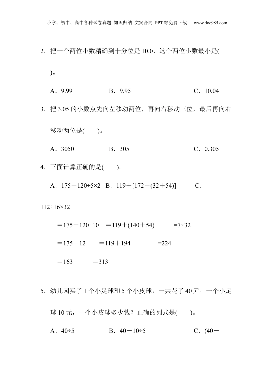 小学、初中、高中各种试卷真题知识归纳文案合同PPT等免费下载www.doc985.com期中跟踪检测卷一、填一填。(7题3分,其余每空1分,共23分)1.0.25里面有2个()和5个(),它的计数单位是()。2.28×4×25=28×(4×25),运用了(),该运算律用字母表示是()。3.把5.6扩大到它的10倍是(),把5.6缩小到它的是()。4.计算95-(18+525÷25)的顺序是第一步算()法,第二步算()法,第三步算()法。5.地球赤道的周长是40075020米,把横线上的数改写成用“万”作单位的数是(),把改写后的数保留一位小数约是()万。6.48厘米=()米4.28吨=()千克3千米10米=()千米0.89平方米=()平方分米3吨60千克=()吨1560吨=()千克7.在里填上适当的数。(1)×18+15×=15×(+82)=(2)25×44=25××=小学、初中、高中各种试卷真题知识归纳文案合同PPT等免费下载www.doc985.com(3)400÷25÷4=400÷(×)=8.用2,0,5三个数字和小数点组成两位小数,其中最大的是(),最小的是()。二、辨一辨。(对的画“√”,错的画“×”)(每题1分,共5分)1.8.0567精确到百分位是8.06。()2.在一个数的末尾添上两个0,这个数就扩大到原来的100倍。()3.在计算99÷9+125×8-99时,乘、除法可以同时计算。()4.甲数是97,比乙数的3倍多7,求乙数的算式是97×3+7。()5.小数的计数单位之间的进率都是10。()三、选一选。(把正确答案的序号填在括号里)(每题2分,共10分)1.下面乘法分配律运用错误的是()。A.102×76=(100+2)×76=100×76+2×76=7752B.39×61+39×39=39×(61+39)=39×100=3900C.34×72+66×28=(34+66)×(72+28)=100×100=10000小学、初中、高中各种试卷真题知识归纳文案合同PPT等免费下载www.doc985.com2.把一个两位小数精确到十分位是10.0,这个两位小数最小是()。A.9.99B.9.95C.10.043.把3.05的小数点先向左移动两位,再向右移动三位,最后再向右移动两位是()。A.3050B.305C.0.3054.下面计算正确的是()。A.175-120÷5×2B.119+[172-(32+54)]C.112÷16×32=175-120÷10=119+(140+54)=7×32=175-12=119+194=224=163=3135.幼儿园买了1个小足球和5个小皮球,一共花了40元,一个小足球10元,一个小皮球多少钱?正确的列式是()。A.40÷5B.40-10÷5C.(40-小学、初中、高中各种试卷真题知识归纳文案合同PPT等免费下载www.doc985.com10)÷5四、计算挑战。(共29分)1.直接写出得数。(每题1分,共9分)25×8=125÷100=28÷4×7=46-(29+17)=57+43+27=36-0×7=25×9×4=75-25÷5=(24-8)÷4=2.计算下面各题,怎样简便就怎样算。(每题2分,共12分)197-12×9+61(224-185)×12÷26164+83+136+117487-(187+166)102×43145+99×1453.先在方框里填上数,再列综合算式。(每题4分,共8分)(1)小学、初中、高中各种试卷真题知识归纳文案合同PPT等免费下载www.doc985.com综合算式:________________(2)综合算式:________________五、动手操作,智慧大脑。(6分)下面的立体图形从上面、左面、前面看,看到的图形分别是什么?请画出来。六、走进生活,解决问题。(1~3题每题5分,4、5题每题6分,共27分)1.游泳池长50m,小华每天都游9个来回,他每天游多少米?小学、初中、高中各种试卷真题知识归纳文案合同PPT等免费下载www.doc985.com2.学校买回560本新书,把它们平均分给五、六年级,每个年级有4个班,平均每个班分到多少本?3.一辆货车从一个建筑工地运沙,第一天运了375t,第二天运了316t,第三天运了325t,第四天运了284t。这辆货车四天一共运沙多少吨?4.《少年百科》每套84元,《科幻大世界》每套42元,王老师带了2000元为学校图书馆购买新书,要买12套《少年百科》和16套《科幻大世界》,王老师带的钱够吗?5.某动物园推出“一日游”优惠购票活动:活动一:成人每人120元,儿童每人50元。小学、初中、高中各种试卷真题知识归纳文案合同PPT等免费下载www.doc985.com活动二:5人及5人以上团体票,每人80元。现在有4个大人带5个儿童一起去动物园玩,怎样购票更省钱?需要多少钱?小学、初中、高中各种试卷真题知识归纳文案合同PPT等免费下载w...
