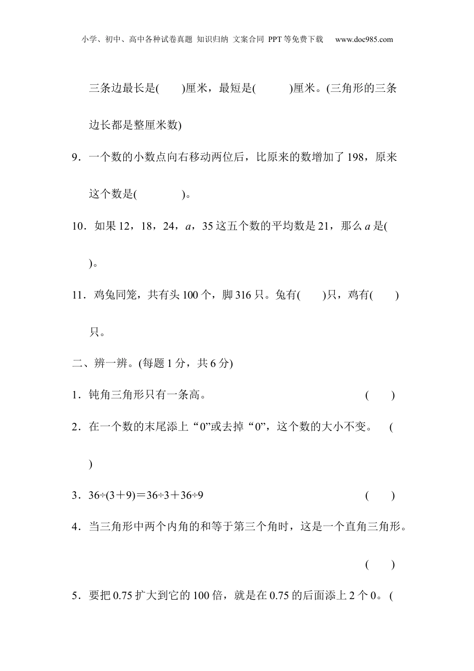 小学、初中、高中各种试卷真题知识归纳文案合同PPT等免费下载www.doc985.com四年级第二学期数学期末测试卷一、填一填。(每空1分,共21分)1.2.05公顷=()平方米8吨50千克=()吨10.73千米=()千米()米10元5分=()元2.一个等腰三角形的一个底角是36°,顶角是(),如果顶角是36°,则一个底角是()。3.()个0.01是2.3,3里面有()个0.1。4.我国的《四库全书》是世界上字数最多的书,全书共约997000000字,划线数字改写成用“万”作单位的数是()字,省略亿后面的尾数约是()字。5.用10倍的放大镜看一个三角形,这时三角形的内角和是()。6.如图,从()面看到的形状是,从()面能看到4个正方形。7.一个等腰三角形的两条边是3cm和5cm,这个等腰三角形的周长是()。8.一个三角形的两条边分别是7厘米和10厘米,这个三角形的第小学、初中、高中各种试卷真题知识归纳文案合同PPT等免费下载www.doc985.com三条边最长是()厘米,最短是()厘米。(三角形的三条边长都是整厘米数)9.一个数的小数点向右移动两位后,比原来的数增加了198,原来这个数是()。10.如果12,18,24,a,35这五个数的平均数是21,那么a是()。11.鸡兔同笼,共有头100个,脚316只。兔有()只,鸡有()只。二、辨一辨。(每题1分,共6分)1.钝角三角形只有一条高。()2.在一个数的末尾添上“0”或去掉“0”,这个数的大小不变。()3.36÷(3+9)=36÷3+36÷9()4.当三角形中两个内角的和等于第三个角时,这是一个直角三角形。()5.要把0.75扩大到它的100倍,就是在0.75的后面添上2个0。(小学、初中、高中各种试卷真题知识归纳文案合同PPT等免费下载www.doc985.com)6.在期末考试中,玲玲语文、数学、英语三科的平均分是95分,她的语文成绩不一定是95分。()三、选一选。(每题2分,共10分)1.下面的小数中与10最接近的数是()。A.10.02B.10.001C.9.9982.这3个物体,从()面看到的形状相同。A.上B.前C.左3.下面三组线段中,不能围成三角形的一组是()。A.0.08m、6cm、1dmB.2cm、16cm、17cmC.3cm、8cm、5cm4.乔乔读一本连环画,第一天上午读了21页,下午读了16页,第二天读了17页,正好读完,乔乔平均每天读()页。A.17B.21C.27小学、初中、高中各种试卷真题知识归纳文案合同PPT等免费下载www.doc985.com5.右图是两个边长是2分米的正方形拼成的图形,图中的阴影部分的面积是()平方分米。A.2B.4C.8四、算一算。(1题10分,2题12分,3题8分,共30分)1.直接写得数。65×2=390÷30=4.7+3.5=2-0.8=0.28×1000=0.96÷10=-=+=25×7×4=120÷5÷4=2.计算下列各题,能简算的要简算。640÷[8×(3.7+4.3)]48.76-(12.6+8.76)101×53-53235-(456+304)÷4小学、初中、高中各种试卷真题知识归纳文案合同PPT等免费下载www.doc985.com510÷3÷1767×35+67×66-673.计算角的度数。五、动手操作。(1题3分,2题4分,共7分)1.画出下面三角形底边上的高。2.把图形A向右移动12格后得到图形B,再以虚线为对称轴画出图形B的轴对称图形,得到图形C。小学、初中、高中各种试卷真题知识归纳文案合同PPT等免费下载www.doc985.com六、解决问题。(4题6分,其余每题5分,共26分)1.小亮家七月份电费是88.6元,比六月份多18.8元,小亮家六、七月份共交电费多少元?2.1000个人一天能吃5.6千克盐,照这样计算,10个人每天能吃多少克盐?3.48名同学去划船,一共坐满了10条船,每条大船坐6人,每条小船坐4人。大船和小船各有多少条?小学、初中、高中各种试卷真题知识归纳文案合同PPT等免费下载www.doc985.com4.某景区门票价格方案:方案一:成人每人100元,儿童每人50元;方案二:团体10人以上(含10人)每人80元。(1)成人10人,儿童4人,怎样买票比较划算?(2)成人4人,儿童10人,怎样买票比较省钱?5.下面是明明和亮亮两家各季度用水情况统计表。(单位:吨)第一季度第二季度第三季度第四季度明明家28322523亮亮家30352625(1)补全下面的统计图。小学、初中、高中各种试卷真题知识归纳文案合同PPT等免费下载www.doc985.com(2)明明家平均每月用水多少吨?亮亮家平均每季度用水多少吨?小学、初中、高中各种试卷真题知识归纳文案...