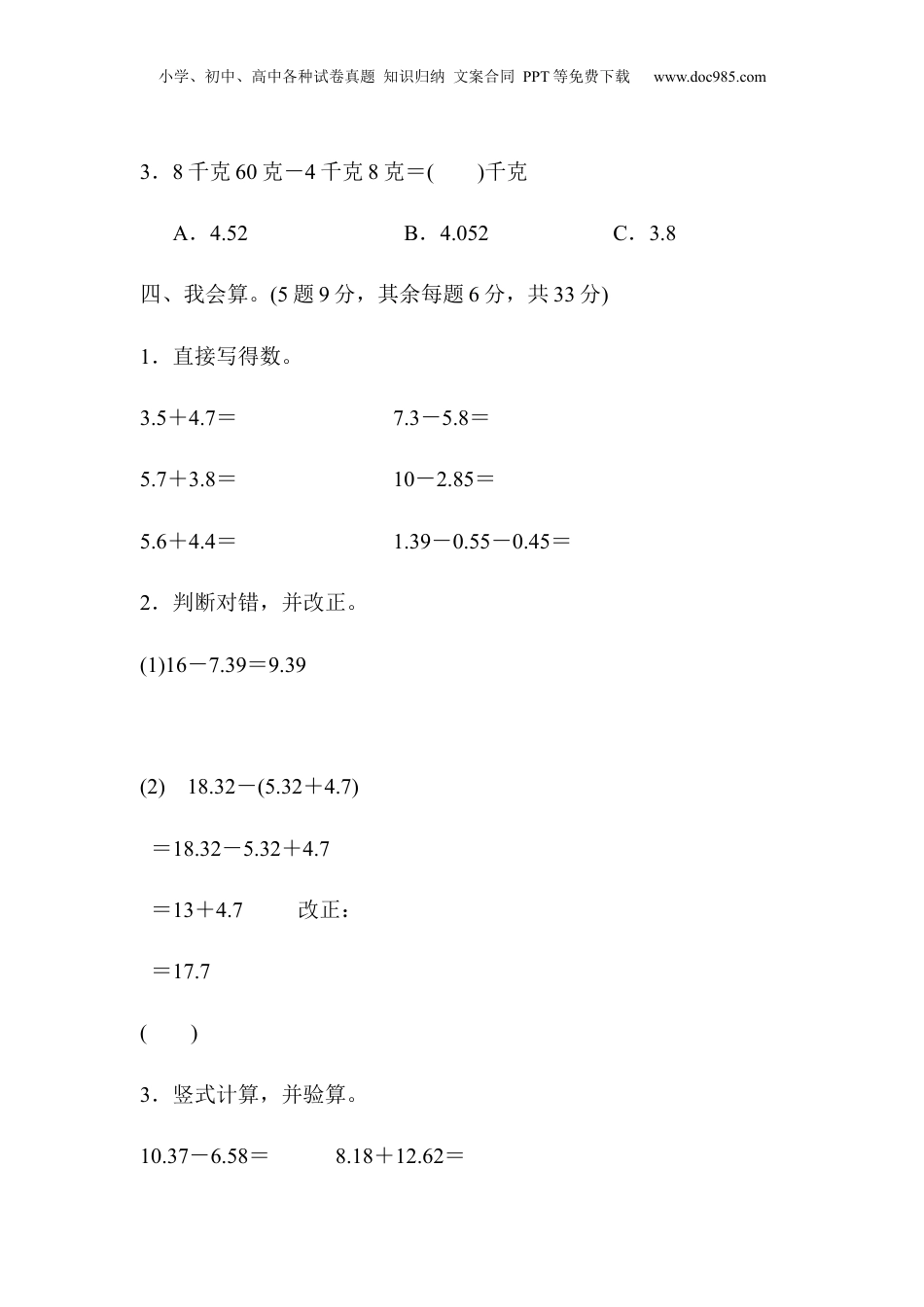 小学、初中、高中各种试卷真题知识归纳文案合同PPT等免费下载www.doc985.com教材过关卷(6)一、我会填。(3题15分,其余每空1分,共31分)1.整数加法的()律和()律对于小数加法同样适用。2.6.4+()=11.2()-4.6=1028-()=5.64()+12.7=203.在横线上填上适当的数,在里填上运算符号。(1)4.8+4.9+5.2=______+(______+______)这里运用了()。(2)8.57-4.7-3.3=____(________)(3)19.68-(7.68+8.5)=____________(4)10.74+5.5-3.74=____________4.0.35扩大到它的10倍后比原数增加了()。5.比2.97多0.3的数是(),20.25比()少0.8。6.整数部分是零的最小的两位小数与最大的一位小数的和是(),差是()。7.某商场举办“迎五一”促销活动,一种袜子买五双送一双。这种小学、初中、高中各种试卷真题知识归纳文案合同PPT等免费下载www.doc985.com袜子每双4.8元,李阿姨买了13双,花了()元。8.找规律填数。(1)1.8,1.6,1.4,(),()(2)9.797,9.792,9.787,(),()二、我会辨。(每题1分,共5分)1.小数加减法的验算方法与整数加减法的验算方法相同。()2.计算小数加减法要把末位对齐。()3.三位小数减去两位小数,差一定是三位小数。()4.49.25-0.75+5.48=49.25+0.75-5.48=50-5.48=44.52()5.5.7+4.3-5.7+4.3=10-10=0()三、我会选。(每题2分,共6分)1.被减数不变,减数增加3.9,差()A.增加3.9B.减少3.9C.不变2.晓海在做小数加法时,把一个加数4.6看成了4.9,结果是7.6。正确结果是()。A.12.5B.12.2C.7.3小学、初中、高中各种试卷真题知识归纳文案合同PPT等免费下载www.doc985.com3.8千克60克-4千克8克=()千克A.4.52B.4.052C.3.8四、我会算。(5题9分,其余每题6分,共33分)1.直接写得数。3.5+4.7=7.3-5.8=5.7+3.8=10-2.85=5.6+4.4=1.39-0.55-0.45=2.判断对错,并改正。(1)16-7.39=9.39(2)18.32-(5.32+4.7)=18.32-5.32+4.7=13+4.7改正:=17.7()3.竖式计算,并验算。10.37-6.58=8.18+12.62=小学、初中、高中各种试卷真题知识归纳文案合同PPT等免费下载www.doc985.com4.计算下列各题,能简算的要简算。(1)6.35+7.2+13.65+1.8(2)20.32-4.56-5.445.用小数计算下面各题。1t50kg-960kg5km-3km68m3m4cm+7m6dm五、我会应用。(3题9分,其余每题8分,共25分)小学、初中、高中各种试卷真题知识归纳文案合同PPT等免费下载www.doc985.com1.将下面的超市小票补充完整。2.“六一儿童节”,大唐文体店进行促销活动,凡购物满100元减18元。乐乐买了一个篮球(85.8元)和一个足球(108.78元),应付多少钱?3.这些动物能同时过河吗?小学、初中、高中各种试卷真题知识归纳文案合同PPT等免费下载www.doc985.com小学、初中、高中各种试卷真题知识归纳文案合同PPT等免费下载www.doc985.com答案一、1.交换结合2.4.814.622.367.33.(1)4.94.85.2加法交换律和结合律(2)8.57-4.7+3.3(3)19.68-7.68-8.5(4)10.74-3.74+5.54.3.155.3.2721.056.0.910.897.52.88.(1)1.21.0(2)9.7829.777二、1.√2.×3.√4.×5.×三、1.B2.C3.B四、1.8.21.59.57.15100.392.(1)×改正:小学、初中、高中各种试卷真题知识归纳文案合同PPT等免费下载www.doc985.com(2)×改正:18.32-(5.32+4.7)=18.32-5.32-4.7=13-4.7=8.33.3.7920.8(验算略)4.6.35+7.2+13.65+1.8=(6.35+13.65)+(7.2+1.8)=20+9=2920.32-4.56-5.44=20.32-(4.56+5.44)=20.32-10=10.325.1t50kg-960kg=1.05t-0.96t=0.09t5km-3km68m=5km-3.068km=1.932km3m4cm+7m6dm=3.04m+7.6m=10.64m五、1.26.2823.72小学、初中、高中各种试卷真题知识归纳文案合同PPT等免费下载www.doc985.com2.85.8+108.78-18=176.58(元)答:应付176.58元。3.119kg=0.119t180kg=0.18t15kg=0.015t220kg=0.22t0.119+1.1+0.18+0.015+0.22=1.634(t)1.634t<1.7t答:这些动物能同时过河。