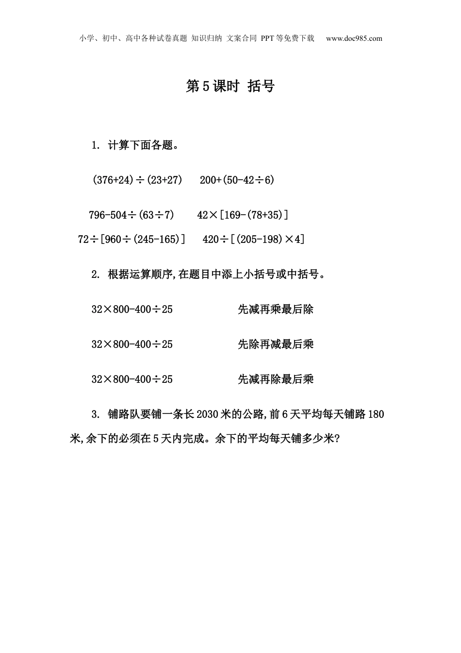 小学、初中、高中各种试卷真题知识归纳文案合同PPT等免费下载www.doc985.com第5课时括号1.计算下面各题。(376+24)÷(23+27)200+(50-42÷6)796-504÷(63÷7)42×[169-(78+35)]72÷[960÷(245-165)]420÷[(205-198)×4]2.根据运算顺序,在题目中添上小括号或中括号。32×800-400÷25先减再乘最后除32×800-400÷25先除再减最后乘32×800-400÷25先减再除最后乘3.铺路队要铺一条长2030米的公路,前6天平均每天铺路180米,余下的必须在5天内完成。余下的平均每天铺多少米?小学、初中、高中各种试卷真题知识归纳文案合同PPT等免费下载www.doc985.com答案提示:1.824374023526152.32×(800-400)÷2532×(800-400÷25)32×[(800-400)÷25]3.(2030-180×6)÷5=190(米)