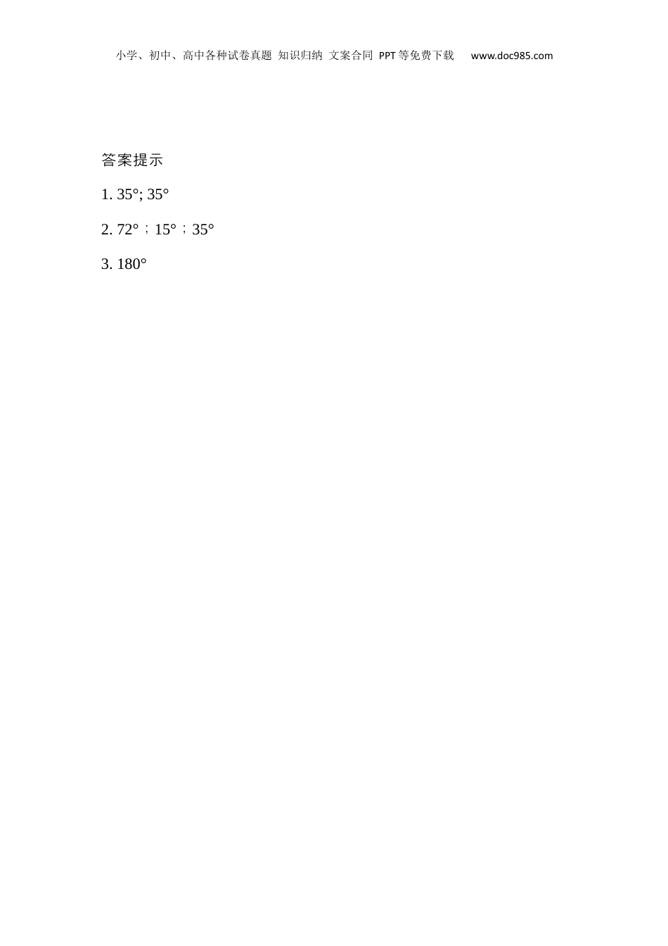 小学、初中、高中各种试卷真题知识归纳文案合同PPT等免费下载www.doc985.com第6课时三角形的内角和1.里有一巾,的形是等腰三角形,其中∠这条红领它状1=110°,算出∠请计2=()°,∠3=()°。2.求出下面各角的度。数∠1=()∠2=()∠3=()3.把一三角形板沿直剪一刀,剩下的板的角和是多少度个纸线纸内?231小学、初中、高中各种试卷真题知识归纳文案合同PPT等免费下载www.doc985.com答案提示1.35°;35°2.72°;15°;35°3.180°