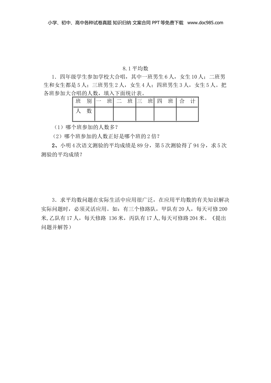 小学、初中、高中各种试卷真题知识归纳文案合同PPT等免费下载www.doc985.com8.1平均数1.四年级学生参加学校大合唱,其中一班男生6人,女生10人;二班男生和女生都是5人;三班男生2人,女生4人;四班男生3人,女生5人。把各班参加大合唱的人数,填入下面统计表。班别一班二班三班四班合计人数(1)哪个班参加的人数多?(2)哪个班参加的人数正好是哪个班的2倍?2、小明4次语文测验的平均成绩是89分,第5次测验得了94分,求5次测验的平均成绩?3.求平均数问题在实际生活中应用很广泛,在应用平均数的有关知识解决实际问题时,必须灵活应用。如:有三个修路队,甲队有20人,每天可修200米,乙队有17人,每天修路136米,丙队有17人,每天可修路204米。(提出问题并解答)小学、初中、高中各种试卷真题知识归纳文案合同PPT等免费下载www.doc985.com参考答案1、(1)四(一)班参加的人数最多。(2)四(一)班人数正好是四(四)班的2倍。2、90分3、(1)我们可以求三个队平均每天修多少米.200+136+204=540(米)540÷3=180(米)(2)我们也可以求三个队平均每人每天修路多少米。200+136+204=540(米)20+17+17=54(人)540÷54=10(米)