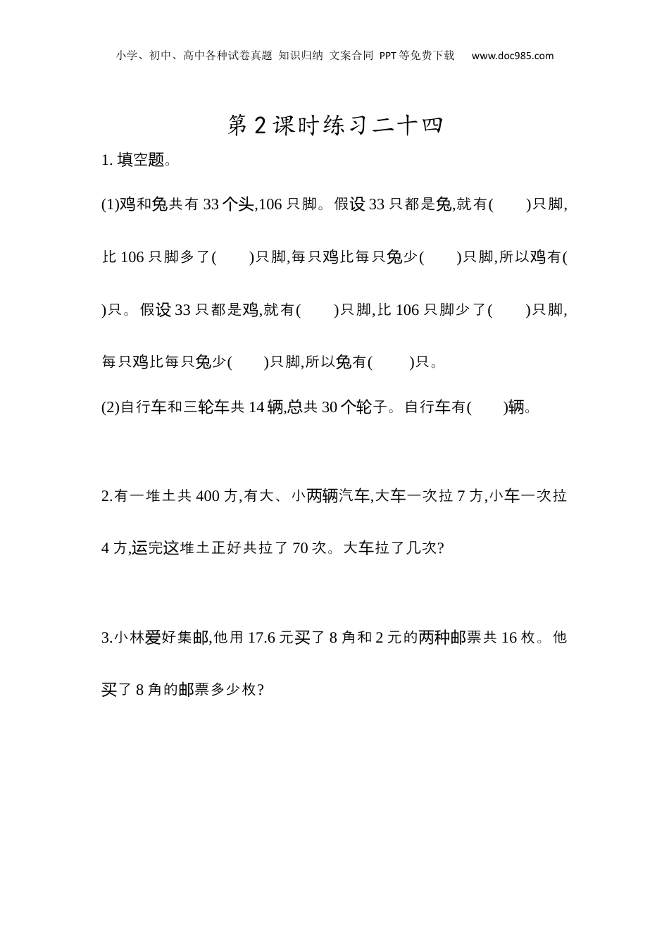 小学、初中、高中各种试卷真题知识归纳文案合同PPT等免费下载www.doc985.com第2课时练习二十四1.空。填题(1)和共有鸡兔33个头,106只脚。假设33只都是兔,就有()只脚,比106只脚多了()只脚,每只比每只少鸡兔()只脚,所以有鸡()只。假设33只都是鸡,就有()只脚,比106只脚少了()只脚,每只比每只少鸡兔()只脚,所以有兔()只。(2)自行和三共车轮车14辆,共总30子。自行有个轮车()。辆2.有一堆土共400方,有大、小汽两辆车,大一次拉车7方,小一次拉车4方,完堆土正好共拉了运这70次。大拉了几次车?3.小林好集爱邮,他用17.6元了买8角和2元的票共两种邮16枚。他了买8角的票多少枚邮?小学、初中、高中各种试卷真题知识归纳文案合同PPT等免费下载www.doc985.com答案提示1.(1)132262136640220(2)122.(400-70×4)÷(7-4)=40(次)3.17.6元=176角2元=20角(20×16-176)÷(20-8)=12(枚)小学、初中、高中各种试卷真题知识归纳文案合同PPT等免费下载www.doc985.com