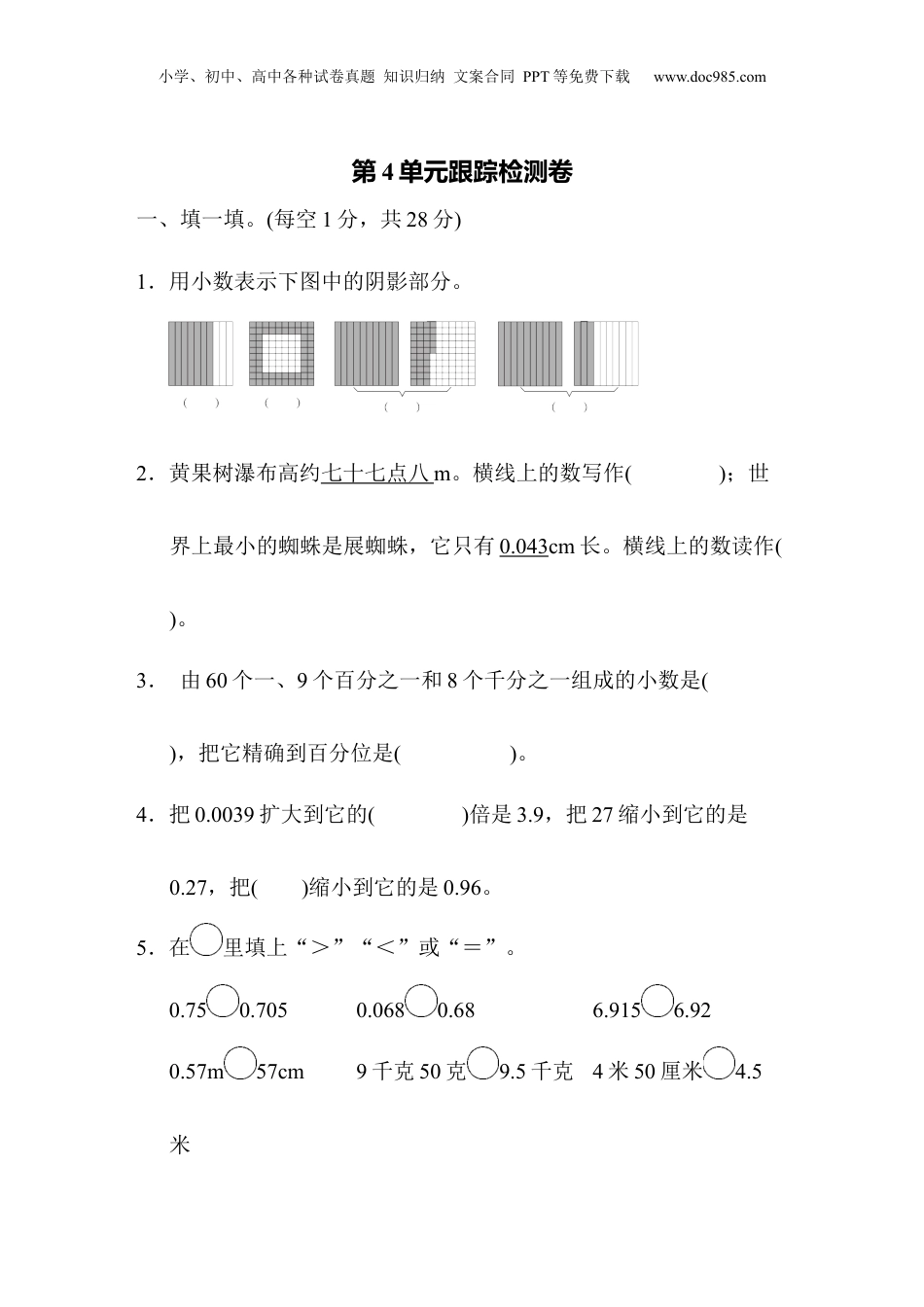 小学、初中、高中各种试卷真题知识归纳文案合同PPT等免费下载www.doc985.com第4单元跟踪检测卷一、填一填。(每空1分,共28分)1.用小数表示下图中的阴影部分。2.黄果树瀑布高约七十七点八m。横线上的数写作();世界上最小的蜘蛛是展蜘蛛,它只有0.043cm长。横线上的数读作()。3.由60个一、9个百分之一和8个千分之一组成的小数是(),把它精确到百分位是()。4.把0.0039扩大到它的()倍是3.9,把27缩小到它的是0.27,把()缩小到它的是0.96。5.在里填上“>”“<”或“=”。0.750.7050.0680.686.9156.920.57m57cm9千克50克9.5千克4米50厘米4.5米小学、初中、高中各种试卷真题知识归纳文案合同PPT等免费下载www.doc985.com6.1.8m=()cm5.09kg=()kg()g3.6m2=()dm26t5kg=()t2元9分=()元50公顷=()km27.国家统计局发布的第六次全国人口普查数据显示广东省常住人口达到104303132人。将横线上的数改写成用“万”作单位的数是(),用“四舍五入”法改写成用“亿”作单位的数是()(保留两位小数)。8.一个三位小数,保留两位小数后的近似数是4.00,这个三位小数最小是(),最大是()。二、辨一辨。(对的画“√”,错的画“×”)(每题1分,共5分)1.小数部分的最高位是十分位。()2.小数点的后面添上“0”或去掉“0”,小数的大小不变。()3.1.8和1.80大小相等,计数单位也相同。()4.大于2.1小于2.3的小数只有一个是2.2。()5.4.96的计数单位是0.01,再添4个这样的计数单位就是5。()三、选一选。(把正确答案的序号填在括号里)(每题2分,共10分)小学、初中、高中各种试卷真题知识归纳文案合同PPT等免费下载www.doc985.com1.10里面有()个0.01。A.100B.1000C.100002.7.808中,右边的“8”是左边的“8”的()。A.100倍B.1000倍C.3.甲、乙、丙三人100米短跑的成绩如下:甲:16.70秒乙:16.76秒丙:16.66秒()的速度最快。A.甲B.乙C.丙4.50□4000000≈50.0亿,□里能填的数字是()。A.0B.0~4C.5~95.下面各数中,与6最接近的是()。A.6.1B.6.02C.5.99四、按要求做一做。(共29分)1.夺红旗,算一算。(每题4分,共8分)小学、初中、高中各种试卷真题知识归纳文案合同PPT等免费下载www.doc985.com2.下列的小数各在哪两个相邻的整数之间?它们各近似于哪个整数?(每题3分,共9分)(1)<6.68<,近似于。(2)<11.72<,近似于。(3)<8.29<,近似于。3.按要求在里填数。(每题6分,共12分)(1)里最小能填几?0.5m>25cm1g>0.017kg12.3km2>1252公顷(2)里最大能填几?0.5m<35cm1g<0.019kg1.6m2<170dm2五、走进生活,解决问题。(1、2题每题5分,其余每题6分,共28分)1.吸烟不但有害健康,而且污染环境。每人每天少吸1支烟,一年小学、初中、高中各种试卷真题知识归纳文案合同PPT等免费下载www.doc985.com大约可少排放二氧化碳0.37kg。如果1000名烟民每人每天少吸1支烟,那么一年大约可少排放二氧化碳多少吨?2.植被能产生杀菌素,杀菌素可以净化空气。1m2的植被每天能产生杀菌素5.4g。1公顷的植被每天能产生多少千克杀菌素?3.某日人民币与外币的兑换价如下。4.一辆汽车10分钟行驶了6600m,照这样的速度,它从A地到B小学、初中、高中各种试卷真题知识归纳文案合同PPT等免费下载www.doc985.com地行驶了2小时,A、B两地相距多少千米?5.10kg小麦可以磨面粉8.3kg,照这样计算,1t小麦可以磨面粉多少吨?小学、初中、高中各种试卷真题知识归纳文案合同PPT等免费下载www.doc985.com答案一、1.0.70.641.351.32.77.8零点零四三3.60.09860.104.10009605.><<=<=6.1805903606.0052.090.57.10430.3132万1.04亿8.3.9954.004二、1.√2.×3.×4.×[点拨]大于2.1小于2.3的一位小数只有2.2,而小数却有无数个。5.√三、1.B2.C3.C4.A5.C四、1.30.9309030.930900584058.45.845842.(1)677(2)111212(3)8983.(1)385(2)286五、1.0.37×1000=370(kg)=0.37(t)小学、初中、高中各种试卷真题知识归纳文案合同PPT等免费下载www.doc985.com答:一年大约可少排放二氧化碳0.37t。2.1公顷=10000m25.4×10000=54000(g)=54(kg)答:1公顷的植被每天能产生54kg杀菌素。3.10000×1.1811=11811(港元)1000×0.1513=151.3(美元)答:1万元人民币可以兑换11811港元,1000元人民币可以兑换151.3美元。4.6600÷10=660(m)2小时=120分钟660×120=79200(m)=79.2(km)答:A、B两地相距79.2km。5.1t=1000kg8.3÷10=0.83(kg)0.83×1000=830(kg)=0.83(t)答:1t小麦可以磨面粉0.83t。