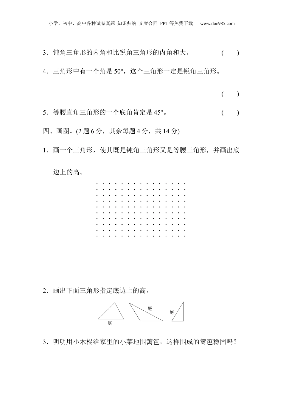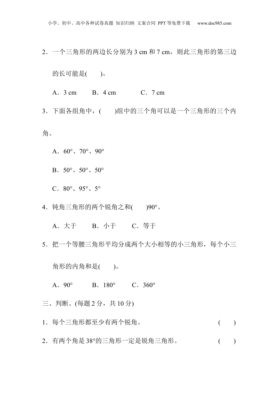 小学、初中、高中各种试卷真题知识归纳文案合同PPT等免费下载www.doc985.com第五单元过关检测卷一、填空。(每空1分,共14分)1.由三条()围成的图形(每相邻两条线段的端点相连)叫做三角形。一个三角形有()条边,()个角,()个顶点。三角形具有()性。2.三角形按角分类有()三角形、()三角形和()三角形;按边分类有()三角形和()三角形。3.一个等腰三角形两条边的长度分别是3cm、6cm,这个等腰三角形的周长是()cm。4.在许多建筑中,经常可以见到三角形,是因为三角形具有()。5.一个等腰三角形,一个底角的度数是顶角的2倍,这个三角形顶角的度数是()°,底角的度数是()°。二、选择。(每题3分,共15分)1.下面()组中的三根小棒不能拼成一个三角形。小学、初中、高中各种试卷真题知识归纳文案合同PPT等免费下载www.doc985.com2.一个三角形的两边长分别为3cm和7cm,则此三角形的第三边的长可能是()。A.3cmB.4cmC.7cm3.下面各组角中,()组中的三个角可以是一个三角形的三个内角。A.60°、70°、90°B.50°、50°、50°C.80°、95°、5°4.钝角三角形的两个锐角之和()90°。A.大于B.小于C.等于5.把一个等腰三角形平均分成两个大小相等的小三角形,每个小三角形的内角和是()。A.90°B.180°C.360°三、判断。(每题2分,共10分)1.每个三角形都至少有两个锐角。()2.有两个角是38°的三角形一定是锐角三角形。()小学、初中、高中各种试卷真题知识归纳文案合同PPT等免费下载www.doc985.com3.钝角三角形的内角和比锐角三角形的内角和大。()4.三角形中有一个角是50°,这个三角形一定是锐角三角形。()5.等腰直角三角形的一个底角肯定是45°。()四、画图。(2题6分,其余每题4分,共14分)1.画一个三角形,使其既是钝角三角形又是等腰三角形,并画出底边上的高。2.画出下面三角形指定底边上的高。3.明明用小木棍给家里的小菜地围篱笆,这样围成的篱笆稳固吗?小学、初中、高中各种试卷真题知识归纳文案合同PPT等免费下载www.doc985.com如果不稳固,你能帮他添上一根小木棍变得稳固吗?试着画一画。五、计算。(每题5分,共20分)1.2.3.在一个四边形中,∠1=∠2=105°,∠3=50°,∠4等于多少度?小学、初中、高中各种试卷真题知识归纳文案合同PPT等免费下载www.doc985.com4.如下图,已知∠1=110°,∠2=∠5,∠2、∠3、∠4、∠5分别是多少度?六、解决问题。(2、4题每题6分,其余每题5分,共27分)1.一个等腰三角形两条边的长度分别是3cm和8cm,它的第三条边长多少厘米?小学、初中、高中各种试卷真题知识归纳文案合同PPT等免费下载www.doc985.com2.将一根40cm长的木条截成整厘米长的木条3段,做一个三角形,怎样截能使3段木条围成三角形(请你举出三个例子)?小学、初中、高中各种试卷真题知识归纳文案合同PPT等免费下载www.doc985.com3.已知一个三角形(每条边长都是整厘米数)的周长是20cm,它的最长边的长度最大是几厘米?4.某同学把一块三角形的玻璃打碎成三小块,现在他要到玻璃店去配一块形状、大小完全一样的玻璃,那么最省事的办法是带第()块去。这是因为___________________________________小学、初中、高中各种试卷真题知识归纳文案合同PPT等免费下载www.doc985.com______________________________________________________。5.等腰三角形的一个内角是60°,其他两个内角各是多少度?这是()三角形。小学、初中、高中各种试卷真题知识归纳文案合同PPT等免费下载www.doc985.com答案一、1.线段三三三稳定2.直角锐角钝角不等边等腰3.154.稳定性5.3672二、1.A2.C3.C4.B5.B三、1.√2.×3.×4.×5.√四、1.略2.3.(答案不唯一)五、1.(180°-50°)÷2=65°2.180°-23°-37°=120°3.∠4=360°-105°×2-50°=100°4.∠2=∠5=70°∠3=∠4=20°六、1.8cm2.10cm、15cm、15cm13cm、15cm、12cm11cm、14cm、15cm(答案不唯一)小学、初中、高中各种试卷真题知识归纳文案合同PPT等免费下载www.doc985.com3.9cm4.③两角一边确定一个三角形5.其他两个内角都是60°。等边