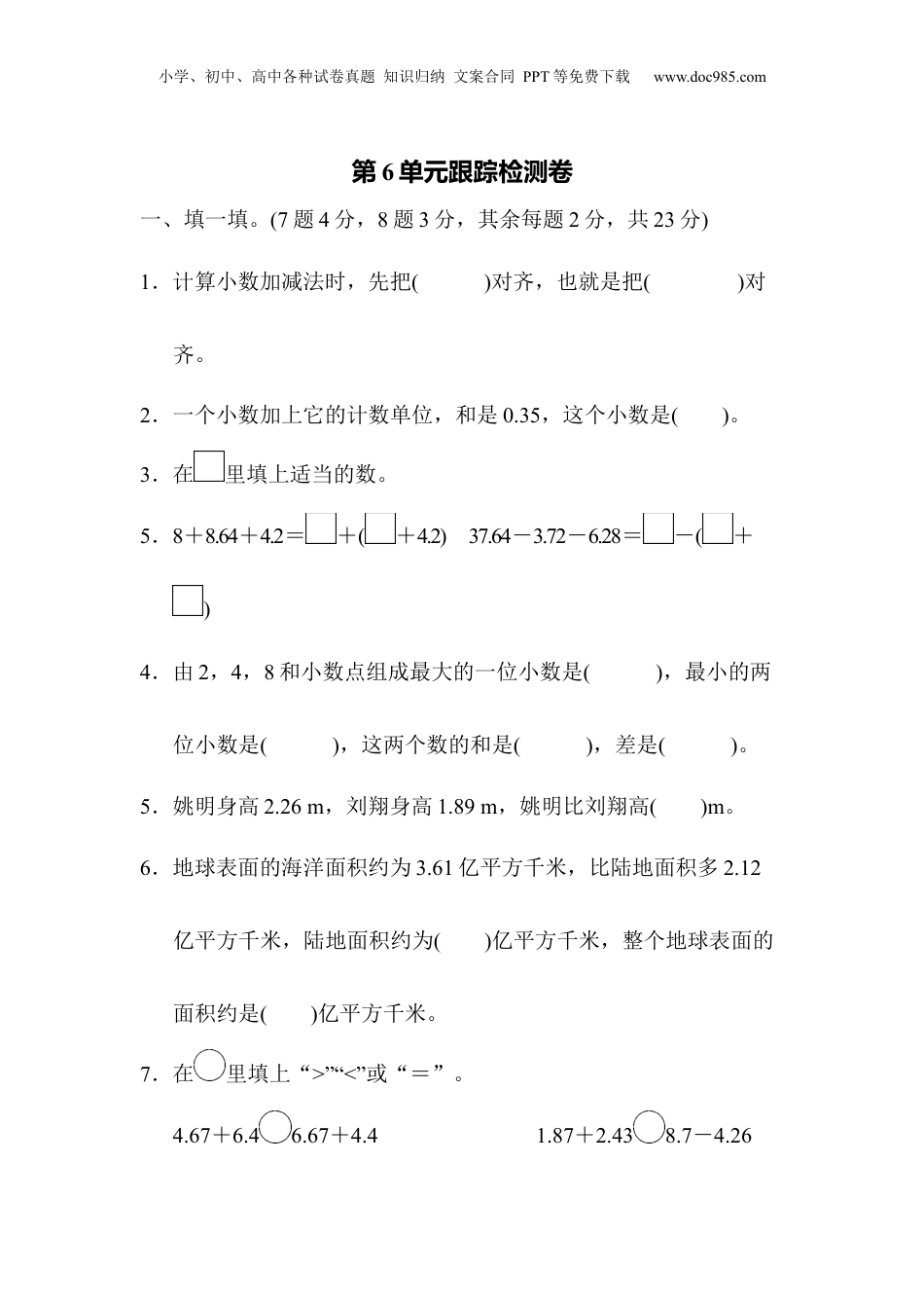 小学、初中、高中各种试卷真题知识归纳文案合同PPT等免费下载www.doc985.com第6单元跟踪检测卷一、填一填。(7题4分,8题3分,其余每题2分,共23分)1.计算小数加减法时,先把()对齐,也就是把()对齐。2.一个小数加上它的计数单位,和是0.35,这个小数是()。3.在里填上适当的数。5.8+8.64+4.2=+(+4.2)37.64-3.72-6.28=-(+)4.由2,4,8和小数点组成最大的一位小数是(),最小的两位小数是(),这两个数的和是(),差是()。5.姚明身高2.26m,刘翔身高1.89m,姚明比刘翔高()m。6.地球表面的海洋面积约为3.61亿平方千米,比陆地面积多2.12亿平方千米,陆地面积约为()亿平方千米,整个地球表面的面积约是()亿平方千米。7.在里填上“>”“<”或“=”。4.67+6.46.67+4.41.87+2.438.7-4.26小学、初中、高中各种试卷真题知识归纳文案合同PPT等免费下载www.doc985.com15.63-3.2-2.815.63-(3.2-2.8)+0.628.按规律填空。(1)0.3,0.6,0.9,1.2,(),()。(2)(),(),0.11,0.13,0.15。(3)10,(),0.1,0.01,()。9.两个数的差是6.98,如果被减数不变,减数增加1.2,那么差是()。10.当计算4.58加上一个一位小数时,小鹏错误地把数的末位对齐(和的小数点与4.58的小数点对齐。),结果得到8.73。正确的和是()。二、辨一辨。(对的画“√”,错的画“×”)(每题1分,共5分)1.整数加法的运算定律和减法的运算性质对于小数同样适用。()2.小数加减混合运算一定要先算加法,后算减法。()3.15.68-6.79+3.21=15.68-10=5.68()4.12.69+(4.57-2.69)=12.69-2.69+4.57=10+4.57=14.57(小学、初中、高中各种试卷真题知识归纳文案合同PPT等免费下载www.doc985.com)5.被减数减少3.6,减数增加3.6,差不变。()三、选一选。(把正确答案的序号填在括号里)(每题2分,共10分)1.两位小数减两位小数的结果不可能是()位小数。A.一B.两C.三2.103.5-(23.5+8.7)的简便算法是()。A.103.5-23.5+8.7B.103.5-23.5-8.7C.103.5-8.7-23.53.3.78+7.2+6.22=7.2+(3.78+6.22)运用了()。A.加法交换律B.加法结合律C.加法交换律和加法结合律4.两个数相加,一个数增加0.7,另一个数减少3.6,和()。A.增加4.3B.减少2.9C.增加2.95.甲数是42.78,比乙数少1.8,甲、乙两数的和是()。A.44.58B.83.76C.87.36四、计算挑战。(共33分)1.直接写出得数。(每题1分,共9分)小学、初中、高中各种试卷真题知识归纳文案合同PPT等免费下载www.doc985.com3.6+7=7.2+1.8=1.78-0.98=10.8-6.2-3.8=1.7+5.3=2.6-0.9+0.8=+=-=1-0.09-0.01=2.用竖式计算,带☆的要验算。(每题2分,共6分)7.89+6.2=☆17-13.73=9.4-7.73=3.计算下面各题,怎样简便就怎样算。(每题3分,共12分)10.75-4.98+9.2527.4-(7.4+3.15)-6.8515.65+1.98-2.650.297+0.36+5.64+3.0034.用小数计算下面各题。(每题3分,共6分)(1)2t40kg+860kg=(2)4km50m-1km320m=小学、初中、高中各种试卷真题知识归纳文案合同PPT等免费下载www.doc985.com五、走进生活,解决问题。(1题5分,其余每题6分,共29分)1.牛郎星距地球16.7光年,也就是牛郎星以光的速度运行到地球需要16.7年。织女星距地球25.3光年。如果牛郎和织女同时从各自的星球以光的速度赶到地球相会,那么牛郎要在地球上等多久才能见到织女?2.这本书的价钱是多少?3.小云的身高是1.37m,凳子高多少米?小学、初中、高中各种试卷真题知识归纳文案合同PPT等免费下载www.doc985.com4.把一根长20.5m的绳子剪成三段,第一、二段共长17.6m,第二、三段共长18.4m,第二段长多少米?5.家住北京的李老师周日在发货地为上海的网店购买了一些文具,该网店正在做如下的优惠活动。李老师想买下面这两件文具,店家能包邮(免快递费)吗?李老师一共要花多少钱?小学、初中、高中各种试卷真题知识归纳文案合同PPT等免费下载www.doc985.com答案一、1.小数点相同数位2.0.34[点拨]和是0.35,说明这个小数的计数单位是0.01。3.8.645.837.643.726.284.84.22.4886.6881.725.0.376.1.495.17.=<<>8.(1)1.51.8(2)0.070.09(3)10.0019.5...