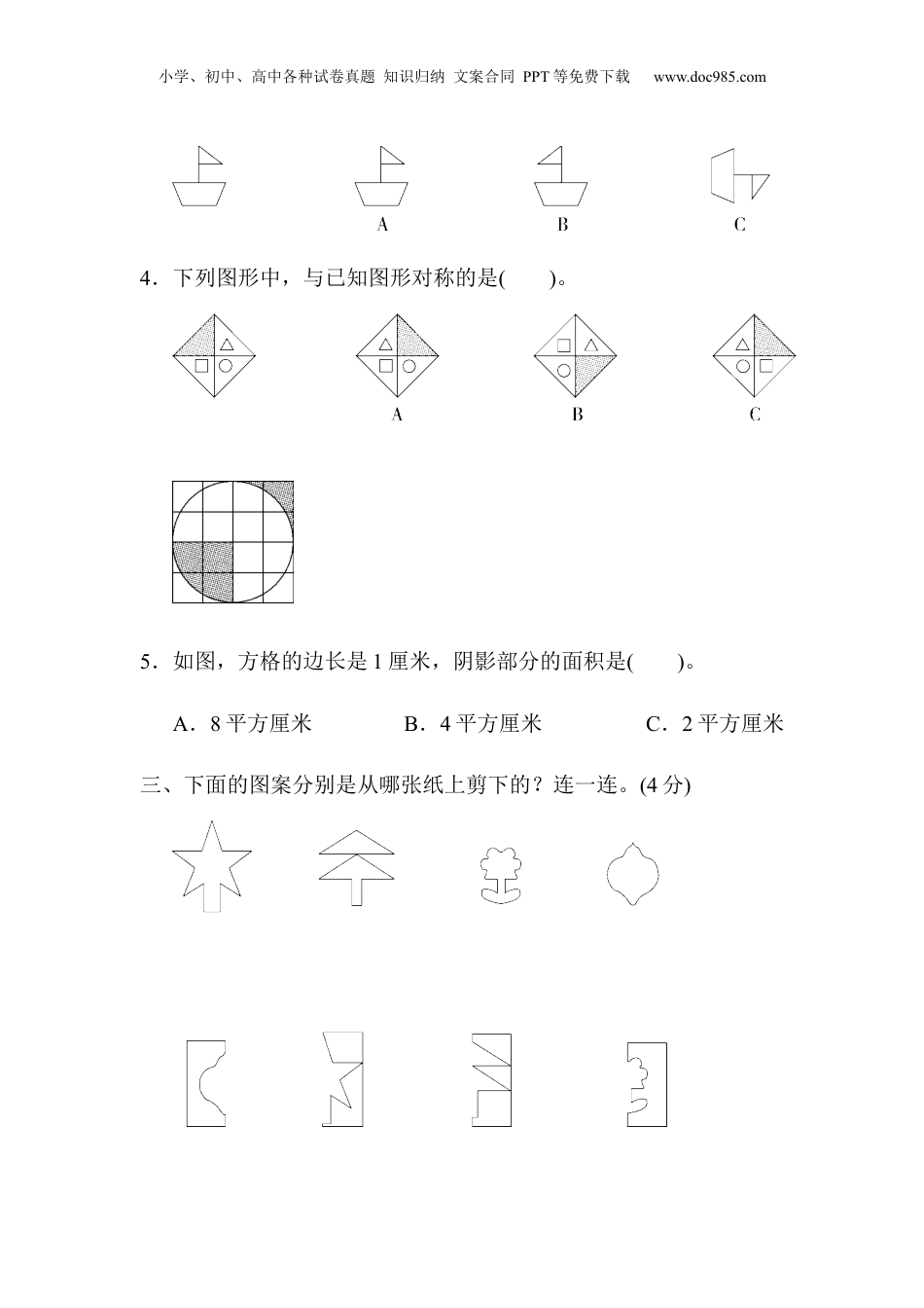 小学、初中、高中各种试卷真题知识归纳文案合同PPT等免费下载www.doc985.com第七单元达标测试卷一、填一填。(每空1分,共21分)1.如果一个图形沿着一条直线对折,两侧的图形能够完全重合,这样的图形就叫做(),这条直线就是()。对称点到对称轴的距离(),对称点的连线与对称轴()。2.平移时物体的()不变,()不变。3.图中点A和点A′到对称轴的距离都是()小格,点B和点B′到对称轴的距离都是()小格,点C的对称点是点()。4.(1)图形A向()平移()格得到图形B。(2)图形A向()平移()格得到图形C。(3)图形A先向()平移()格,再向()平移()格得到图形D。(4)图形A的对称图形是图形()。小学、初中、高中各种试卷真题知识归纳文案合同PPT等免费下载www.doc985.com5.下面图形中阴影部分各占整个图形的几分之几?二、选一选。(每题2分,共10分)1.下列三个汽车标志图案中,能用平移来分析其形成过程的是()2.下列图形中一定是轴对称图形的是()。A.梯形B.平行四边形C.圆3.下面图形中,可以通过左图平移得到的是()。小学、初中、高中各种试卷真题知识归纳文案合同PPT等免费下载www.doc985.com4.下列图形中,与已知图形对称的是()。5.如图,方格的边长是1厘米,阴影部分的面积是()。A.8平方厘米B.4平方厘米C.2平方厘米三、下面的图案分别是从哪张纸上剪下的?连一连。(4分)小学、初中、高中各种试卷真题知识归纳文案合同PPT等免费下载www.doc985.com四、根据对称轴,分别画出下面三个轴对称图形的另一半。(9分)五、画出已知图形的轴对称图形。(8分)六、先将已知图形向下平移4格,再向右平移10格,画出每次平移后的图形。(8分)七、解决下列问题。(1题6分,2题4分,共10分)1.我是小法官。小学、初中、高中各种试卷真题知识归纳文案合同PPT等免费下载www.doc985.com(1)长方形是轴对称图形,有4条对称轴(如下图)。()(2)如下图,五角星向右平移了3格。()☆―→☆(3)如下图,三角形ABC先向右平移3格,再向下平移1格得到三角形DEF。()2.平行四边形(如下图)是轴对称图形吗?如果是,请画出它的对称轴。八、按要求完成下面各题。(1、2题每题10分,其余每题5分,共小学、初中、高中各种试卷真题知识归纳文案合同PPT等免费下载www.doc985.com30分)1.画图题。(1)图形A向右平移5格得到图形B。(2)以直线a为对称轴,作图形B的轴对称图形,得到图形C。2.找出如图所示的每个正多边形的对称轴的条数,并填入表格中。你发现了什么?正多边形的边数345678对称轴的条数我发现:____________________________________________________。3.(变式题)先根据对称轴补全这个轴对称图形,再画出这个轴对称小学、初中、高中各种试卷真题知识归纳文案合同PPT等免费下载www.doc985.com图形向右平移6格后的图形。4.(变式题)如下图,小猫和小兔分别向哪个方向平移,平移几格才能吃到它们喜欢的食物?小学、初中、高中各种试卷真题知识归纳文案合同PPT等免费下载www.doc985.com答案一、1.轴对称图形对称轴相等互相垂直2.大小形状3.23C′4.(1)右10(2)下8(3)下8右6(或右6下8)(4)C5.二、1.C2.C3.A4.C5.B三、四、五、六、七、1.(1)×(2)×(3)×易错点拨:(1)错在认为长方形对角的连线所在的直线也是它的对称轴。一般地,长方形沿对角的连线所在的直线对折后,折痕小学、初中、高中各种试卷真题知识归纳文案合同PPT等免费下载www.doc985.com两侧的部分是不能完全重合的,长方形只有两条对称轴。(2)误解了平移的距离的数法,认为两颗五角星中间空的格数就是平移的距离。(3)错在将三角形ABC中的点C与三角形DEF中的点D作为平移前后的对应点来数平移的格数了。三角形ABC中的点A与三角形DEF中的点D是平移前后的对应点。2.平行四边形不是轴对称图形。易错点拨:本题易误认为平行四边形是轴对称图形,但实际动手折一折,发现找不到它的对称轴。只有沿着一条直线将图形对折后,直线两侧的部分能够完全重合的图形才是轴对称图形。八、1.2.345678正多边形有几条边就有几条对称轴3.4.小猫先向下平移3格,再向右平移3格;小兔先向右平移2格,再向上平移3格。(答案不唯一)