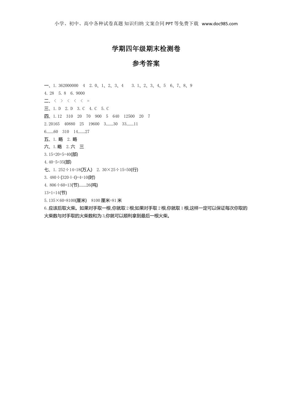 小学、初中、高中各种试卷真题知识归纳文案合同PPT等免费下载www.doc985.com学期四年级期末检测卷参考答案一、1.36200000042.0、1、2、3、43.1、2、3、4、56、7、8、94.285.86.9000二、<><<<=三、1.D2.D3.C4.C5.C四、1.1231020709005640125002072.201654088025196003……3033……116……6031014……27五、1.略2.略六、1.略2.六三3.15+20+5=40(部)4.40-5=35(部)七、1.252÷14=18(万人)2.30×25÷15=50(行)3.480÷(320÷4)+4=10(时)4.806÷60=13(节)……26(吨)13+1=14(节)5.135×60=8100(厘米)8100厘米=81米6.应该后取火柴。如果对手取一根,你就取2根;如果对手取2根,你就取1根,这样一定可以保证每次你取的火柴数与对手取的火柴数和为3,你就可以顺利拿到最后一根火柴。