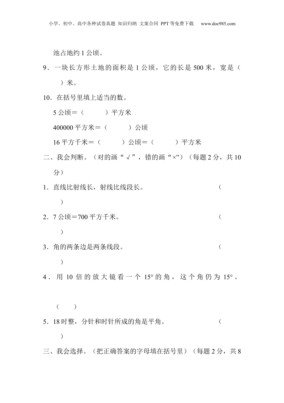 小学、初中、高中各种试卷真题知识归纳文案合同PPT等免费下载www.doc985.com教材过关卷(3)一、我会填空。(8、9题每题2分,其余每空1分,共30分)1.计量土地的面积常用()和()作单位。2.边长是100米的正方形的面积是()公顷;边长是1000米的正方形的面积是()平方千米。3.从一点引出两条()所组成的图形叫做角。这个点叫做角的(),这两条()叫做角的()。4.用量角器量角时,要把量角器的中心与角的()重合,0°刻度线与角的()重合。5.一条射线绕它的端点旋转()周,形成的角叫做平角,旋转()周,形成的角叫做周角。1周角=()平角=()直角6.在括号里填上适当的面积单位。一个操场的面积约是2()。一块果园的面积约是4()。一间屋子的面积约是30()。四川省的面积约是485000()。200个教室的面积约是1()。7.89°的角是()角,145°的角是()角,92°的角是()角。8.一个长方形游泳池长100米,宽25米,()个这样的游泳小学、初中、高中各种试卷真题知识归纳文案合同PPT等免费下载www.doc985.com池占地约1公顷。9.一块长方形土地的面积是1公顷,它的长是500米,宽是()米。10.在括号里填上适当的数。5公顷=()平方米400000平方米=()公顷16平方千米=()公顷=()平方米二、我会判断。(对的画“√”,错的画“×”)(每题2分,共10分)1.直线比射线长,射线比线段长。()2.7公顷=700平方千米。()3.角的两条边是两条线段。()4.用10倍的放大镜看一个15°的角,这个角仍为15°。()5.18时整,分针和时针所成的角是平角。()三、我会选择。(把正确答案的字母填在括号里)(每题2分,共8小学、初中、高中各种试卷真题知识归纳文案合同PPT等免费下载www.doc985.com分)1.()只有一个端点,()没有端点。A.线段B.射线C.直线2.以某个点为端点,可以画()条射线。A.1B.2C.无数3.小红用一副三角尺画出一个角,她画出的角可能是()。A.70°B.75°C.80°4.一个锐角和一个直角可以拼成一个()。A.钝角B.平角C.周角四、我会动手操作。(1、3题每题6分,其余每题8分,共28分)1.量出线段AB的长度,再以A为顶点,以射线AB为一条边画一个锐角,以C为顶点,以射线CB为一条边画一个钝角。()厘米2.(1)画出直线AB。(2)画出射线CB。(3)画出线段AC。(4)画好的图形中有几个锐角?几个钝角?小学、初中、高中各种试卷真题知识归纳文案合同PPT等免费下载www.doc985.com3.用合适的方法画出下面各度数的角。20°75°135°4.量出下面各角的度数,并计算,你发现了什么?∠1=()∠2=()∠3=()∠1+∠2+∠3=()我发现:。五、我会求角的度数。(1题9分,2题3分,共12分)1.已知∠1=120°,则∠2=(),∠3=(),∠4=()。小学、初中、高中各种试卷真题知识归纳文案合同PPT等免费下载www.doc985.com2.六、解决问题。(每题6分,共12分)1.一块长方形果园,长900米,宽400米,它的面积是多少公顷?如果每公顷施肥300千克,这块果园一共需施肥多少千克?2.一块周长为800米的正方形草地,它的面积是多少公顷?小学、初中、高中各种试卷真题知识归纳文案合同PPT等免费下载www.doc985.com答案一、1.公顷平方千米2.113.射线顶点射线边4.顶点一条边5.半一246.公顷公顷平方米平方千米公顷7.锐钝钝8.4[点拨]100×25=2500(平方米),2500×4=10000(平方米)=1公顷。9.20[点拨]1公顷=10000平方米,10000÷500=20(米)。10.5000040160016000000二、1.×2.×3.×4.√5.√三、1.BC2.C3.B4.A四、1.略。2.(1)(2)(3)略。(4)有4个锐角,3个钝角。3.4.35°110°35°180°三角形三个内角度数的和是180°五、1.60°60°120°2.125°六、1.900×400=360000(平方米)=36公顷小学、初中、高中各种试卷真题知识归纳文案合同PPT等免费下载www.doc985.com36×300=10800(千克)答:它的面积是36公顷,这块果园一共需施肥10800千克。2.800÷4=200(米)200×200=40000(平方米)=4公顷答:它的面积是4公顷。