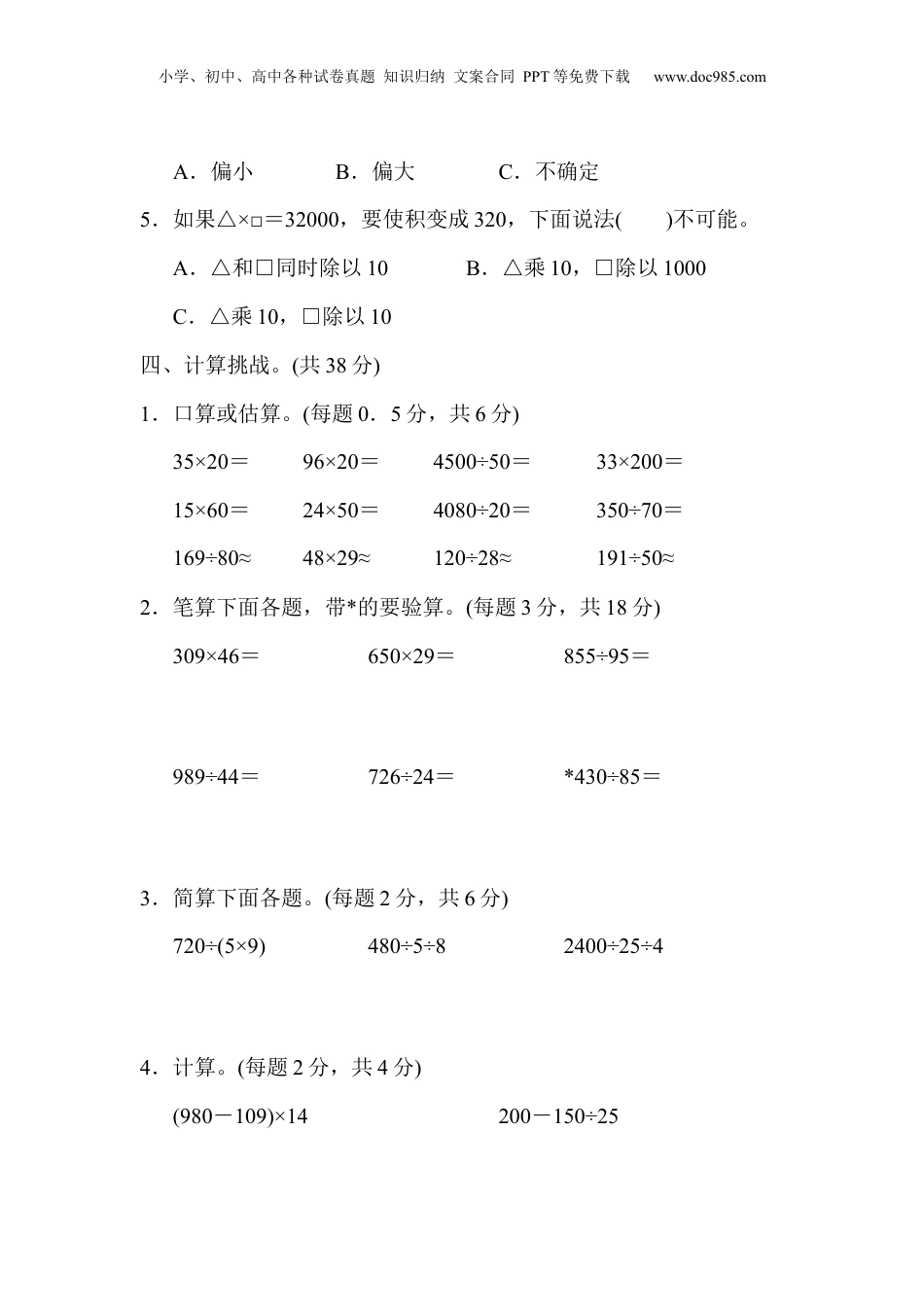 小学、初中、高中各种试卷真题知识归纳文案合同PPT等免费下载www.doc985.com模块过关(一)计算、大数的认识能力冲刺检测卷一、填一填。(每空1分,共27分)1.2018年平昌冬季奥运会的滑雪运动,吸引了全世界爱好滑雪运动的将近十二亿零八百万五千人通过电视转播收看,横线上的这个数写作(),省略亿位后面的尾数约是()。2.由7个十万、5个千、9个十和6个一组成的数是(),省略万位后面的尾数约是()。3.164的82倍是(),()的75倍是1500。4.600×50的积是()位数,积的末尾有()个0;5600÷80的商是()位数,商的末尾有()个0。5.用3个6和4个0组成七位数,只读一个零的数是(),读两个零的数是()。(各写出一个即可)6.已知A×B=360,如果A扩大为原来的5倍,那么积();如果B除以3,那么积应()。已知M÷N=50,如果M扩大为原来的5倍,那么商是();如果N扩大为原来的5倍,那么商是();如果M、N同时扩大为原来的5倍,那么商()。7.÷35=28……,余数最大是(),这时被除数是()。8.48÷32,要使商是一位数,最大填(),要使商是两位数,里最小填()。小学、初中、高中各种试卷真题知识归纳文案合同PPT等免费下载www.doc985.com9.()里最大能填几?()×50<42070×()<300420>()×7560×()<20788×()<680360>53×()二、我会辨。(对的画“√”,错的画“×”)(每题1分,共5分)1.唯一一个地跨两个大洲和东西半球的国家是俄罗斯,它的国土面积约是17075400平方千米,横线上的数是个准确数。()2.在数位顺序表中,两个计数单位之间的进率都是10。()3.38÷36,要使商是两位数,里最小填7。()4.1200×72=12×7200=120×720。()5.16×95的积是五位数。()三、选一选。(把正确答案的序号填在括号里)(每题1分,共5分)1.从右往左,第二个8表示()。A.8个百B.8个百万C.8个十万D.百万2.75020≈80万,里只能填()。A.7B.8C.93.一个数除以65,商是最小的两位数,余数是8,这个数是()。A.83B.6443C.530D.6584.用“四舍”法把除数看作整十数来试商,商容易()。小学、初中、高中各种试卷真题知识归纳文案合同PPT等免费下载www.doc985.comA.偏小B.偏大C.不确定5.如果△×□=32000,要使积变成320,下面说法()不可能。A.△和□同时除以10B.△乘10,□除以1000C.△乘10,□除以10四、计算挑战。(共38分)1.口算或估算。(每题0.5分,共6分)35×20=96×20=4500÷50=33×200=15×60=24×50=4080÷20=350÷70=169÷80≈48×29≈120÷28≈191÷50≈2.笔算下面各题,带*的要验算。(每题3分,共18分)309×46=650×29=855÷95=989÷44=726÷24=*430÷85=3.简算下面各题。(每题2分,共6分)720÷(5×9)480÷5÷82400÷25÷44.计算。(每题2分,共4分)(980-109)×14200-150÷25小学、初中、高中各种试卷真题知识归纳文案合同PPT等免费下载www.doc985.com5.下面的计算对吗?不对的请改正。(每题2分,共4分)五、解决问题。(每题5分,共25分)1.大雁从北方飞到南方,行程是16000千米,如果平均每天飞行752千米,那么一个月(按30天算)能飞到吗?2.小兰爬一座高532米的山,已经爬了20分钟,还有132米没爬。3.喜羊羊要上学了。喜羊羊从家到学校每分钟走60米,12分钟到学校。如果每分钟走80米,多少分钟到学校?4.22名救护人员和300名海底探险爱好者去海底探险,至少需要多小学、初中、高中各种试卷真题知识归纳文案合同PPT等免费下载www.doc985.com少条这样的船?5.体育老师带了418元买体育用品。跳绳9元/根,足球32元/个,乒乓球拍75元/副。(1)如果都买足球,最多能买多少个?还剩多少元?(2)体育老师用带的钱最多能买多少副乒乓球拍?如果用剩下的钱买跳绳,最多能买多少根?小学、初中、高中各种试卷真题知识归纳文案合同PPT等免费下载www.doc985.com答案一、1.120800500012亿2.70509671万3.13448204.五4两15.60660006060060(答案不唯一)6.扩大为原来的5倍除以325010不变7.3410148.239.845376二、1.×2.×3.×4.√5.×三、1.B2.C3.D4.B5.C四、1.70019209066009001200204521500442.1421418850922……2130……65……5(验算略)3.720÷(5×9)=720÷9÷5=80...