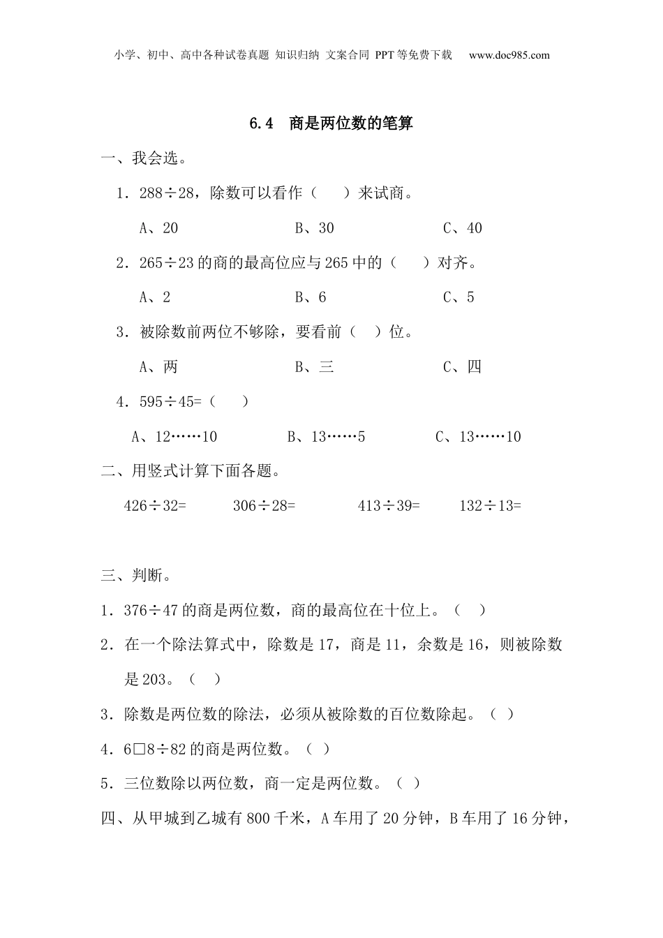 小学、初中、高中各种试卷真题知识归纳文案合同PPT等免费下载www.doc985.com6.4商是两位数的笔算一、我会选。1.288÷28,除数可以看作()来试商。A、20B、30C、402.265÷23的商的最高位应与265中的()对齐。A、2B、6C、53.被除数前两位不够除,要看前()位。A、两B、三C、四4.595÷45=()A、12……10B、13……5C、13……10二、用竖式计算下面各题。426÷32=306÷28=413÷39=132÷13=三、判断。1.376÷47的商是两位数,商的最高位在十位上。()2.在一个除法算式中,除数是17,商是11,余数是16,则被除数是203。()3.除数是两位数的除法,必须从被除数的百位数除起。()4.6□8÷82的商是两位数。()5.三位数除以两位数,商一定是两位数。()四、从甲城到乙城有800千米,A车用了20分钟,B车用了16分钟,小学、初中、高中各种试卷真题知识归纳文案合同PPT等免费下载www.doc985.comC车用了8分钟,那么A、B、C三辆车的速度分别是多少?答案:一、1.B2.B3.B4.C二、13……1010……2610……2310……2三、1.×2.√3.×4.×5.×四、A:800÷20=40(千米/时)B:800÷16=50(千米/时)C:800÷8=100(千米/时)