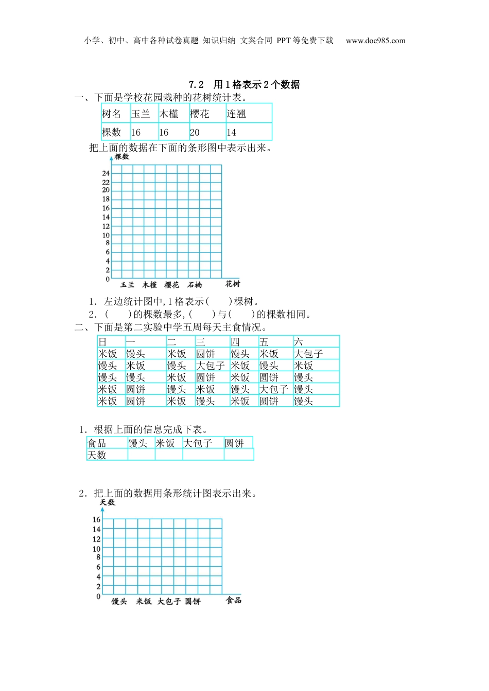 小学、初中、高中各种试卷真题知识归纳文案合同PPT等免费下载www.doc985.com7.2用1格表示2个数据一、下面是学校花园栽种的花树统计表。树名玉兰木槿樱花连翘棵数16162014把上面的数据在下面的条形图中表示出来。1.左边统计图中,1格表示()棵树。2.()的棵数最多,()与()的棵数相同。二、下面是第二实验中学五周每天主食情况。1.根据上面的信息完成下表。2.把上面的数据用条形统计图表示出来。日一二三四五六米饭馒头米饭圆饼馒头米饭大包子馒头米饭馒头大包子米饭馒头米饭馒头馒头米饭圆饼米饭圆饼馒头米饭圆饼馒头米饭馒头大包子馒头米饭圆饼米饭馒头米饭圆饼馒头食品馒头米饭大包子圆饼天数小学、初中、高中各种试卷真题知识归纳文案合同PPT等免费下载www.doc985.com答案:一、图略1.22.樱花玉兰木槿二、1.1313362.略
