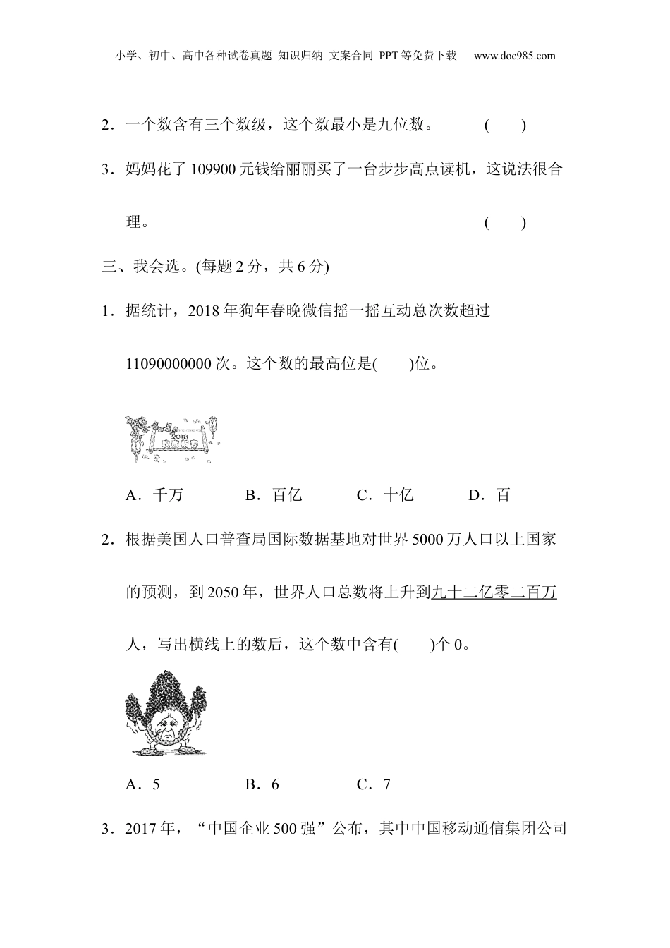 小学、初中、高中各种试卷真题知识归纳文案合同PPT等免费下载www.doc985.com周测培优卷1大数的读与写的能力检测卷一、我会填。(每空2分,共38分)1.10个十万是(),10个一千万是(),10个()是一百亿,()是10个一百万。2.四千五百二十九亿三千万零六百写作(),它是由()个亿、()个万和()个一组成的。3.由7个十亿、8个百万、3个千和5个一组成的数写作(),读作()。4.亿级包括的数位有()、()、()和()。5.最小的九位数是(),最大的八位数是(),它们相差()。6.与59999相邻的两个数是()和()。二、我会辨。(每题2分,共6分)1.8个万和3个百组成的数是80000300。()小学、初中、高中各种试卷真题知识归纳文案合同PPT等免费下载www.doc985.com2.一个数含有三个数级,这个数最小是九位数。()3.妈妈花了109900元钱给丽丽买了一台步步高点读机,这说法很合理。()三、我会选。(每题2分,共6分)1.据统计,2018年狗年春晚微信摇一摇互动总次数超过11090000000次。这个数的最高位是()位。A.千万B.百亿C.十亿D.百2.根据美国人口普查局国际数据基地对世界5000万人口以上国家的预测,到2050年,世界人口总数将上升到九十二亿零二百万人,写出横线上的数后,这个数中含有()个0。A.5B.6C.73.2017年,“中国企业500强”公布,其中中国移动通信集团公司小学、初中、高中各种试卷真题知识归纳文案合同PPT等免费下载www.doc985.com的利润为124699000000元,这个数中的“6”表示()。A.6万B.6个万C.6亿D.6个亿四、按要求解决。(共22分)1.读出下面横线上的数。(每题3分,共6分)世界第一大洲亚洲的总面积约为44579000平方千米。读作:___________________________________________________地球赤道的周长约40075700米。读作:___________________________________________________2.写出下面各数。(每题2分,共4分)水星和太阳的距离约是五千七百九十一万千米。写作:______________________月球离地球近地点距离约为三十六万三千三百千米。小学、初中、高中各种试卷真题知识归纳文案合同PPT等免费下载www.doc985.com写作:______________________3.读信息,用“——”画出大数并写出来。(12分)《穹顶之下》是一部由柴静自费拍摄的雾霾深度调查纪录片。2月28日视频公布后,引爆了公众对雾霾的讨论。据不完全统计,截至3月2日上午9点30分,《穹顶之下》在国内各大视频网站的总播放量即将突破两亿次。其中,爱奇艺平台点击量约为一千一百三十四万次,优酷平台点击量约为两千九百五十万次,乐视网点击量约为一千二百六十四万次,腾讯视频点击量约为一亿三千二百万次,凤凰视频点击量约为四百八十八万次。五、比大小。(共22分)1.在里填上“>”“<”或“=”。(每题1分,共8分)10个一千万一亿100个一万100000小学、初中、高中各种试卷真题知识归纳文案合同PPT等免费下载www.doc985.com936800009300000035556355502003012亿4050万405000050亿5000010000100000000010亿2.李爷爷家的果园今年产量如下:(6分)把这三种水果的产量按从多到少的顺序排列:_______________________________________________________3.里最大能填几?(每题2分,共8分)43560>4893780050>7950632006>320054689>5489六、照样子,写一写,画一画。(6分)小学、初中、高中各种试卷真题知识归纳文案合同PPT等免费下载www.doc985.com小学、初中、高中各种试卷真题知识归纳文案合同PPT等免费下载www.doc985.com答案一、1.一百万一亿十亿一千万2.452930000600452930006003.7008003005七十亿零八百万三千零五4.亿位十亿位百亿位千亿位5.1000000009999999916.6000059998二、1.×2.√3.×[点拨]步步高点读机没这么贵。三、1.B2.C3.D四、1.四千四百五十七万九千四千零七万五千七百2.579100003633003.两亿200000000一千一百三十四万11340000两千九百五十万29500000一千二百六十四万12640000一亿三千二百万132000000小学、初中、高中各种试卷真题知识归纳文案合同PPT等免费下载www.doc985.com四百八十八万4880000五、1.=>>><><=2.3054300千克>2756000千克>1139800千克3.2[点拨]先考虑3,3不行,那么最大就填2。755六、四千万、八万和五百40000000+80000+500画图略