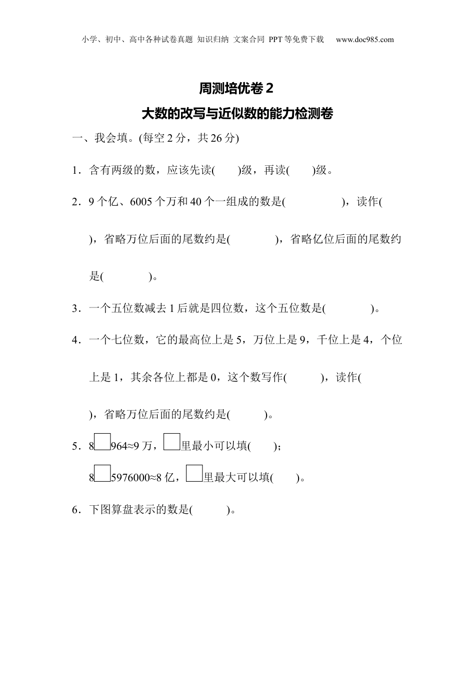 小学、初中、高中各种试卷真题知识归纳文案合同PPT等免费下载www.doc985.com周测培优卷2大数的改写与近似数的能力检测卷一、我会填。(每空2分,共26分)1.含有两级的数,应该先读()级,再读()级。2.9个亿、6005个万和40个一组成的数是(),读作(),省略万位后面的尾数约是(),省略亿位后面的尾数约是()。3.一个五位数减去1后就是四位数,这个五位数是()。4.一个七位数,它的最高位上是5,万位上是9,千位上是4,个位上是1,其余各位上都是0,这个数写作(),读作(),省略万位后面的尾数约是()。5.8964≈9万,里最小可以填();85976000≈8亿,里最大可以填()。6.下图算盘表示的数是()。小学、初中、高中各种试卷真题知识归纳文案合同PPT等免费下载www.doc985.com二、我会辨。(每题2分,共6分)1.每级末尾不管有几个0,都只读一个零。()2.一个物体也没有,用0表示,因此,0不是自然数。()3.9千多的数一定大约是1万。()三、我会选。(每题2分,共6分)1.截至某年某月中国青少年网民规模达297000000人。改写成用“万”作单位的数是()。A.297万B.29700C.29700万2.下面的数中,最接近10亿的是()。A.九亿九千万B.十亿九千万C.十亿零一万3.一个数省略万位后面的尾数约是10万,这个数最大是()。小学、初中、高中各种试卷真题知识归纳文案合同PPT等免费下载www.doc985.comA.99999B.104999C.95000四、按要求解决。(共36分)1.把下面横线上的数改写。(每题6分,共12分)“神舟十一号”每小时约飞行28000000米。(改写成用“万”作单位的数)_______________________________________________________太湖是我国五大淡水湖之一,面积约为2400000000平方米。(改写成用“亿”作单位的数)_______________________________________________________2.先写出横线上的数,再省略亿位后面的尾数,写出它们的近似数。(每题4分,共12分)(1)2016年全国粮食总产量约为六亿一千六百二十四万吨。写作:______________≈________(2)截至2016年9月底,中国移动客户总数达十三亿一千六百万户。写作:______________≈________(3)《2014年世界人口状况报告》预测:到2050年印度的人口将达小学、初中、高中各种试卷真题知识归纳文案合同PPT等免费下载www.doc985.com到十六亿一千四百万人,成为世界第一人口大国。写作:______________≈________3.写出下面各数,再省略亿位后面的尾数,求出近似数。(每题4分,共12分)七亿零五百九十九万五千七百零三写作:______________≈________九亿七千零二十万写作:______________≈________二十八亿九千八百万写作:______________≈________五、我会灵活解决问题。(共26分)1.下面是李老师到某办公用品商场购买办公用品的收据,请计算出相应的金额,再用计算器验算一下。(10分)小学、初中、高中各种试卷真题知识归纳文案合同PPT等免费下载www.doc985.com2.我会推理。(每空2分,共6分)小明写作业时不小心把墨水洒在了爸爸的名片上,小明只记得这个电话号码是一个七位数,其中有一个数字是4,并且这个号码省略万位后面的尾数约等于600万。(1)看图可知,墨水遮住了()个数字,其中有一个数字是()。(2)你推理出这个电话号码是()。3.用计算器计算前面三道题,再根据规律写出后面三道题的得数。(每题1分,共6分)小学、初中、高中各种试卷真题知识归纳文案合同PPT等免费下载www.doc985.com19+9×9=118+98×9=1117+987×9=11116+9876×9=111115+98765×9=1111114+987654×9=4.我会巧算。(4分)12+14+16+18+82+84+86+88小学、初中、高中各种试卷真题知识归纳文案合同PPT等免费下载www.doc985.com答案一、1.万个2.960050040九亿六千零五万零四十96005万10亿3.100004.5094001五百零九万四千零一509万5.546.62196二、1.×2.×3.×三、1.C2.C3.B[点拨]在“舍”中产生最大数,因此千位是4;又紧扣关键词“最大”,因此百位、十位、个位都是9。四、1.2800万24亿2.(1)6162400006亿(2)131600000013亿(3)161400000016亿3.7059957037亿97020000010亿小学、初中、高中各种试卷真题知识归纳文案合同PPT等免费下载www.doc985....