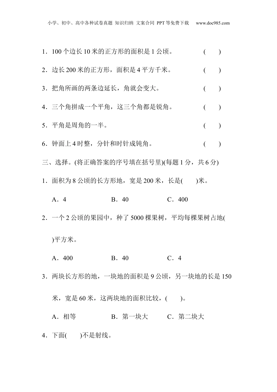 小学、初中、高中各种试卷真题知识归纳文案合同PPT等免费下载www.doc985.com第二、三单元过关检测卷一、填空。(每空1分,共27分)1.在括号里填上适当的单位名称。(1)某市游乐园的占地面积约是3()。(2)学校舞蹈厅的占地面积是100()。(3)北京市的占地面积约是16410()。(4)清华大学校园的面积约是392()。2.在括号里填上适当的数。16公顷=()平方米350000平方米=()公顷7公顷500平方米=()平方米6000公顷=()平方千米18平方千米=()公顷=()平方米3.在里填上“>”“<”或“=”。47公顷4700平方米8000公顷80平方千米2平方千米2000公顷小学、初中、高中各种试卷真题知识归纳文案合同PPT等免费下载www.doc985.com4.∠1与∠2拼成一个直角,若∠1=38°,则∠2=()°;∠3和∠4拼成一个平角,若∠3=75°,则∠4=()°。5.120°的角比直角大()°,比平角小()°。6.队列练习时,原地向右转,转过一个()的角;原地向后转,转过一个()的角。7.右图中,有()个锐角,()个钝角,()个直角。8.一个直角分成两个角,这两个角是()角;一个平角可以由一个锐角和一个()角组成。9.一个长方形苗圃园占地面积是2000平方米,()个这样的苗圃园的占地面积是1公顷,()个这样的苗圃园的占地面积是1平方千米。10.一个长方形鱼池,长700米,宽300米,这个鱼池的占地面积是()公顷。二、判断。(对的画“√”,错的画“×”)(每题1分,共6分)小学、初中、高中各种试卷真题知识归纳文案合同PPT等免费下载www.doc985.com1.100个边长10米的正方形的面积是1公顷。()2.边长200米的正方形,面积是4平方千米。()3.把角所画的两条边延长,角就会变大。()4.三个角拼成一个平角,这三个角都是锐角。()5.平角是周角的一半。()6.钟面上4时整,分针和时针成钝角。()三、选择。(将正确答案的序号填在括号里)(每题1分,共6分)1.面积为8公顷的长方形地,宽是200米,长是()米。A.4B.40C.4002.一个2公顷的果园中,种了5000棵果树,平均每棵果树占地()平方米。A.400B.40C.43.两块长方形的地,一块地的面积是9公顷,另一块地的长是150米,宽是60米,这两块地的面积比较,()。A.相等B.第一块大C.第二块大4.下面()不是射线。小学、初中、高中各种试卷真题知识归纳文案合同PPT等免费下载www.doc985.comA.米尺B.角的边C.手电筒的光5.从3:00到3:15,分针转过了()度。A.15B.60C.906.用一副三角尺不能拼出()的角。A.15°B.20°C.135°四、计算下列角的度数。(每题2分,共6分)1.如图,已知∠1=95°,求∠2的度数。2.如图,已知∠1=75°,求∠2、∠3、∠4的度数。3.如图,求∠1、∠2的度数。五、动手操作。(1题3分,2、3题每题8分,其余每题4分,共27小学、初中、高中各种试卷真题知识归纳文案合同PPT等免费下载www.doc985.com分)1.过点A画一条射线,并在上面截取一条线段AB。2.量出下面各角的度数,并写出它是什么角。(1)∠1=()是()角。(2)∠2=()是()角。(3)∠3=()是()角。(4)∠4=()是()角。3.选择合适的方法画出下面各角。35°135°140°55°小学、初中、高中各种试卷真题知识归纳文案合同PPT等免费下载www.doc985.com4.画一画。按要求在各图中添加一条射线。5.数一数。(1)下图中有几条线段?(2)下图中有几个角?()条()个六、解决问题。(1、2题每题5分,其余每题6分,共28分)1.张伯伯绕着一个正方形广场走一圈,正好是400米,这个广场的占地面积是多少公顷?2.一架直升机在一片长4千米,宽3千米的长方形树林上空喷洒药小学、初中、高中各种试卷真题知识归纳文案合同PPT等免费下载www.doc985.com水,这片树林的面积是多少平方千米?合多少公顷?3.有一块土地的形状如下图,这块土地的面积是多少公顷?4.将一张正方形纸沿AB折叠后如图所示,如果∠1=20°,那么∠2是多少度?如果∠2=20°,那么∠1是多少度?5.明明将一张长方形纸折成如图所示的形状,已知∠2=70°,求∠1的度数。小学、初中、高中各种试卷真题知识归纳文案合同PPT等免费下载www.doc985.com答案一、1.(1)公顷(2)平方米(3)平方千米(4)公顷2.1600003570500601800180000003.>=<4.52105...