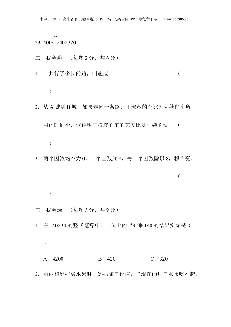 小学、初中、高中各种试卷真题知识归纳文案合同PPT等免费下载www.doc985.com周测培优卷7三位数乘两位数的应用能力检测卷一、我会填。(5题每空2分,其余每空1分,共20分)1.一辆汽车每小时行80千米,80千米是这辆汽车的(),可以写成(),读作()。2.买5张办公桌花了8000元。是已知()和(),可以求()。(填“单价”“总价”或“数量”)3.已知速度和时间,可以求(),它们的等量关系是()。4.已知a×24=4008,那么a×12=();a×72=()。5.在里填上“>”“<”或“=”。130×3013×300150×70140×7016×20030×150140×80150×70小学、初中、高中各种试卷真题知识归纳文案合同PPT等免费下载www.doc985.com23×40040×320二、我会辨。(每题2分,共6分)1.一共行了多长的路,叫速度。()2.从A城到B城,如果走同一条路,王叔叔的车比刘阿姨的车所用的时间少,这说明王叔叔的车的速度比刘阿姨的快。()3.两个因数均不为0,一个因数乘8,另一个因数除以8,积不变。()三、我会选。(每题3分,共9分)1.在140×34的竖式笔算中,十位上的“3”乘140的结果实际是()。A.4200B.420C.3202.丽丽和妈妈买水果时,妈妈随口说道:“现在的进口水果吃不起,小学、初中、高中各种试卷真题知识归纳文案合同PPT等免费下载www.doc985.com真是太贵了!”妈妈的说法指的是()高。A.总价B.单价C.数量3.亮亮骑自行车的速度是300米/分,照这样计算,他1小时的骑行路程是()。A.1800米B.18000米C.300米四、计算挑战。(共18分)1.直接写出得数。(每题1分,共6分)25×20=4200÷2=150+30=80×50=400×5=240÷4=2.笔算下面各题。(每题3分,共12分)248×19=607×34=小学、初中、高中各种试卷真题知识归纳文案合同PPT等免费下载www.doc985.com930×27=105×12=五、我会编题。(12分)把相关联的两个条件连在一起,再选择其中一组,编一道题并解答。我选择第()组条件编题(填序号),所用的数量关系式是()。编问题:_______________________________________________________列式解答:小学、初中、高中各种试卷真题知识归纳文案合同PPT等免费下载www.doc985.com_______________________________________________________六、我会应用。(每题7分,共35分)1.2015年9月3日是纪念抗日战争胜利70周年中国举行大阅兵的日子,徒步方队从天安门东华表走到西华表,每人要走128步正步,每步长75厘米。每人走正步一共走了多少厘米?相当于多少米?2.希望超市卖出的文具如下。(1)每种文具各卖了多少元?小学、初中、高中各种试卷真题知识归纳文案合同PPT等免费下载www.doc985.com(2)一共卖了多少元?3.买3台电扇一共花了621元,照这样计算,再买16台这样的电扇,还要花多少元钱?4.这辆车在平原和山区各行了3小时,最后到达山顶。这段路长多少千米?5.一艘轮船从甲港开往乙港,速度是45千米/时,8小时到达。原小学、初中、高中各种试卷真题知识归纳文案合同PPT等免费下载www.doc985.com路返回时需要6小时,这艘轮船原路返回时每小时多行多少千米?小学、初中、高中各种试卷真题知识归纳文案合同PPT等免费下载www.doc985.com答案一、1.速度80千米/时80千米每时2.总价数量单价3.路程速度×时间=路程4.200412024[点拨]根据一个因数不变,另一个因数怎么变,积跟着发生同样的变化来简便计算。24÷(2)=12,所以4008÷2=2004;24×(3)=72,所以4008×3=12024。5.=><><二、1.×2.√3.√三、1.A2.B3.B四、1.500210018040002000602.471220638251101260五、连线略②数量×单价=总价一共多少元?4×5=20(元)答:一共20元。小学、初中、高中各种试卷真题知识归纳文案合同PPT等免费下载www.doc985.com[点拨]除了连线,其他答案不唯一。六、1.128×75=9600(厘米)=96米答:每人走正步一共走了9600厘米,相当于96米。2.(1)三角尺:12×158=1896(元)计算器:48×113=5424(元)钢笔:27×236=6372(元)答:三角尺卖了1896元,计算器卖了5424元,钢笔卖了6372元。(2)1896+5424+6372=13692(元)答:一共卖了13692元。3.621÷3×16=...