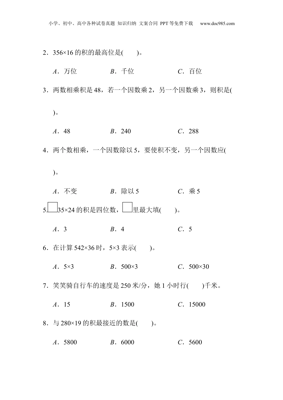 小学、初中、高中各种试卷真题知识归纳文案合同PPT等免费下载www.doc985.com第四单元过关检测卷一填空。(1、6、7题每空0.5分,其余每空1分,共22分)1.口算24×400时,先算()×()=(),再在积的末尾添上()个0。2.200个35是();207的12倍是()。3.285×72的积是()位数,个位上的数字是()。4.150×30的积的末尾有()个0,106×50的积的末尾有()个0。5.已知a×b=120,若a乘2,b不变,则积是();若a不变,b除以3,则积是();若a乘4,b除以4,积是()。6.在里填上“>”“<”或“=”。24×4033×30120×32240×17180×2519×260960×5320×157.根据250×32=8000,直接写出下面各算式的积。250×64=()250×16=()25×32=()250×320=()125×64=()125×16=()小学、初中、高中各种试卷真题知识归纳文案合同PPT等免费下载www.doc985.com8.“复兴号”高速列车每小时可行350千米,它的速度可记作();一辆小汽车的速度是120千米/时,这辆小汽车每分钟行()米。9.一张足球赛门票180元,程老师买了5张门票需要多少元钱?题中已知()和(),求()。10.两个因数的积是50,其中一个因数乘20,另一个因数除以5,积是()。二判断。(对的画“√”,错的画“×”)(每题1分,共5分)1.188×79的积一定比16000小。()2.三位数乘两位数的积可能是四位数,也可能是五位数。()3.一个因数变大,另一个因数变小,积不变。()4.路程一定时,用的时间越少,速度就越快。()5.122×36=(122×2)×(36÷2)()三选择。(将正确答案的序号填在括号里)(每题1分,共8分)1.与480×40的积一样的算式是()。A.48×4B.24×800C.240×20小学、初中、高中各种试卷真题知识归纳文案合同PPT等免费下载www.doc985.com2.356×16的积的最高位是()。A.万位B.千位C.百位3.两数相乘积是48,若一个因数乘2,另一个因数乘3,则积是()。A.48B.240C.2884.两个数相乘,一个因数除以5,要使积不变,另一个因数应()。A.不变B.除以5C.乘55.35×24的积是四位数,里最大填()。A.3B.4C.56.在计算542×36时,5×3表示()。A.5×3B.500×3C.500×307.笑笑骑自行车的速度是250米/分,她1小时行()千米。A.15B.1500C.150008.与280×19的积最接近的数是()。A.5800B.6000C.5600小学、初中、高中各种试卷真题知识归纳文案合同PPT等免费下载www.doc985.com四计算。(1题10分,2题6分,3题12分,共28分)1.直接写得数。50×70=140×30=250×40=16×400=80×50=200×17=220×4=72×30=52×30=75×20=2.下面的计算对吗?若不对,请改正。(1)改正(2)(3)小学、初中、高中各种试卷真题知识归纳文案合同PPT等免费下载www.doc985.com3.列竖式计算。154×27=48×315=240×70=428×25=306×34=502×45=五解决问题。(1、2、3题每题4分,其余每题5分,共37分)1.下面是九九体育用品商店本周售出商品记录单。请将下面的表格补充完整。商品编号商品名称数量单位单价/元金额/元0321篮球25个1650412足球16个108小学、初中、高中各种试卷真题知识归纳文案合同PPT等免费下载www.doc985.com0329羽毛球拍34副205合计————————2.新风小学要为一年级新生订购校服,每套76元,学校一年级共有新生228人,订购这些校服一共需要多少元?3.一份稿件有4600个字,小玲每分钟打字106个,她45分钟能打完这份稿件吗?4.小东从家走到学校要22分钟,他步行的速度大约是55米/分,小东从家到学校往返一次大约有多少米?5.伊利牛奶厂每天向超市运送4500箱牛奶。今天已经运送了21车,小学、初中、高中各种试卷真题知识归纳文案合同PPT等免费下载www.doc985.com每车运160箱,还有多少箱没有运?6.一艘旅游船从甲港顺水航行到乙港速度是24千米/时,6小时到达,返回时逆水航行,多用了2小时,这艘旅游船返回时的速度是多少千米/时?7.张老师买了3个篮球用了132元,他想再买12个这样的篮球,需要多少钱?(你能用两种方法解答吗?)8.教师节,郭老师带了500元钱,要为全组12位老师每人选购一束同样的花,有多少种购买方案,分别还剩多少钱?小学、初中、高中各种试卷真题知识归纳文案合同PPT等免费下载www.doc985.com小学、初...