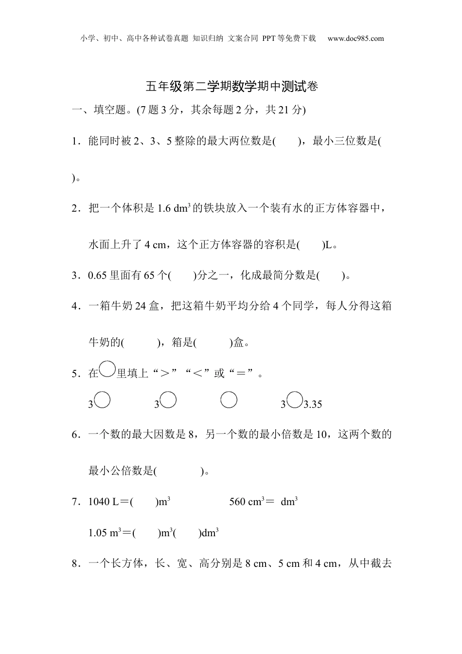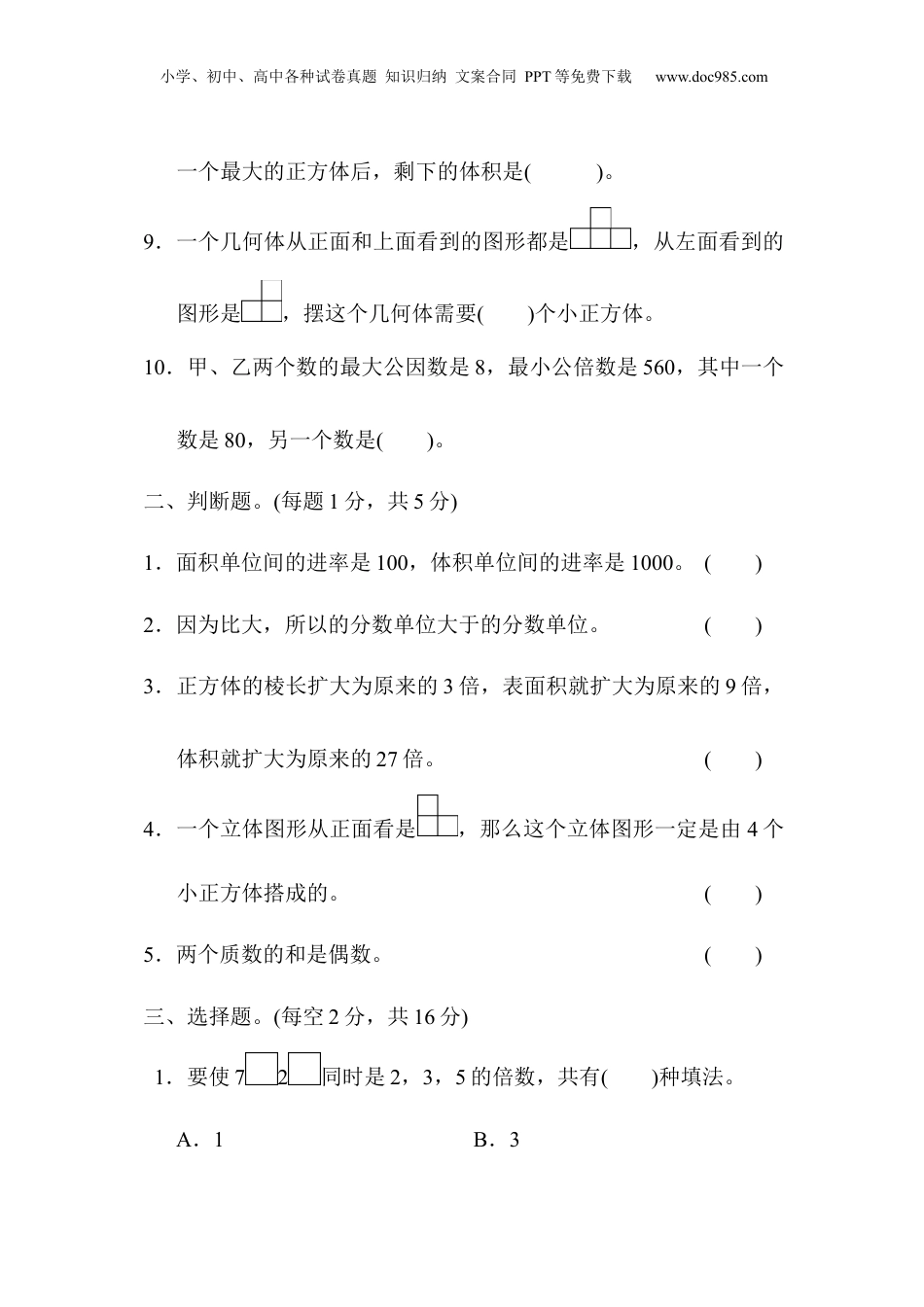 小学、初中、高中各种试卷真题知识归纳文案合同PPT等免费下载www.doc985.com五年第二期期中卷级学数学测试一、填空题。(7题3分,其余每题2分,共21分)1.能同时被2、3、5整除的最大两位数是(),最小三位数是()。2.把一个体积是1.6dm3的铁块放入一个装有水的正方体容器中,水面上升了4cm,这个正方体容器的容积是()L。3.0.65里面有65个()分之一,化成最简分数是()。4.一箱牛奶24盒,把这箱牛奶平均分给4个同学,每人分得这箱牛奶的(),箱是()盒。5.在里填上“>”“<”或“=”。3333.356.一个数的最大因数是8,另一个数的最小倍数是10,这两个数的最小公倍数是()。7.1040L=()m3560cm3=dm31.05m3=()m3()dm38.一个长方体,长、宽、高分别是8cm、5cm和4cm,从中截去小学、初中、高中各种试卷真题知识归纳文案合同PPT等免费下载www.doc985.com一个最大的正方体后,剩下的体积是()。9.一个几何体从正面和上面看到的图形都是,从左面看到的图形是,摆这个几何体需要()个小正方体。10.甲、乙两个数的最大公因数是8,最小公倍数是560,其中一个数是80,另一个数是()。二、判断题。(每题1分,共5分)1.面积单位间的进率是100,体积单位间的进率是1000。()2.因为比大,所以的分数单位大于的分数单位。()3.正方体的棱长扩大为原来的3倍,表面积就扩大为原来的9倍,体积就扩大为原来的27倍。()4.一个立体图形从正面看是,那么这个立体图形一定是由4个小正方体搭成的。()5.两个质数的和是偶数。()三、选择题。(每空2分,共16分)1.要使72同时是2,3,5的倍数,共有()种填法。A.1B.3小学、初中、高中各种试卷真题知识归纳文案合同PPT等免费下载www.doc985.comC.4D.62.的分子加上8,如果要使这个分数的大小不变,分母应该怎样变化?下列说法错误的是()。A.加上30B.增加2倍C.扩大为原来的3倍D.加上83.一罐可乐的容量是()。A.355升B.0.3米3C.355毫升D.355分米24.一张长方形纸,长7分米5厘米,宽6分米,把它剪成一块块相同的正方形。而且正方形边长为整厘米数。如果要使剪得的正方形面积最大,可以剪()块。A.5B.4C.9D.205.从右面看是图①的有();从右面看是图②的有();从正面看是图①的有()。小学、初中、高中各种试卷真题知识归纳文案合同PPT等免费下载www.doc985.com6.将一个正方体钢坯锻造成长方体,正方体和长方体相比,()。A.体积相等,表面积不相等B.体积和表面积都不相等C.表面积相等,体积不相等D.体积相等,表面积也相等四、按要求解题。(1,4题每题4分,其余每题6分,共20分)1.约分,结果是假分数的要化成带分数。====2.通分。和和、和3.排排队。小学、初中、高中各种试卷真题知识归纳文案合同PPT等免费下载www.doc985.com()>()>()>()>()>()4.求下面图形的表面积和体积。(单位:dm)五、下面立体图形从上面、正面和左面看到的形状分别是什么?画一画。(6分)六、解决问题。(1题4分,2,3题每题5分,其余每题6分,共32小学、初中、高中各种试卷真题知识归纳文案合同PPT等免费下载www.doc985.com分)1.小船最初在南岸,先从南岸驶向北岸,再从北岸驶回南岸,不断往返。小船摆渡13次后,船在南岸还是北岸?为什么?摆渡100次后,船在南岸还是北岸?为什么?2.学校篮球队有运动员45人,比足球队少15人,篮球队运动员人数是足球队运动员人数的几分之几?3.可欣、佳玲和琪琪三人做一样的试卷,可欣用了0.75小时,佳玲用了小时,琪琪用了40分钟。她们三人中谁做得最快?小学、初中、高中各种试卷真题知识归纳文案合同PPT等免费下载www.doc985.com4.幼儿园买来一些糖果,如果每位小朋友分4个或者分6个,都正好分完。这些糖果的颗数在130~140之间,幼儿园买来多少颗糖果?5.一个长方体木块,长40cm,宽35cm,高20cm。把它锯成大小相等的小正方体,不能有剩余,那么小正方体的棱长最长是多少厘米?能锯成多少块?小学、初中、高中各种试卷真题知识归纳文案合同PPT等免费下载www.doc985.com6.一个长方体(如下图),如果高增加4cm,就变成了棱长是10cm的正方体。表面积和体积各增加了多少?小学、初中、高中各种试卷真题知识归纳文案合同PPT等免...
