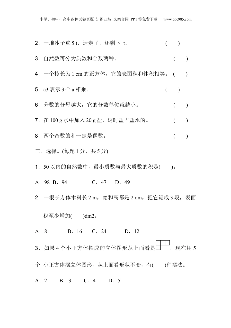 小学、初中、高中各种试卷真题知识归纳文案合同PPT等免费下载www.doc985.com期末检测卷(二)一、填空。(每空1分,共28分)1.钟表的分针从9到12,顺时针旋转()°;从7到11,顺时针旋转()°;从6开始,顺时针旋转120°正好到()。2.10以内既是奇数又是合数的数是(),既是偶数又是质数的数是()。20以内所有质数的和是()。3.已知a=2×2×3×5,b=2×5×7,a和b的最小公倍数是(),它们的最大公因数是()。4.用一根长3.6m的铁丝,做成一个长0.4m,宽0.3m的长方体框架,这个框架的高是()。5.分子是7的假分数有()个,其中最小的是()。6.由一些大小相同的小正方体组成的几何体,从上面看到(其中正方形中的数字表示在该位置上的小正方体的个数),则从正面看到的是()号图形,从右面看到的是()号图形。小学、初中、高中各种试卷真题知识归纳文案合同PPT等免费下载www.doc985.com7.把一根2m长的木料锯成同样长的5段,每段的长度是这根木料的(),每段长()m。8.与比较,()的分数值大,()的分数单位大。9.一个分数,分子比分母少10,约分后等于,这个分数是()。10.有8个羽毛球(外观完全相同),其中7个质量相同,另有1个次品略轻一些,至少称()次就一定能找出这个次品羽毛球。11.用3个棱长为1cm的正方体摆成一个长方体,这个长方体的体积是(),表面积是()。12.15秒=()分3.85m3=()dm34L40mL=()L13.==24÷()==()(填小数)。二、判断。(每题1分,共8分)1.小于而大于的分数只有一个。()小学、初中、高中各种试卷真题知识归纳文案合同PPT等免费下载www.doc985.com2.一堆沙子重5t,运走了,还剩下t。()3.自然数可分为质数和合数两种。()4.一个棱长为1cm的正方体,它的表面积和体积相等。()5.a3表示3个a相乘。()6.分数的分母越大,它的分数单位就越小。()7.在100g水中加入20g盐,这时盐占盐水的。()8.两个奇数的和一定是偶数。()三、选择。(每题1分,共5分)1.50以内的自然数中,最小质数与最大质数的积是()。A.98B.94C.47D.492.一根长方体木料长2m,宽和高都是2dm,把它锯成3段,表面积至少增加()dm2。A.8B.16C.24D.123.如果4个小正方体摆成的立体图形从上面看是,现在用5个小正方体摆立体图形,从上面看形状不变,有()种摆法。A.2B.3C.4D.5小学、初中、高中各种试卷真题知识归纳文案合同PPT等免费下载www.doc985.com4.一个正方体的底面周长是12cm,它的体积是()cm3。A.9B.27C.36D.725.两个质数的积一定是()。A.奇数B.偶数C.合数D.质数四、计算。(1题4分,2题12分,3题2分,共18分)1.直接写得数。+=-=+=1-=-=+=3--=++=2.计算下面各题,能简算的要简算。5--++-+++++-3.解方程。小学、初中、高中各种试卷真题知识归纳文案合同PPT等免费下载www.doc985.comx-=x+=五、实践与操作。(2题2分,其余每题6分,共14分)1.把下面这个展开图折成一个长方体(字母露在外面)。(1)如果A面在底部,那么()面在上面。(2)如果F面在前面,从左面看是B面,()面在上面。(3)测量有关数据(取整毫米数),算出它的表面积。2.画出梯形绕点O旋转后的图形。(1)顺时针旋转90°。小学、初中、高中各种试卷真题知识归纳文案合同PPT等免费下载www.doc985.com(2)逆时针旋转90°。3.兰兰和青青为了参加学校1分钟跳绳比赛,提前10天进行了训练,每天测试成绩如下统计图,请根据统计图,回答问题。(1)兰兰和青青第1天的成绩相差()下;第10天的成绩相差()下。(2)兰兰和青青跳绳的成绩呈现什么变化趋势?谁的进步幅度大?(3)请你预测一下,到了比赛时,谁的成绩可能会好些?简单说明理由。六.解决问题。(1~5题每题3分,其余每题6分,共27分)小学、初中、高中各种试卷真题知识归纳文案合同PPT等免费下载www.doc985.com1.挖一个长60m、宽30m、深2m的长方体水池,如果在水池的底面和侧面抹一层水泥,抹水泥的面积是多少平方米?2.一捆电线长5m,第一次用去全长的,第二次用去全长的,还剩下全长的几分之几?3.有一批煤,第一天用去t,第二天比第一天少用去t,两天一共用去多少吨煤?小学、初中、高中各种试卷真题知识归纳文案合同PPT等免费下载www.doc...