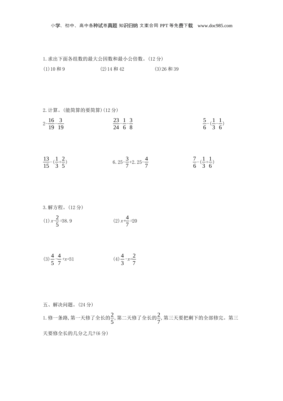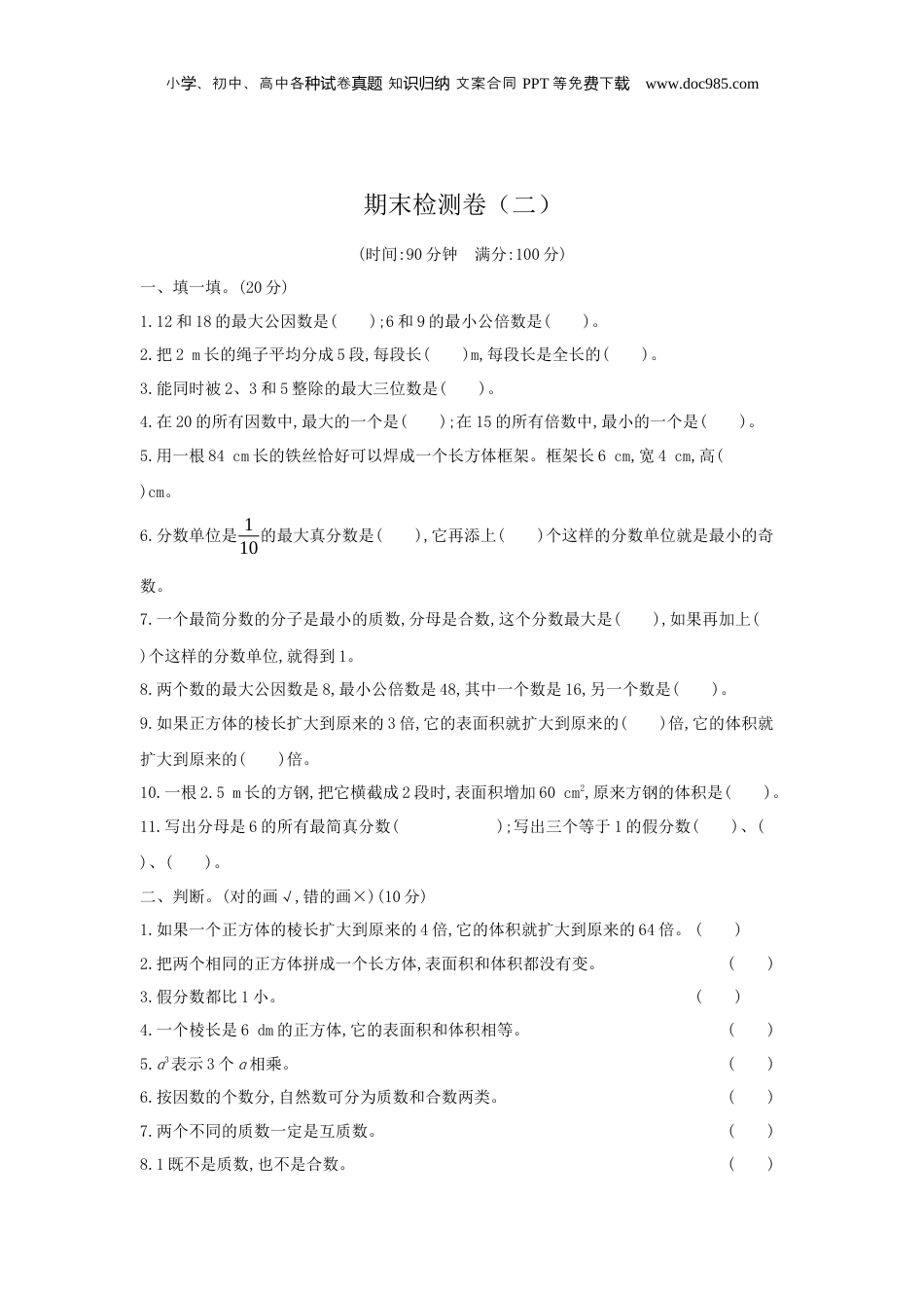 小、初中、高中各卷知文案合同学种试真题识归纳PPT等免下费载www.doc985.com期末检测卷(二)(时间:90分钟满分:100分)一、填一填。(20分)1.12和18的最大公因数是();6和9的最小公倍数是()。2.把2m长的绳子平均分成5段,每段长()m,每段长是全长的()。3.能同时被2、3和5整除的最大三位数是()。4.在20的所有因数中,最大的一个是();在15的所有倍数中,最小的一个是()。5.用一根84cm长的铁丝恰好可以焊成一个长方体框架。框架长6cm,宽4cm,高()cm。6.分数单位是110的最大真分数是(),它再添上()个这样的分数单位就是最小的奇数。7.一个最简分数的分子是最小的质数,分母是合数,这个分数最大是(),如果再加上()个这样的分数单位,就得到1。8.两个数的最大公因数是8,最小公倍数是48,其中一个数是16,另一个数是()。9.如果正方体的棱长扩大到原来的3倍,它的表面积就扩大到原来的()倍,它的体积就扩大到原来的()倍。10.一根2.5m长的方钢,把它横截成2段时,表面积增加60cm2,原来方钢的体积是()。11.写出分母是6的所有最简真分数();写出三个等于1的假分数()、()、()。二、判断。(对的画√,错的画×)(10分)1.如果一个正方体的棱长扩大到原来的4倍,它的体积就扩大到原来的64倍。()2.把两个相同的正方体拼成一个长方体,表面积和体积都没有变。()3.假分数都比1小。()4.一个棱长是6dm的正方体,它的表面积和体积相等。()5.ɑ3表示3个ɑ相乘。()6.按因数的个数分,自然数可分为质数和合数两类。()7.两个不同的质数一定是互质数。()8.1既不是质数,也不是合数。()小、初中、高中各卷知文案合同学种试真题识归纳PPT等免下费载www.doc985.com9.3m的14和1m的34同样长。()10.因为33,36,39,63,66,69,93,156这些数都能被3整除,所以个位上是3,6,9的数一定能被3整除。()三、选一选。(把正确答案的序号填在括号里)(10分)1.把一个棱长是4cm的正方体锯成棱长是1cm的小正方体,可锯成()个。A.4B.8C.642.把一张长24cm、宽18cm的长方形纸分成大小相等的小正方形,且没有剩余。最少可以分成()。A.12个B.15个C.9个3.两个数的最大公因数是4,最小公倍数是24,这两个数不可能是()。A.4和24B.8和12C.8和244.五(3)班有28名男生和25名女生,男生人数占全班人数的()。A.2825B.2528C.28535.一罐可乐的容量是()。A.350升B.3.5毫升C.350毫升6.两个质数相乘的积一定是()。A.质数B.奇数C.合数7.如果长方体的长、宽、高分别扩大到原来的3倍,它的体积就扩大到原来的()倍。A.3B.9C.278.当a等于()时,17a是质数。A.1B.17C.39.一个合数的因数有()。A.无数个B.2个C.3个或3个以上10.一个两位数,个位上的数字既是偶数又是质数,十位上的数字既不是质数也不是合数,则这个两位数是()。A.32B.16C.12四、按要求完成下面各题。(36分)小、初中、高中各卷知文案合同学种试真题识归纳PPT等免下费载www.doc985.com1.求出下面各组数的最大公因数和最小公倍数。(12分)(1)10和9(2)14和42(3)26和392.计算。(能简算的要简算)(12分)2-1619-3192324-16-3856-(13-16)1315-(13+25)6.25-37+2.25-4776-(13+16)3.解方程。(12分)(1)x-25=38.9(2)x+47=20(3)45-47+x=31(4)43-x=27五、解决问题。(24分)1.修一条路,第一天修了全长的25,第二天修了全长的27,第三天要把剩下的全部修完。第三天要修全长的几分之几?(6分)小、初中、高中各卷知文案合同学种试真题识归纳PPT等免下费载www.doc985.com2.甲、乙、丙三人到图书馆去借书,甲每6天去一次,乙每8天去一次,丙每12天去一次。如果4月1日他们三人在图书馆相遇,那么下一次都到图书馆借书是几月几日?(6分)3.有一个长30m、宽25m、深2m的水池,水面距池口0.5m,池内共有多少吨水?(每立方米的水重1t)(6分)4.家具厂购进400根方木,每根方木横截面的面积是0.24m2,长是4m。这些方木的体积是多少立方米?(6分)小、初中、高中各卷知文案合同学种试真题识归纳PPT等免下费载www.doc985.com参考答案一、1.6182.25153.9904.20155.116.91017.2978.249.92710.0.0075m3(或7.5dm3或7500cm3)11.16、56(答案不唯一)229966二、1.√2.3✕.4✕.5✕.√6.7✕.√8.√9.√10.✕三、1.C2.A3.C4.C5.C6.C7.C8.A9.C10.C四、1.(1)10和9的最大公因数是1,最小公倍数是90。(2)14和42的...