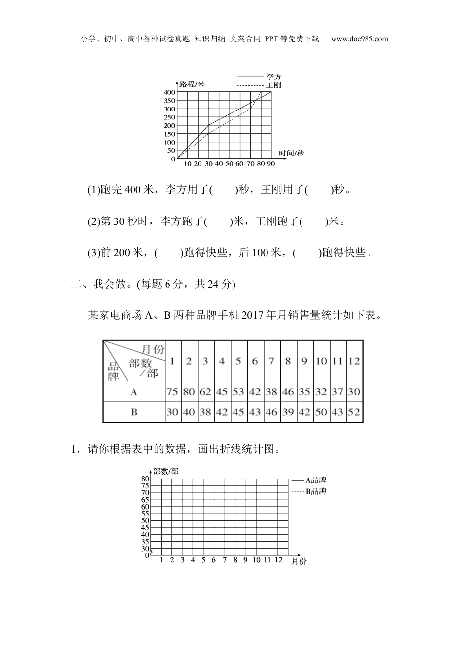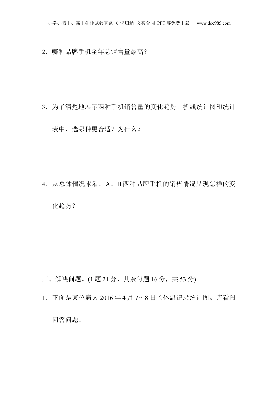 小学、初中、高中各种试卷真题知识归纳文案合同PPT等免费下载www.doc985.com材卷教过关(7)一、填空题。(每空1分,共23分)1.折线统计图不但能表示(),还能清楚地反映出数量的()变化趋势。2.下面是好运公司2016年各月利润情况折线统计图。(1)()月的利润最多,是()万元。(2)()月的利润最少,是()万元。(3)11月和12月的利润相差()万元。(4)()月到()月的利润持续上升,()月到()月的利润持续下降。(5)利润下降幅度最小的是()月到()月。(6)利润上升幅度最大的是()月到()月。(7)()月到()月的利润不低于40万元。3.下面是李方和王刚400米赛跑情况的折线统计图。小学、初中、高中各种试卷真题知识归纳文案合同PPT等免费下载www.doc985.com(1)跑完400米,李方用了()秒,王刚用了()秒。(2)第30秒时,李方跑了()米,王刚跑了()米。(3)前200米,()跑得快些,后100米,()跑得快些。二、我会做。(每题6分,共24分)某家电商场A、B两种品牌手机2017年月销售量统计如下表。1.请你根据表中的数据,画出折线统计图。小学、初中、高中各种试卷真题知识归纳文案合同PPT等免费下载www.doc985.com2.哪种品牌手机全年总销售量最高?3.为了清楚地展示两种手机销售量的变化趋势,折线统计图和统计表中,选哪种更合适?为什么?4.从总体情况来看,A、B两种品牌手机的销售情况呈现怎样的变化趋势?三、解决问题。(1题21分,其余每题16分,共53分)1.下面是某位病人2016年4月7~8日的体温记录统计图。请看图回答问题。小学、初中、高中各种试卷真题知识归纳文案合同PPT等免费下载www.doc985.com(1)这位病人的体温最高是多少摄氏度?最低是多少摄氏度?(2)他在4月7日18时的体温是多少摄氏度?(3)图中的虚线表示什么?(4)从体温上看,这位病人的病情是在恶化还是在好转?为什么?2.小强每年生日时都测量体重,下图是他8~14岁之间测量的体重小学、初中、高中各种试卷真题知识归纳文案合同PPT等免费下载www.doc985.com与全国同龄男生标准体重对比统计图。(1)小强的体重在哪岁至哪岁增长的幅度最大?(2)说一说小强的体重与标准体重之间的变化情况。(3)你对小强有何建议?3.下面两组数据分别用条形统计图还是折线统计图更合适?(1)妈妈记录了恬恬6~10岁的身高。(单位:厘米)小学、初中、高中各种试卷真题知识归纳文案合同PPT等免费下载www.doc985.com年龄678910身高116122135140144(2)篮球队5名队员的身高。(单位:厘米)姓名小康小浩小力小彬小凯身高145143148150146小学、初中、高中各种试卷真题知识归纳文案合同PPT等免费下载www.doc985.com答案一、1.数量的多少增减2.(1)1050(2)420(3)4(4)41014(5)34(6)89(7)8123.(1)9080(2)200150(3)李方王刚二、1.2.A品牌3.折线统计图。因为折线统计图能更清楚地反映数量的增减变化。4.A品牌的销售量在下降,而B品牌的销售量在上升。三、1.(1)39.5℃37℃(2)39℃小学、初中、高中各种试卷真题知识归纳文案合同PPT等免费下载www.doc985.com(3)正常体温(4)好转,他的体温接近正常体温。2.(1)13岁至14岁。(2)从偏瘦至偏胖。(3)少吃垃圾食品,多吃蔬菜多运动,不暴饮暴食。(答案不唯一,合理即可)3.(1)折线统计图(2)条形统计图