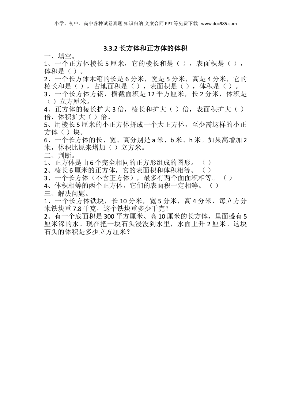 小学、初中、高中各种试卷真题知识归纳文案合同PPT等免费下载www.doc985.com3.3.2长方体和正方体的体积一、填空。1、一个正方体棱长5厘米,它的棱长和是(),表面积是(),体积是()。2、一个长方体木箱的长是6分米,宽是5分米,高是4分米,它的棱长和是(),占地面积是(),表面积是(),体积是()。3、一个长方体方钢,横截面积是12平方厘米,长2分米,体积是()立方厘米。4、正方体的棱长扩大3倍,棱长和扩大()倍,表面积扩大()倍,体积扩大()倍。5、用棱长5厘米的小正方体拼成一个大正方体,至少需这样的小正方体()块。6、一个长方体的长、宽、高分别是a米、b米、h米。如果高增加2米,体积比原来增加()立方米。二、判断。1、正方体是由6个完全相同的正方形组成的图形。()2、棱长6厘米的正方体,它的表面积和体积相等。()3、一个长方体(不含正方体),最多有两个面面积相等。()4、体积相等的两个正方体,它们的表面积一定相等。()三、解决问题。1、一个长方体铁块,长10分米,宽5分米,高4分米,每立方分米铁块重7.8千克,这个铁块重多少千克?2、有一个底面积是300平方厘米、高10厘米的长方体,里面盛有5厘米深的水。现在把一块石头浸没到水里,水面上升2厘米。这块石头的体积是多少立方厘米?小学、初中、高中各种试卷真题知识归纳文案合同PPT等免费下载www.doc985.com答案:一、1.60厘米、150平方厘米、125立方厘米2.60分米、30平方分米、148平方分米、120立方分米3.2404.3、9、275.1256.2ab二、√××√三、1、10×4×5×7.8=1560(千克)2、300×2=600(立方厘米)