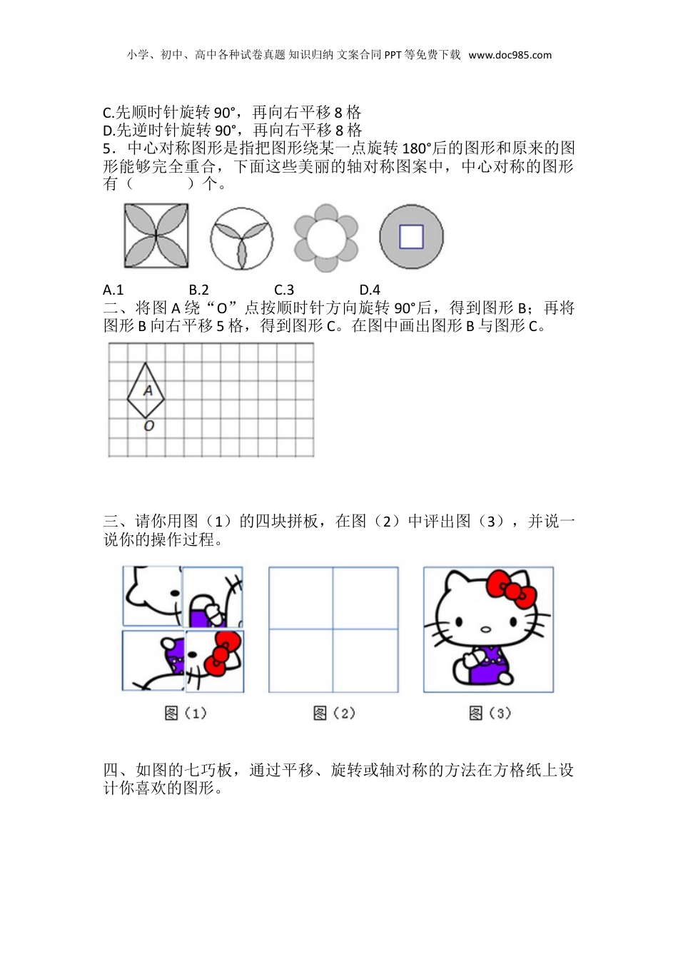 小学、初中、高中各种试卷真题知识归纳文案合同PPT等免费下载www.doc985.com5.1.2图形的运动一、选择。1.将下面的图案绕点“O”按顺时针方向旋转90°,得到的图案是()。2.将下列图形绕着各自的中心点旋转120°后,不能与原来的图形重合的是()。3.由图形(1)不能变为图形(2)的方法是()。A.图形(1)绕“O”点逆时针方向旋转90°得到图形(2)B.图形(1)绕“O”点顺时针方向旋转90°得到图形(2)C.图形(1)绕“O”点逆时针方向旋转270°得到图形(2)D.以线段OP所在的直线为对称轴画图形(1)的轴对称图形得到图形(2)4.观察下图,是怎样从图形A得到图形B的()。A.先顺时针旋转90°,再向右平移10格B.先逆时针旋转90°,再向右平移10格小学、初中、高中各种试卷真题知识归纳文案合同PPT等免费下载www.doc985.comC.先顺时针旋转90°,再向右平移8格D.先逆时针旋转90°,再向右平移8格5.中心对称图形是指把图形绕某一点旋转180°后的图形和原来的图形能够完全重合,下面这些美丽的轴对称图案中,中心对称的图形有()个。A.1B.2C.3D.4二、将图A绕“O”点按顺时针方向旋转90°后,得到图形B;再将图形B向右平移5格,得到图形C。在图中画出图形B与图形C。三、请你用图(1)的四块拼板,在图(2)中评出图(3),并说一说你的操作过程。四、如图的七巧板,通过平移、旋转或轴对称的方法在方格纸上设计你喜欢的图形。小学、初中、高中各种试卷真题知识归纳文案合同PPT等免费下载www.doc985.com答案:一、BCABC二、三、将图(1)中左上角的一块绕某一点顺时针旋转90°拼在图(2)的左上角;将图(1)中右上角的一块绕某一点按逆时针旋转90°拼在图(2)的左下角;将图(1)中左下角的一块绕某一点顺时针(或逆时针)旋转180°拼在图(2)的右下角;最后将图(1)中右小学、初中、高中各种试卷真题知识归纳文案合同PPT等免费下载www.doc985.com下角的一块绕某一点逆时针旋转90°拼在图(2)的右上角。四、该题为开放式答题,建议依据学生完成情况做出等级判定,举例如下。