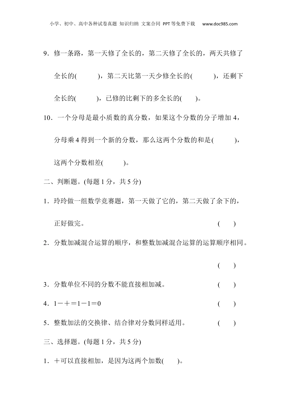 小学、初中、高中各种试卷真题知识归纳文案合同PPT等免费下载www.doc985.com第六元卷单达标测试一、填空题。(每空1分,共25分)1.5个与3个的和是()个,结果是()。2.计算+时,它们的()不同,也就是()不同,不能直接计算,要先(),再进行计算。3.在里填上适当的运算符号。====4.在里填上“>”“<”或“=”。+++--5.与的和减去它们的差,结果是()。6.()比米长米;千克比()多千克。7.一根绳子长米,比另一根短米,两根绳子共长()米。8.一袋大米有50千克,用去了总数的,还剩下这袋大米的();如果吃了千克,还剩下()千克;如果吃了15千克,吃了这袋大米的()。小学、初中、高中各种试卷真题知识归纳文案合同PPT等免费下载www.doc985.com9.修一条路,第一天修了全长的,第二天修了全长的,两天共修了全长的(),第二天比第一天少修全长的(),还剩下全长的(),已修的比剩下的多全长的()。10.一个分母是最小质数的真分数,如果这个分数的分子增加4,分母乘4得到一个新的分数,那么这两个分数的和是(),这两个分数相差()。二、判断题。(每题1分,共5分)1.玲玲做一组数学竞赛题,第一天做了它的,第二天做了余下的,正好做完。()2.分数加减混合运算的顺序,和整数加减混合运算的运算顺序相同。()3.分数单位不同的分数不能直接相加减。()4.1-+=1-1=0()5.整数加法的交换律、结合律对分数同样适用。()三、选择题。(每题1分,共5分)1.+可以直接相加,是因为这两个加数()。小学、初中、高中各种试卷真题知识归纳文案合同PPT等免费下载www.doc985.comA.分子相同B.分母相同C.都是真分数D.都是最简分数2.5与2的和减去它们的差,结果是多少?正确的算式是()。A.5+2-5-2B.5-2+5-2C.5+2-D.5+2+3.++=+,运用了()。A.加法交换律B.加法结合律C.加法交换律和结合律4.小明做数学作业用了小时,比做语文作业多用小时,他做完这两种作业一共用了多长时间?列式正确的是()。A.-B.-+C.+D.++5.有两袋饼干,第一袋增加千克,第二袋增加千克后,两袋饼干的重量相同,则原来两袋饼干的重量相比,()。A.第一袋重B.第二袋重C.一样重D.无法比较小学、初中、高中各种试卷真题知识归纳文案合同PPT等免费下载www.doc985.com四、计算。(1题4分,2题12分,3题9分,共25分)1.直接写得数。+=+=-=+=-=2+=++=1--=2.计算下列各题,能简算的要简算。-+-++-+--+3.解方程。x-=x+-=+x-=小学、初中、高中各种试卷真题知识归纳文案合同PPT等免费下载www.doc985.com五、计算下列各题。(6分)+-+-+---六、小红喝一小杯蜂蜜水,分四次喝完。第一次喝了这杯蜂蜜水的,觉得太甜了就加满了水;第二次喝了这杯蜂蜜水的,还是觉得甜再一次加满了水;第三次喝了半杯后去看了会儿电视,奶奶看到只有半杯水了就又给她加满了;最后一次小红把整杯水都喝完了。请你分析:小红喝的蜂蜜水多还是后来加入的水多?你是怎样想的?(4分)小学、初中、高中各种试卷真题知识归纳文案合同PPT等免费下载www.doc985.com七、解决问题。(1、2题每题7分,其余每题8分,共30分)1.万家水果批发市场第一天卖出水果吨,比第二天多卖出吨。第二天卖出水果多少吨?两天共卖出水果多少吨?2.(变式题)学校组织五、六年级师生去参观科技馆,往返共用了2小时,其中路上用去了全部时间的,科技辅导员集中讲解用去了全部时间的,其余时间学生自由活动,学生自由活动时间占全部时间的几分之几?3.有一块地,用总面积的种桃树,种苹果树,其余种梨树。种梨树小学、初中、高中各种试卷真题知识归纳文案合同PPT等免费下载www.doc985.com的面积占总面积的几分之几?要使每种果树栽种的面积相同,那么桃树要少种总面积的几分之几?4.(变式题)某修路队第一天修路千米,比第二天多修千米,第三天比第一天少修了千米。三天一共修路多少千米?答案一、1.82.分母分数单位通分3.+-+-4.=><5.6.7.8.49小学、初中、高中各种试卷真题知识归纳文案合同PPT等免费下载www.doc985.com9.10.二、1.×2.√3.√4.×5.√三、1.B2.C3.C4.B5.B四、1...