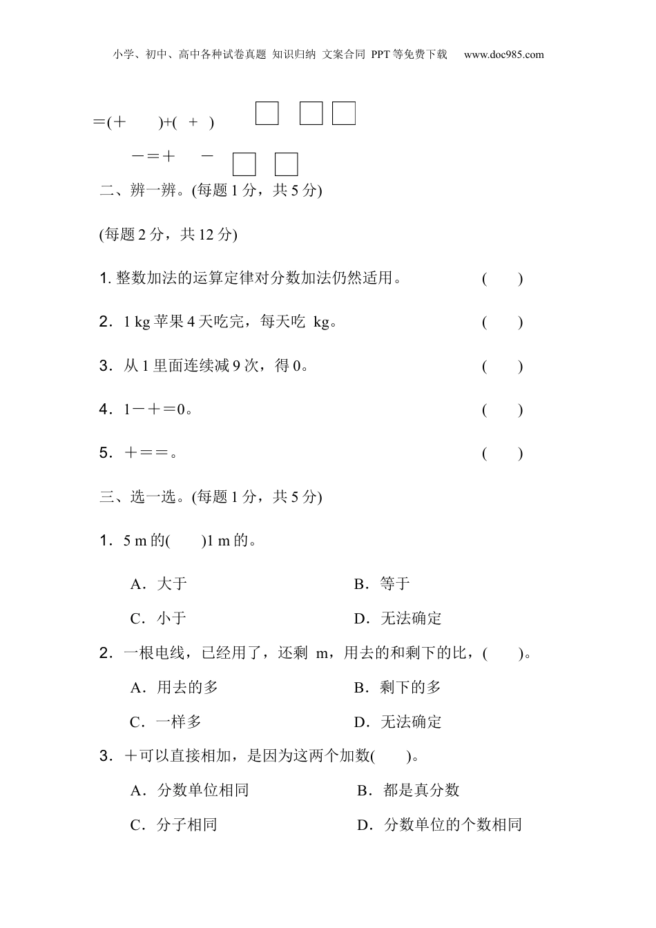 小学、初中、高中各种试卷真题知识归纳文案合同PPT等免费下载www.doc985.com第六单元过关检测卷一、填一填。(每空1分,共27分)1.-表示()个()减去()个(),得()个(),也就是()。2.比m短m是()m,m比()m多m。3.分数单位是的所有最简真分数的和是()。4.与的和是(),差是()。5.分母是5的最小假分数与最大真分数的差是()。6.1里面有()个,再加上()个这样的分数单位就是最小的质数。7.6个加上()个就是1。8.计算+要先(),结果是()。9.在里填上“>”“<”或“=”。+--+++10.+++小学、初中、高中各种试卷真题知识归纳文案合同PPT等免费下载www.doc985.com=(+)+(+)-=+-二、辨一辨。(每题1分,共5分)(每题2分,共12分)1.整数加法的运算定律对分数加法仍然适用。()2.1kg苹果4天吃完,每天吃kg。()3.从1里面连续减9次,得0。()4.1-+=0。()5.+==。()三、选一选。(每题1分,共5分)1.5m的()1m的。A.大于B.等于C.小于D.无法确定2.一根电线,已经用了,还剩m,用去的和剩下的比,()。A.用去的多B.剩下的多C.一样多D.无法确定3.+可以直接相加,是因为这两个加数()。A.分数单位相同B.都是真分数C.分子相同D.分数单位的个数相同小学、初中、高中各种试卷真题知识归纳文案合同PPT等免费下载www.doc985.com4.与的和减去它们的差,结果是多少?正确的算式是()。A.+--B.-+-C.+-D.--+5.从3里面连续减去()个,最后得1。A.3B.5C.10D.15四、算一算。(1题9分,2题12分,3题8分,共29分)1.直接写得数。+=-=-=+=+=-=-=1-=+=2.计算下面各题,能简算的要简算。+-2---+--++3.解方程。小学、初中、高中各种试卷真题知识归纳文案合同PPT等免费下载www.doc985.comx+=x-=x+=1x-=五、解决问题。(每题5分,共30分)1.明明喝了一杯橙汁的,加满温开水,然后喝了一杯的,再加满温开水,又喝了一杯的后,继续加满温开水,最后把这一杯喝完了。明明喝的橙汁和温开水各有多少杯?2.绿化公园,规划种花km2,植树km2,植树的面积比种草的面积少km2,规划的绿化面积有多少平方千米?小学、初中、高中各种试卷真题知识归纳文案合同PPT等免费下载www.doc985.com3.贝贝和甜甜计划折60只千纸鹤,结果贝贝完成了全部任务的,甜甜折了45只。这样,两人实际完成了计划的几分之几?4.仓库原有一批货物,运走t后,又运进t,这时共有货物t。仓库原有货物多少吨?5.小星看一本书,计划三天看完。第一天看了这本书的,第二天看了这本书的,第三天应看多少?三天中哪天看的页数最多?小学、初中、高中各种试卷真题知识归纳文案合同PPT等免费下载www.doc985.com6.一桶油,连桶共重kg,倒出一半油后,连桶共重kg,桶重多少千克?六、请将,,,,和填在中,使每条线上的三个数的和都相等。(4分)小学、初中、高中各种试卷真题知识归纳文案合同PPT等免费下载www.doc985.com答案一、1.5142.3.24.5.6.1397.118.通分9.<=>=10.二、1.√2.×3.√4.×5.×三、1.B2.A3.A4.C5.C四、1.2.1133.x=x=x=x=五、1.橙汁:1杯温开水:++=(杯)2.++=1(km2)3.45÷60+=4.-+=(t)5.1--=>>第一天看的页数最多6.+-=(kg)小学、初中、高中各种试卷真题知识归纳文案合同PPT等免费下载www.doc985.com六、点播:答案不唯一