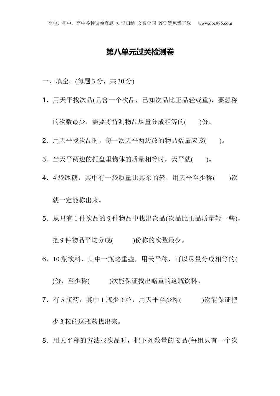 小学、初中、高中各种试卷真题知识归纳文案合同PPT等免费下载www.doc985.com第八单元过关检测卷一、填空。(每题3分,共30分)1.用天平找次品(只含一个次品,已知次品比正品轻或重),要想称的次数最少,需要将待测物品尽量分成相等的()份。2.用天平找次品时,每一次天平两边放的物品数量应该()。3.当天平两边的托盘里物体的质量相等时,天平就()。4.4袋冰糖,其中有一袋质量比其余的轻,用天平至少称()次就一定能称出来。5.从只有1件次品的9件物品中找出次品(次品比正品质量轻一些),把9件物品平均分成()份称的次数最少。6.10瓶饮料,其中一瓶略重些,用天平称,可以尽量分成相等的()份,至少称()次能保证找出略重的这瓶饮料。7.有5瓶药,其中1瓶少3粒,用天平至少称()次能保证把少3粒的这瓶药找出来。8.用天平称的方法找次品时,把下列数量的物品(每组只有一个次小学、初中、高中各种试卷真题知识归纳文案合同PPT等免费下载www.doc985.com品,次品比正品轻一些)分成3份,怎样分称的次数最少?9.有外观相同的12瓶矿泉水和1瓶盐水,盐水比矿泉水稍重一些,至少称()次能保证找出这瓶盐水。10.一次偶然的机会,小蕾从她的朋友那里得到八枚外表一模一样的1元硬币。但是其中有一枚是假的,质量轻一些。于是她找来一架天平,想用它找出那枚假的硬币。想一想,小蕾最少需要用天平称()次,才能保证找出那枚假的硬币。二、妈妈买了7袋盐,其中6袋质量相同,另有1袋是次品,稍微轻一些,妈妈设计了用天平找次品的方案,请你帮她填完整。(20分)小学、初中、高中各种试卷真题知识归纳文案合同PPT等免费下载www.doc985.com三、有8袋洗衣粉,其中7袋质量相同,另有1袋质量不足,是次品,怎样用天平找出这袋质量不足的洗衣粉?请你将下表补充完整。(10分)四、走进生活。(每题8分,共40分)1.有10瓶同样的水,小红往其中的一瓶中加了一些糖,如果用天平称,那么至少称几次就能保证找出那瓶加糖的水?请绘图表示你称的过程。小学、初中、高中各种试卷真题知识归纳文案合同PPT等免费下载www.doc985.com2.一箱橘子有11袋,其中10袋质量相同,另外1袋质量轻一些,用天平至少称几次能保证找出这袋橘子来?请画图表示。3.有9颗珍珠,其中有1颗是假的,质量比真的略轻,现有一台天平,只称2次,你能把假珍珠找出来吗?请画图表示。小学、初中、高中各种试卷真题知识归纳文案合同PPT等免费下载www.doc985.com4.有3包糖果,其中有2包都是1kg,另1包是次品,可能比1kg重,也可能比1kg轻,你用天平至少称几次能保证找出来?说说你称量的方法。5.一箱巧克力有16盒,其中15盒质量相同,另有1盒质量轻一些。利用天平称,至少称几次能保证找出这盒巧克力?请用图示法表示你称的过程。小学、初中、高中各种试卷真题知识归纳文案合同PPT等免费下载www.doc985.com小学、初中、高中各种试卷真题知识归纳文案合同PPT等免费下载www.doc985.com答案一、1.32.相等3.平衡4.25.36.337.28.2233344449.310.2二、三、23四、1.2.3.称2次能找出假珍珠小学、初中、高中各种试卷真题知识归纳文案合同PPT等免费下载www.doc985.com4.至少称两次,能保证找出来。先称两个1包,如果平衡,那个没称的1包就是次品,如果不平衡,可以把其中一包拿下来,把旁边的一包放上去,如果平衡,则拿下的是次品,如果不平衡,一直没动的那一包是次品。5.