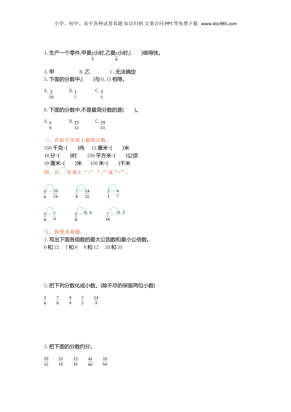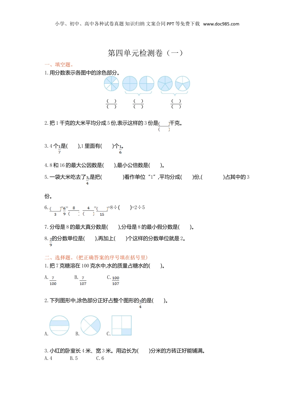 小学、初中、高中各种试卷真题知识归纳文案合同PPT等免费下载www.doc985.com第四单元检测卷(一)一、填空题。1.用分数表示各图中的涂色部分。2.把1千克的大米平均分成5份,表示这样的3份是千克。3.4个是(),1里面有()个。4.8和16的最大公因数是(),最小公倍数是()。5.一袋大米吃去了,是把()看作单位“1”,平均分成()份,()占其中的3份。6.====8÷()=2÷57.分母是8的最大真分数是(),分母是8的最小假分数是()。8.的分数单位是(),再加上()个这样的分数单位就是2。二、选择题。(把正确答案的序号填在括号里)1.把7克糖溶在100克水中,水的质量占糖水的()。A.B.C.2.下列图形中,涂色部分正好占整个图形的的是()。A.B.C.3.小红的卧室长4米、宽3米。用边长为()分米的方砖正好能铺满。A.4B.5C.6小学、初中、高中各种试卷真题知识归纳文案合同PPT等免费下载www.doc985.com4.生产一个零件,甲要小时,乙要小时,()做得快。A.甲B.乙C.无法确定5.下面的分数中,()与0.15相等。A.B.C.6.下面的分数中,不是最简分数的是()。A.B.C.三、在括号里填上最简分数。350千克=()吨15厘米=()米48分=()时250平方米=()公顷30厘米=()米450米=()千米四、在里填上“>”“<”或“=”。0.60.5五、按要求做题。1.写出下面各组数的最大公因数和最小公倍数。6和127和88和1220和352.把下列分数化成小数。(除不尽的保留两位小数)3.把下面的分数约分。小学、初中、高中各种试卷真题知识归纳文案合同PPT等免费下载www.doc985.com六、操作题。1.涂色表示出这个大长方形的。2.在直线上描出表示下面各分数的点。七、解决问题。1.爸爸买了一个西瓜,弟弟吃了这个西瓜的,哥哥吃了这个西瓜的。兄弟俩谁吃得多?2.用200千克黄豆可以榨油26千克,平均1千克黄豆可以榨油多少千克?榨1千克油需要多少千克黄豆?3.洗衣机厂6月份一共生产洗衣机3600台,其中全自动洗衣机3000台,其余的是普通洗衣机。普通洗衣机占全部洗衣机的几分之几?小学、初中、高中各种试卷真题知识归纳文案合同PPT等免费下载www.doc985.com4.需要录入一篇文稿,小芹1.3小时打完,小梅小时打完。谁的打字速度要快一些?5.有两根彩带(如下图),要把它们剪成同样长的小段,而且无剩余,每小段最长是多少分米?6.如果这个家庭的老鼠总数不超过30只,那么这些老鼠一共有多少只?小学、初中、高中各种试卷真题知识归纳文案合同PPT等免费下载www.doc985.com参考答案一、1.2.3.64.8165.这袋大米4吃掉的部分6.212106207.8.16二、1.C2.B3.B4.A5.A6.C三、四、=<>>><五、1.61215642451402.0.170.8750.443.54.673.六、1.提示:涂5个小正方形。(涂色略)2.略七、1.>,弟弟吃得多。2.26÷200=(千克)200÷26=(千克)3.3600-3000=600(台)600÷3600=4.1.3<,所以小芹的打字速度要快一些。5.12和20的最大公因数是4,所以每小段最长是4分米。6.18只
