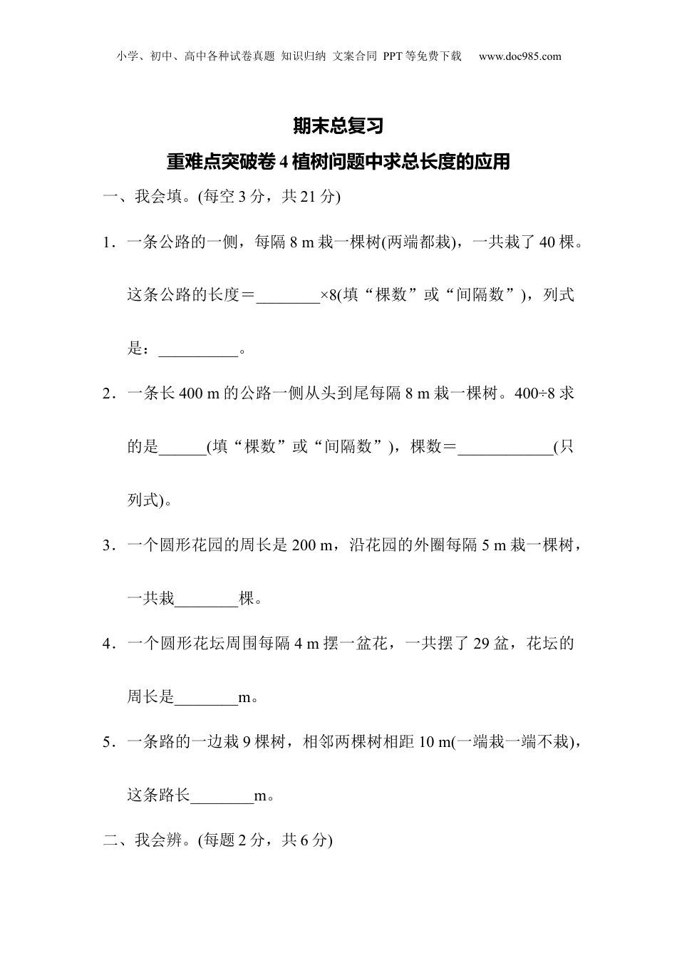 小学、初中、高中各种试卷真题知识归纳文案合同PPT等免费下载www.doc985.com期末总复习重难点突破卷4植树问题中求总长度的应用一、我会填。(每空3分,共21分)1.一条公路的一侧,每隔8m栽一棵树(两端都栽),一共栽了40棵。这条公路的长度=________×8(填“棵数”或“间隔数”),列式是:__________。2.一条长400m的公路一侧从头到尾每隔8m栽一棵树。400÷8求的是______(填“棵数”或“间隔数”),棵数=____________(只列式)。3.一个圆形花园的周长是200m,沿花园的外圈每隔5m栽一棵树,一共栽________棵。4.一个圆形花坛周围每隔4m摆一盆花,一共摆了29盆,花坛的周长是________m。5.一条路的一边栽9棵树,相邻两棵树相距10m(一端栽一端不栽),这条路长________m。二、我会辨。(每题2分,共6分)小学、初中、高中各种试卷真题知识归纳文案合同PPT等免费下载www.doc985.com1.植树问题中,间隔数总比棵数少1。()2.封闭图形的周长=间隔数×棵数。()3.锯木头,木头的长度=锯的次数×每段的长度。()三、我会选。(每题3分,共15分)1.在两座高楼之间的笔直公路的一侧种12棵银杏树,相邻两棵银杏树之间相距10m,这条公路长多少米(两端都不栽)?正确列式是()。A.12×10B.(12-1)×10C.(12+1)×10D.12×(10-1)2.两座高楼之间笔直的公路长300m,相邻两棵树之间相距5m(两端都不栽),一共可以栽多少棵树?正确列式是()。A.300÷5+1B.300÷5-1C.300÷5D.300÷(5+1)3.一根木头把它平均锯成了5段,每段长4米,这根木头长多少米?正确列式是()。A.5×4B.(5+1)×4小学、初中、高中各种试卷真题知识归纳文案合同PPT等免费下载www.doc985.comC.(5-1)×4D.5×(4-1)4.一个正方形花坛的四周一共摆了30盆菊花(四个顶点都摆),相邻两盆菊花相隔6米,求这个正方形一周的长度,列式是()。A.(30-4)×6B.(30+4)×6C.(30+1)×6D.30×65.一条路沿一边种了9棵树,相邻两棵树之间的距离是5m,这条路最短是()m。A.35B.40C.45D.50四、对比练习。(共22分)1.路长。(每题5分,共10分)(1)在一条马路的一侧每隔5m栽一棵桂花树(两端都栽),一共栽了小学、初中、高中各种试卷真题知识归纳文案合同PPT等免费下载www.doc985.com40棵树,这条马路长多少米?(2)在一条马路的两侧每隔5m栽一棵桂花树(两端都栽),一共栽了40棵树,这条马路长多少米?2.锯木头。(每题6分,共12分)(1)木工师傅要把一根木头平均锯成8段,每锯一次需要5分钟,锯完一共需要多少分钟?(2)木工师傅锯一根木头,一共锯了8次,每段木头长6dm,这根木头长多少米?小学、初中、高中各种试卷真题知识归纳文案合同PPT等免费下载www.doc985.com五、我会应用。(每题9分,共36分)1.同学们测量一条路的长度,先立了一根标杆,然后每隔30米立一根标杆。当立到12根标杆时,第1根与第12根之间相距多少米?2.小亮爬楼梯,他从1楼到3楼用了48秒。用同样的速度,他从1楼到6楼要用多少秒?3.林荫大道两侧从头到尾栽树,一侧栽杨树91棵,每相邻两棵杨树之间相距10m;另一侧栽柳树,每相邻两棵柳树之间相距9m。栽柳树多少棵?小学、初中、高中各种试卷真题知识归纳文案合同PPT等免费下载www.doc985.com4.建筑工程队要盖一栋楼,需要在长120m、宽60m的长方形地基的四周打桩,四个角上都要打,每隔3m打一根桩,这栋楼地基的四周要打多少根桩?小学、初中、高中各种试卷真题知识归纳文案合同PPT等免费下载www.doc985.com答案一、1.间隔数(40-1)×82.间隔数400÷8+13.404.1165.90二、1.×2.×3.×三、1.C2.B3.A4.D5.B四、1.(1)(40-1)×5=195(m)答:这条马路长195m。(2)40÷2=20(棵)(20-1)×5=95(m)答:这条马路长95m。[点拨](马路一侧栽树的棵数(两端都栽)-1)×每个间隔长度求出的是第一棵与最后一棵相距多少米,也是这条马路的长度。2.(1)(8-1)×5=35(分钟)答:锯完一共需要35分钟。[点拨]把一根木头平均锯成8段,共锯了8-1=7(次);每锯一次需要5分钟,求锯完一共需要的时间,列式计算为5×7=35(分钟)。(2)(8+1)×6=54(dm)=5.4m答:这根木头长5.4m。[点拨]把一根木头一共锯了8次,共锯成8+1=9(段),每段...